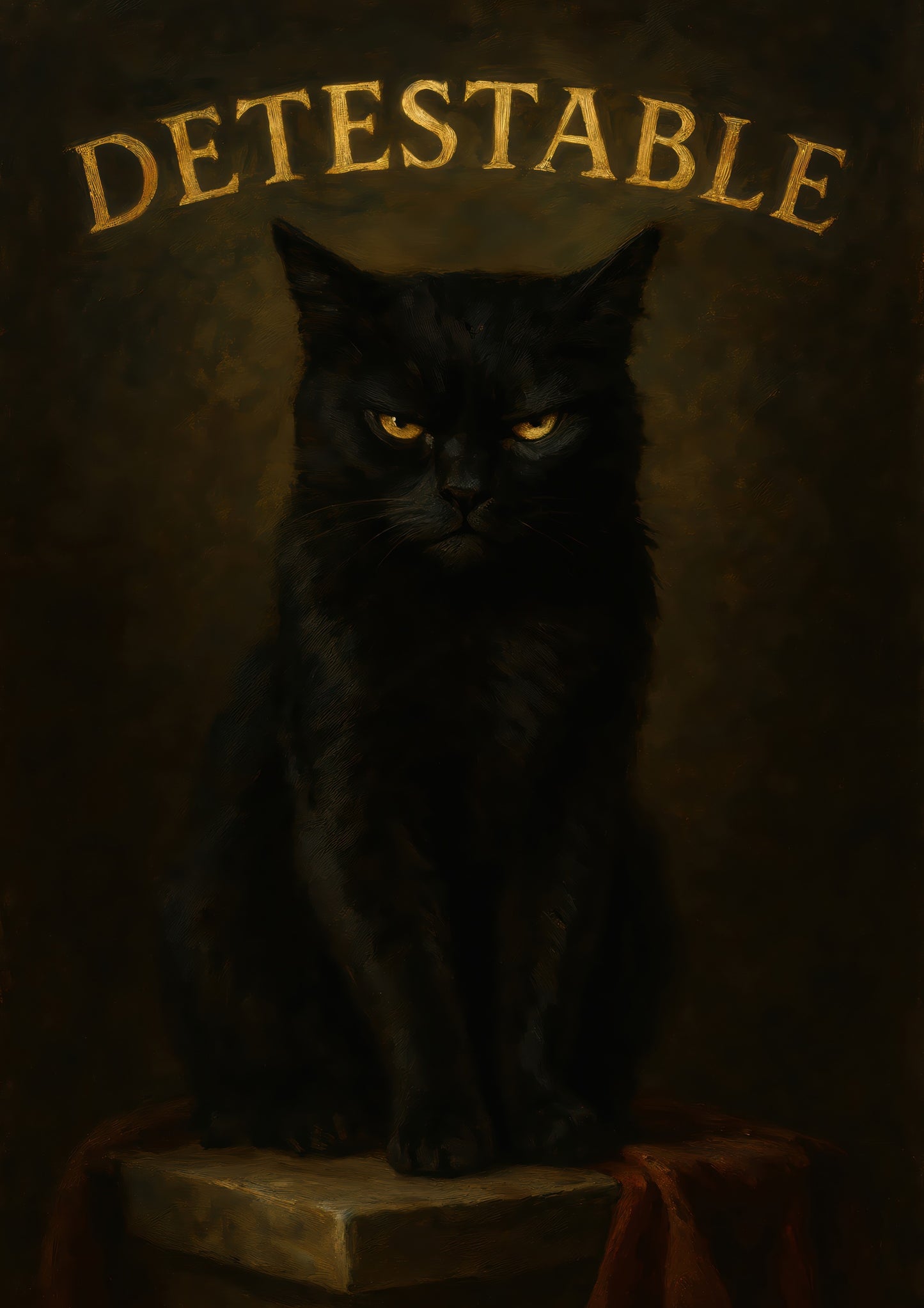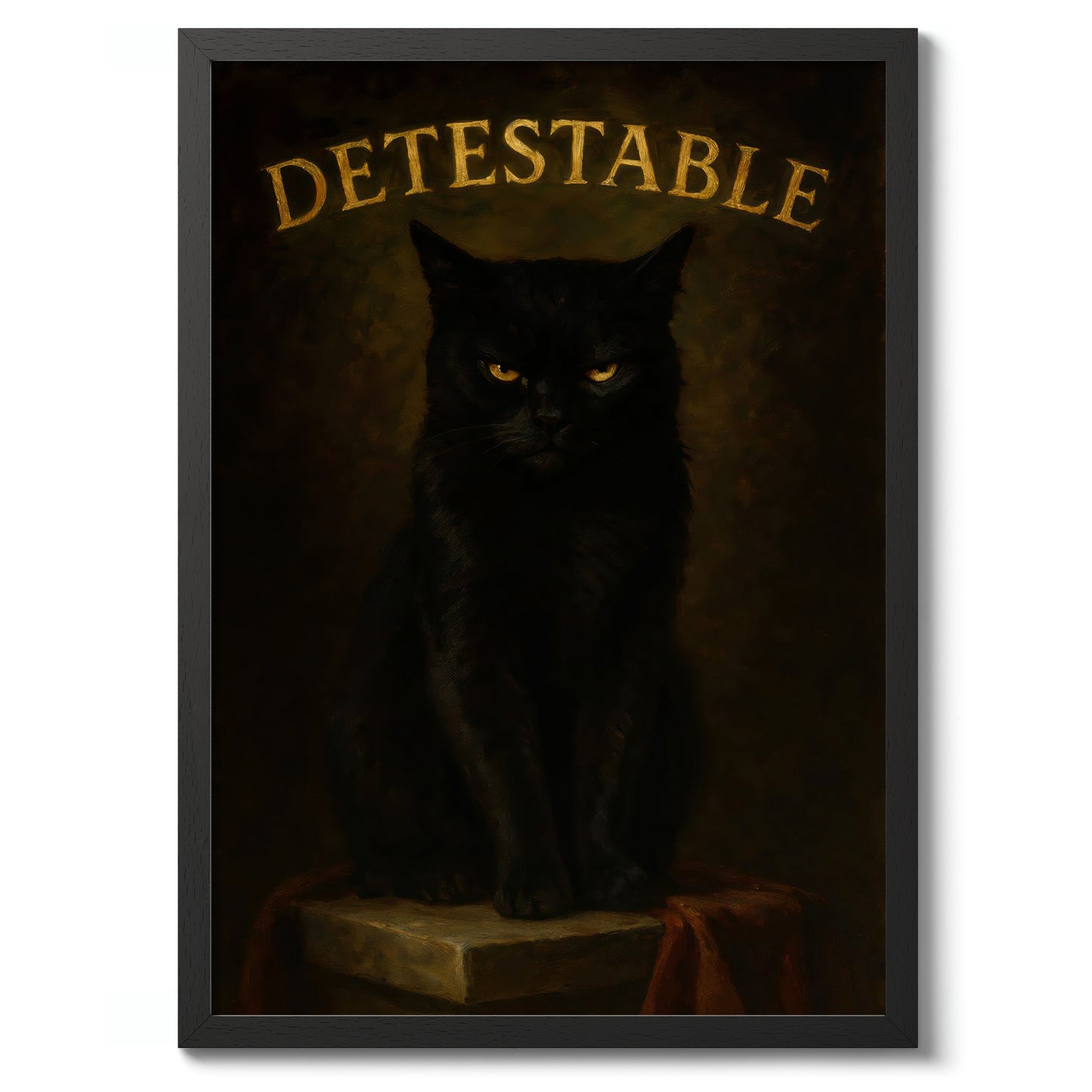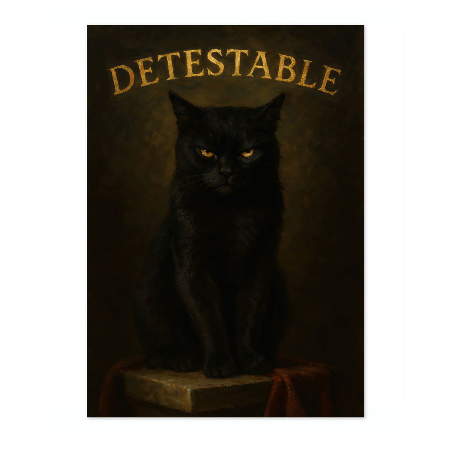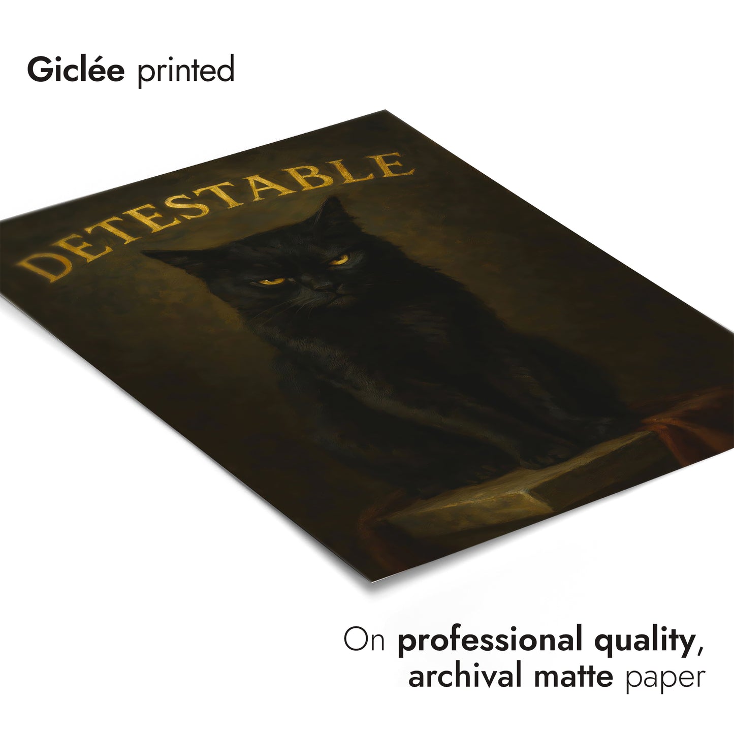 This "Detestable" poster features a brooding black cat against a dark, textured background. The cat’s intense stare captures the viewer’s attention, while bold, gold typography highlights the word “Detestable” above. This striking illustration combines humor with a gothic aesthetic, making it an intriguing piece for cat lovers and enthusiasts of typographic art. Perfect for adding character to any space.