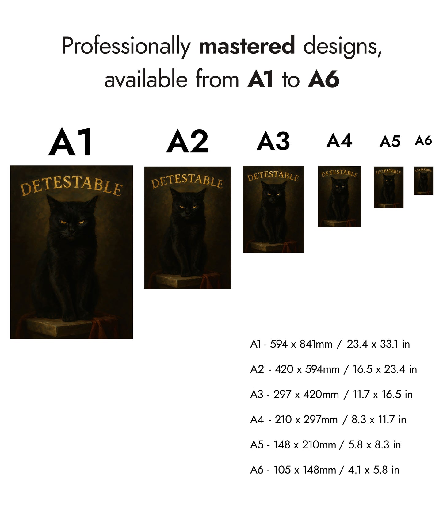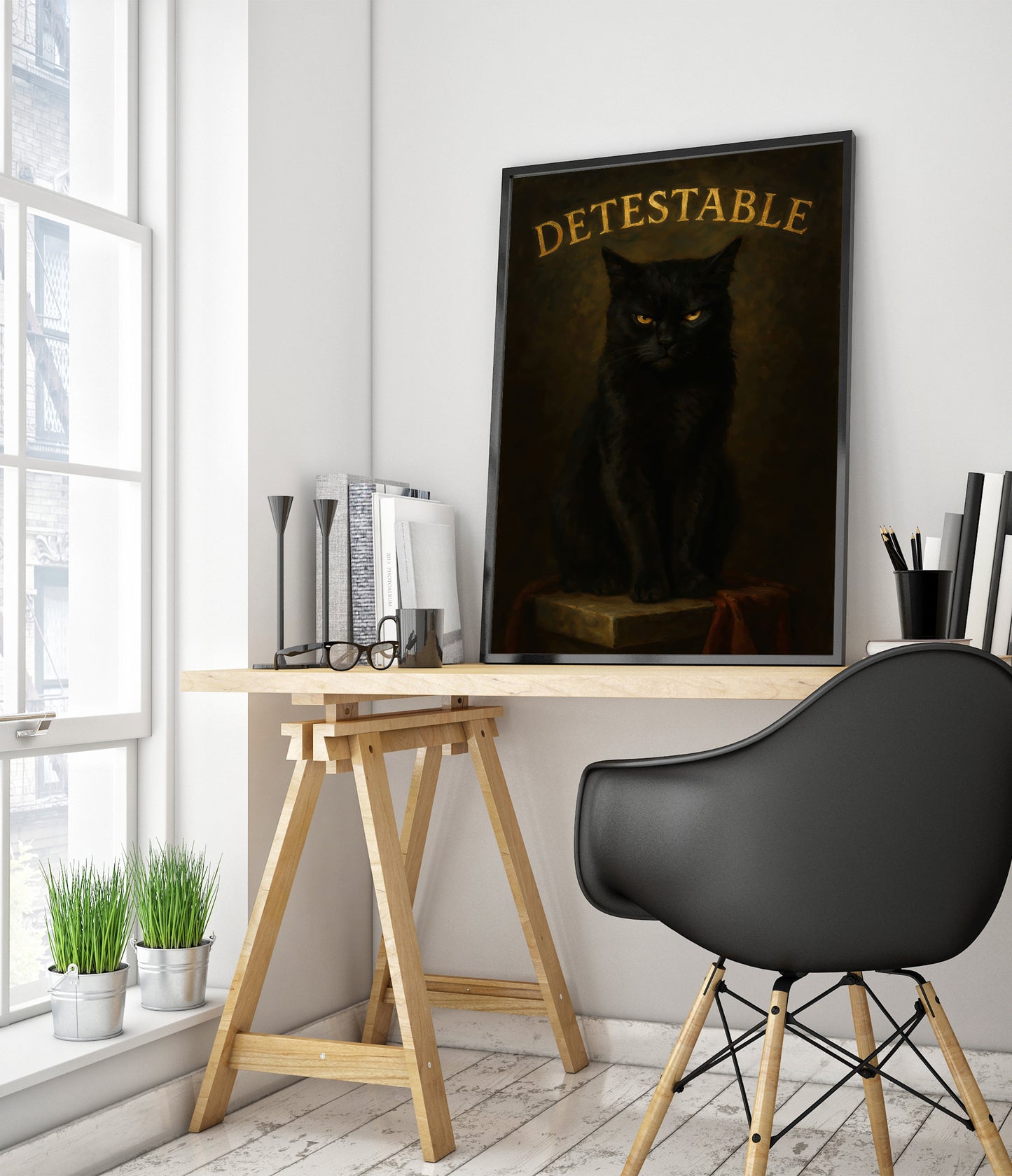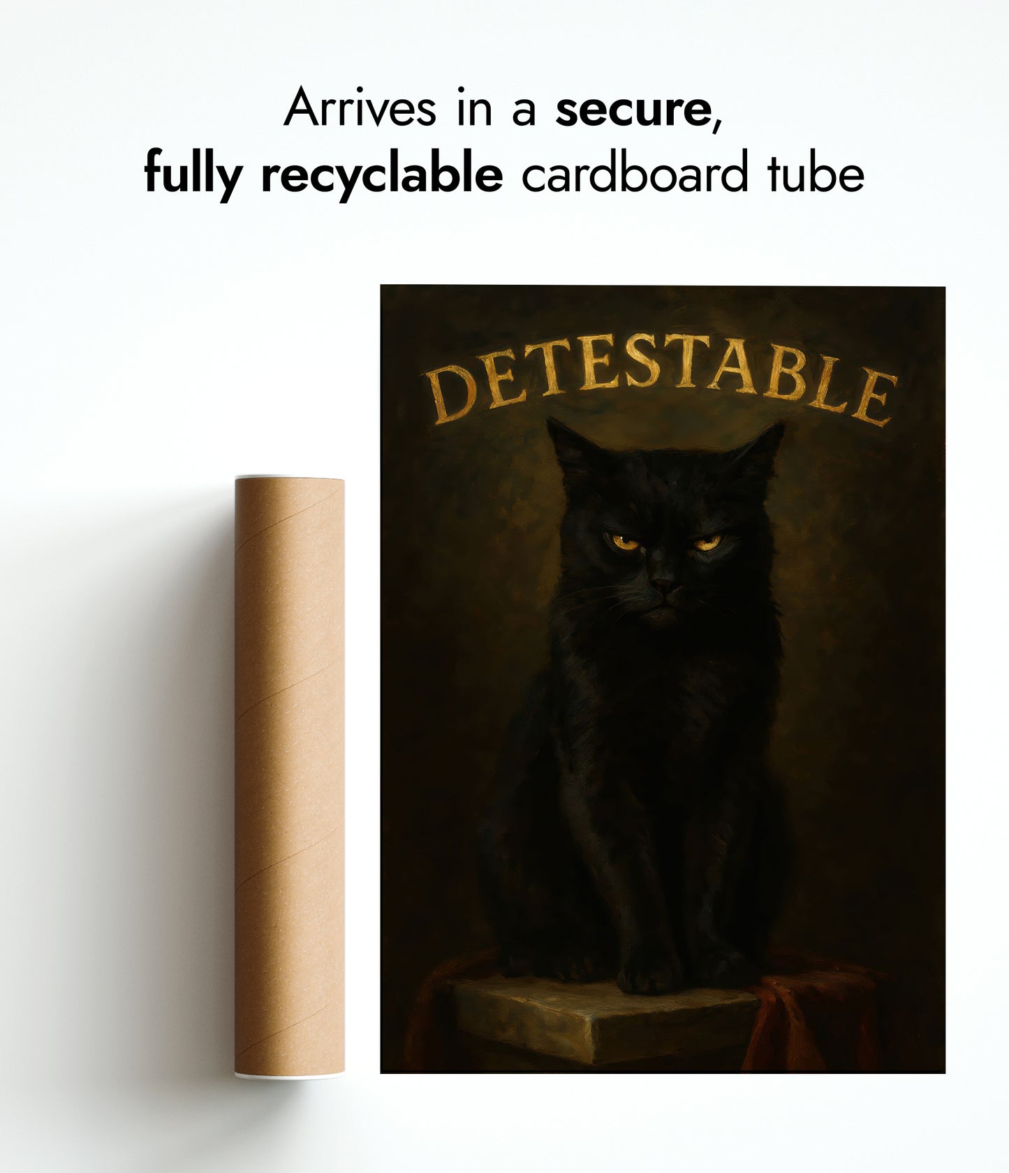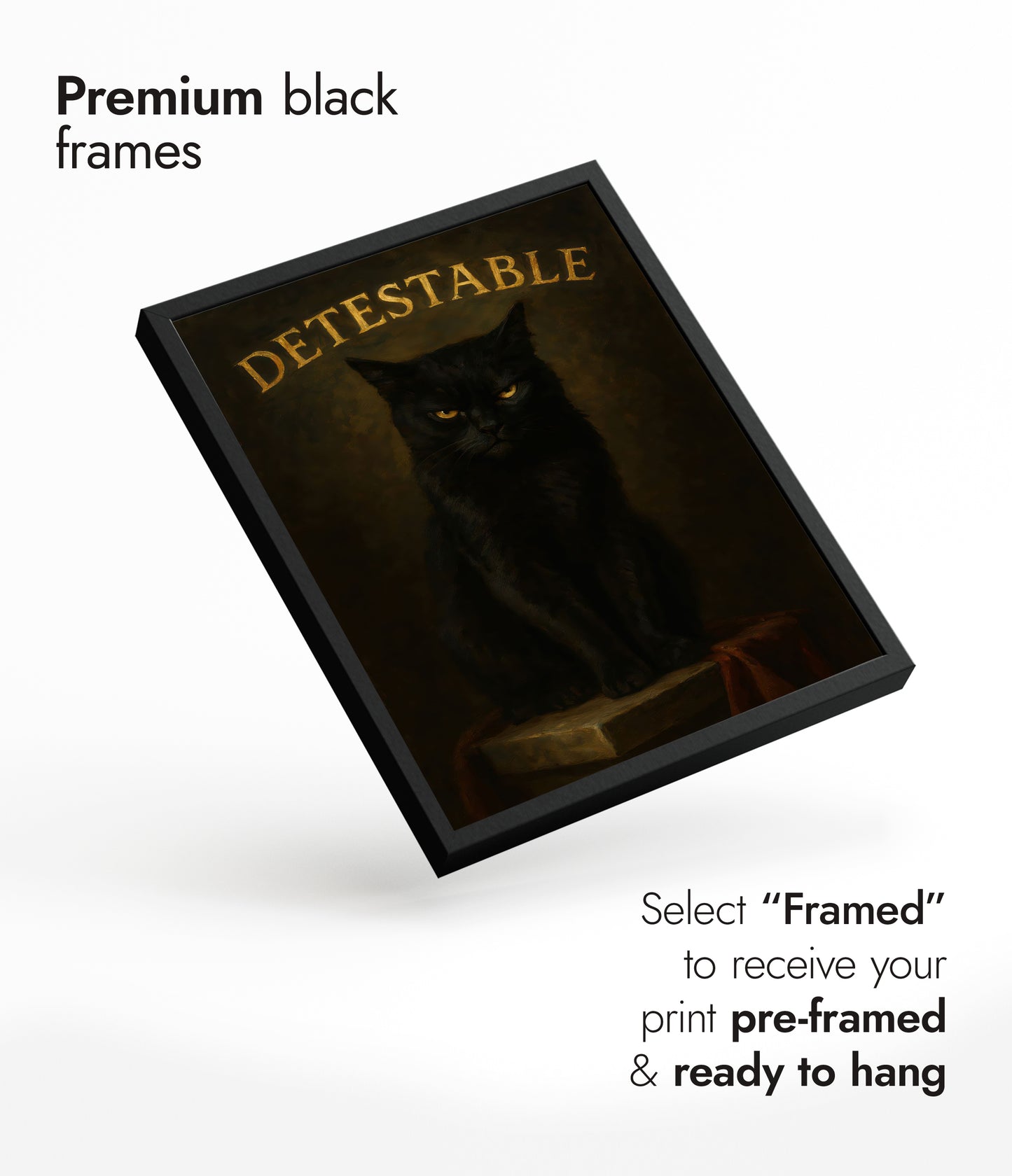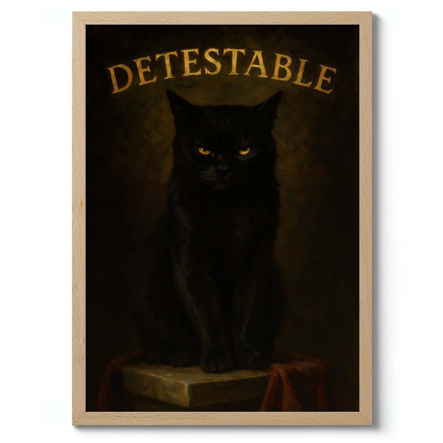 This "Detestable" poster features a brooding black cat against a dark, textured background. The cat’s intense stare captures the viewer’s attention, while bold, gold typography highlights the word “Detestable” above. This striking illustration combines humor with a gothic aesthetic, making it an intriguing piece for cat lovers and enthusiasts of typographic art. Perfect for adding character to any space.