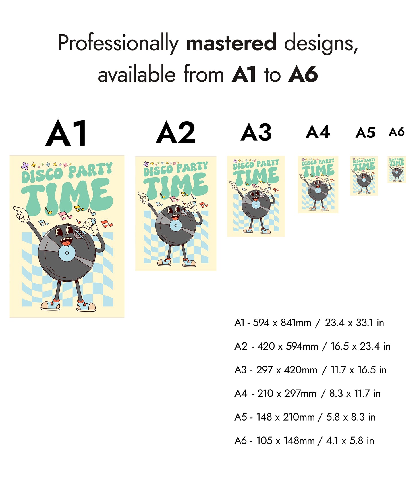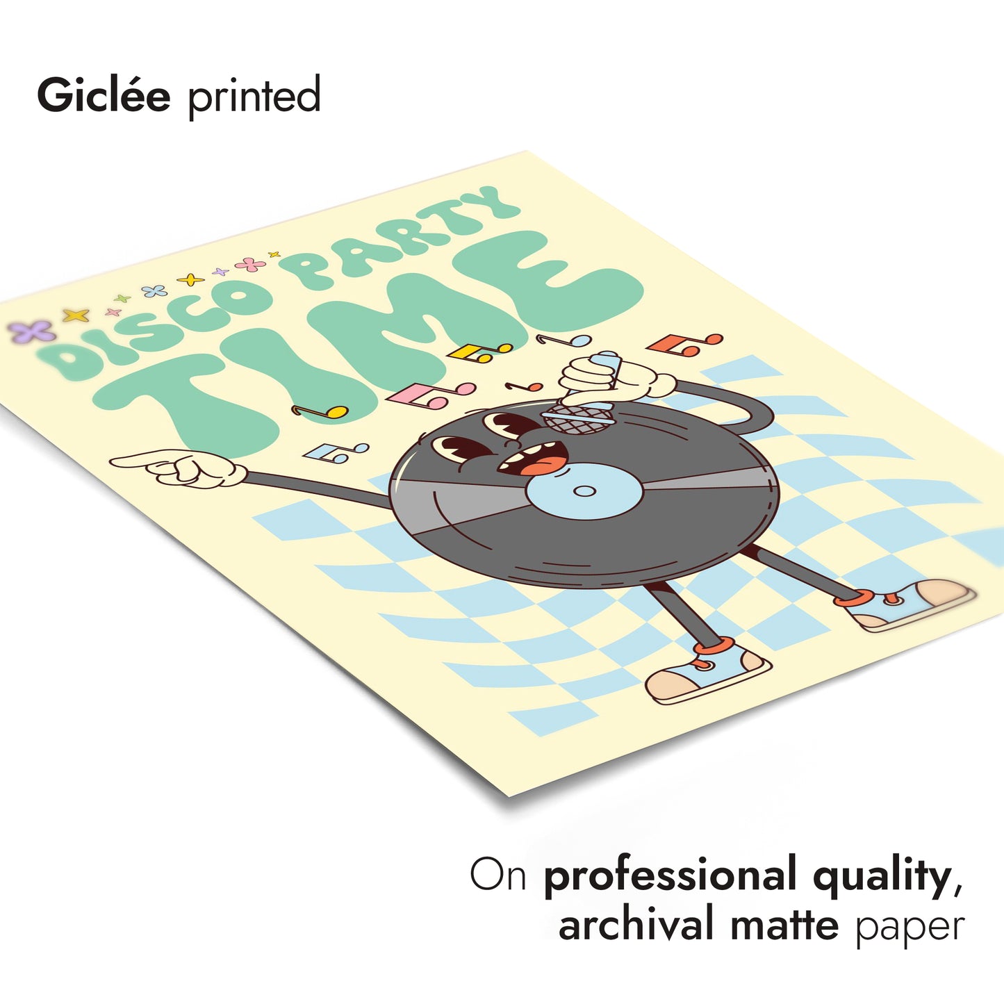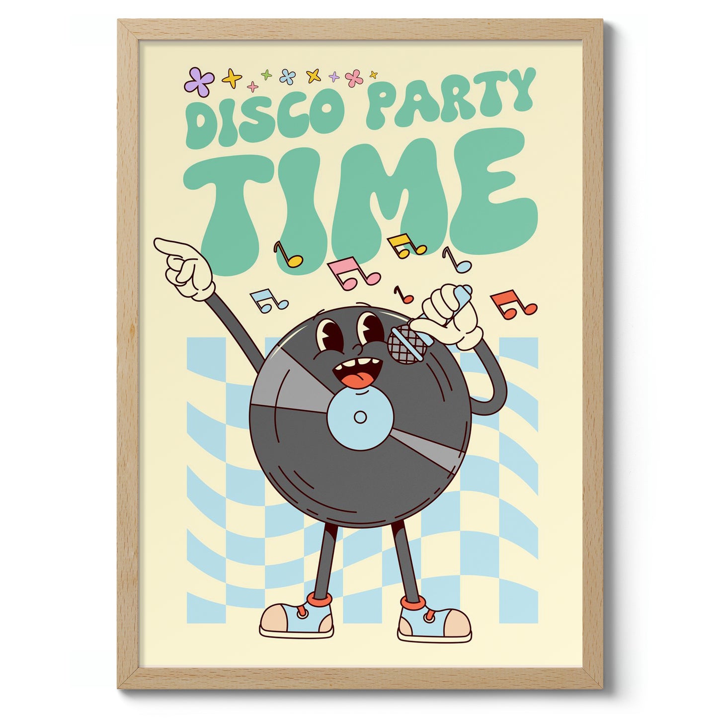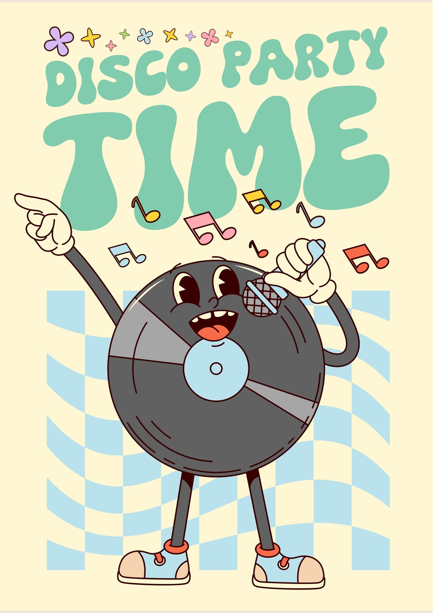 This retro-themed poster features a lively cartoon vinyl record character, microphone in hand, set against playful typography reading "Disco Party Time." The vibrant illustration, filled with colorful musical notes and a whimsical checkerboard background, captures the essence of a nostalgic disco era. Perfect for music and party enthusiasts, this poster adds a fun, vintage touch to any space.