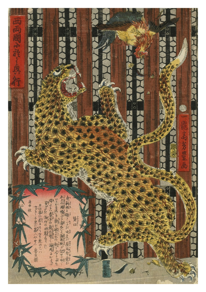 "Display at Nishi Ryosku" by Ichiryusai Yoshitoyo captures a dramatic scene of a fierce leopard and a vigilant bird in mid-battle, rendered in traditional Japanese woodblock style. This ukiyo-e print showcases detailed patterns and dynamic expressions, creating a striking contrast against a patterned background. Perfect as a bold and historical poster, this piece adds an exotic touch to any space.