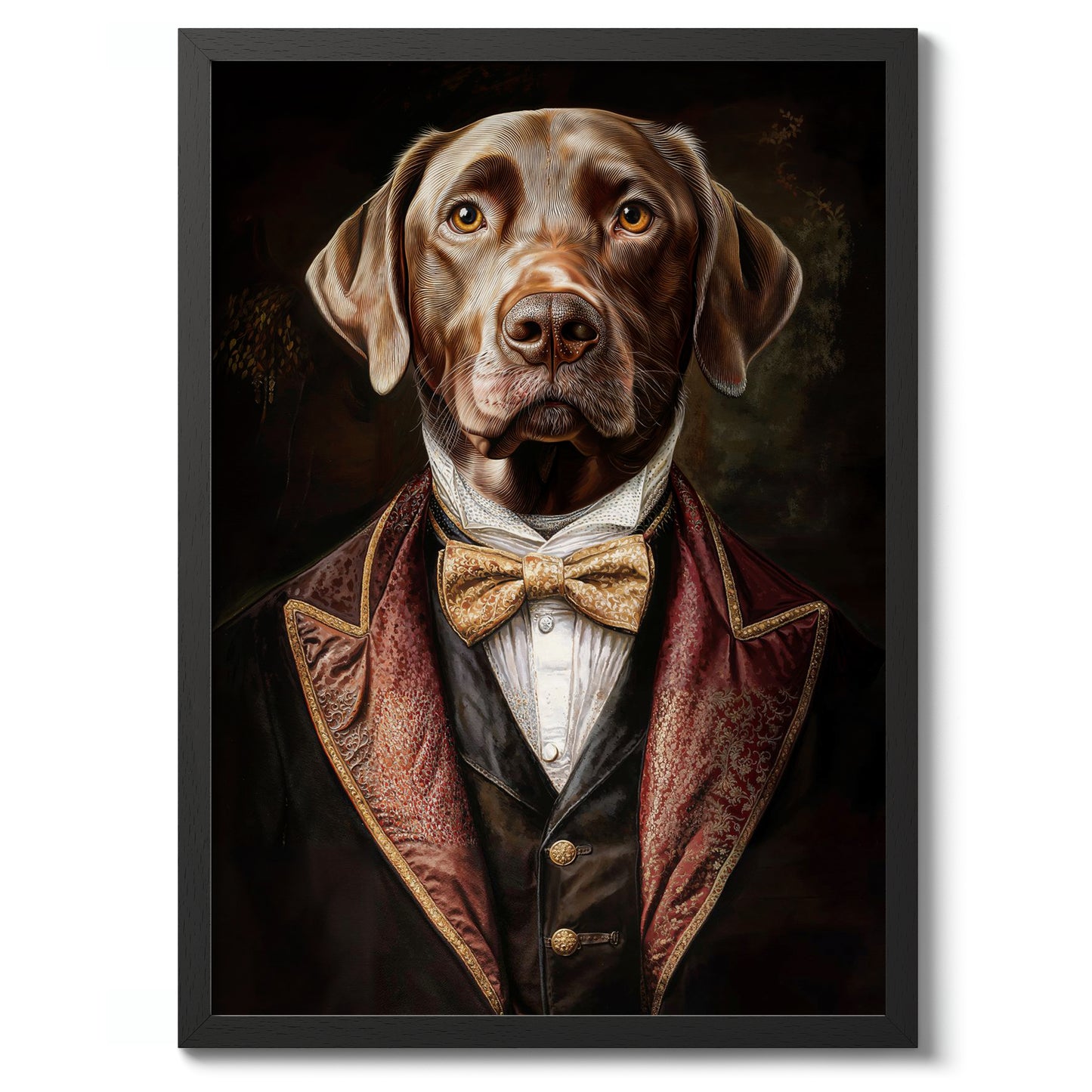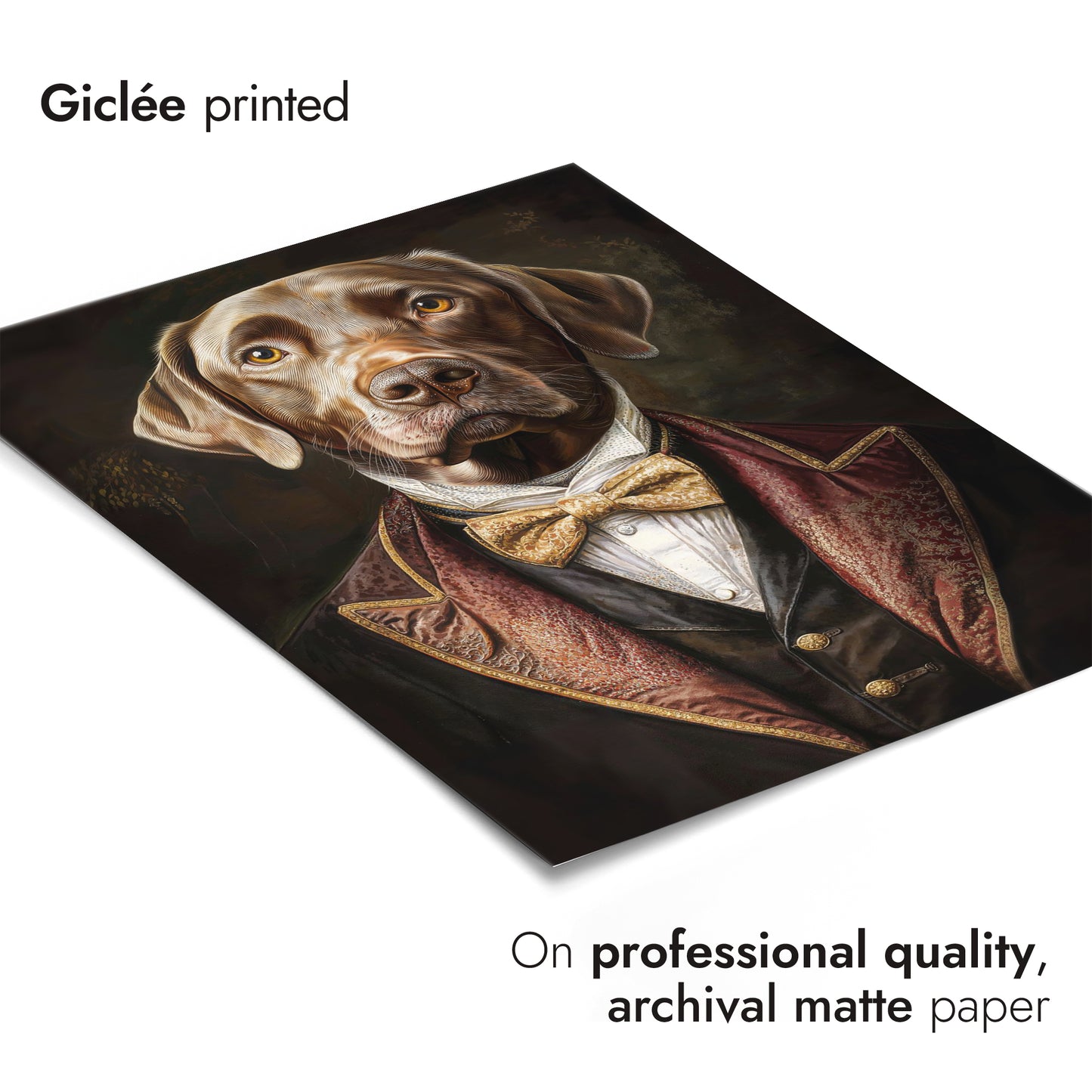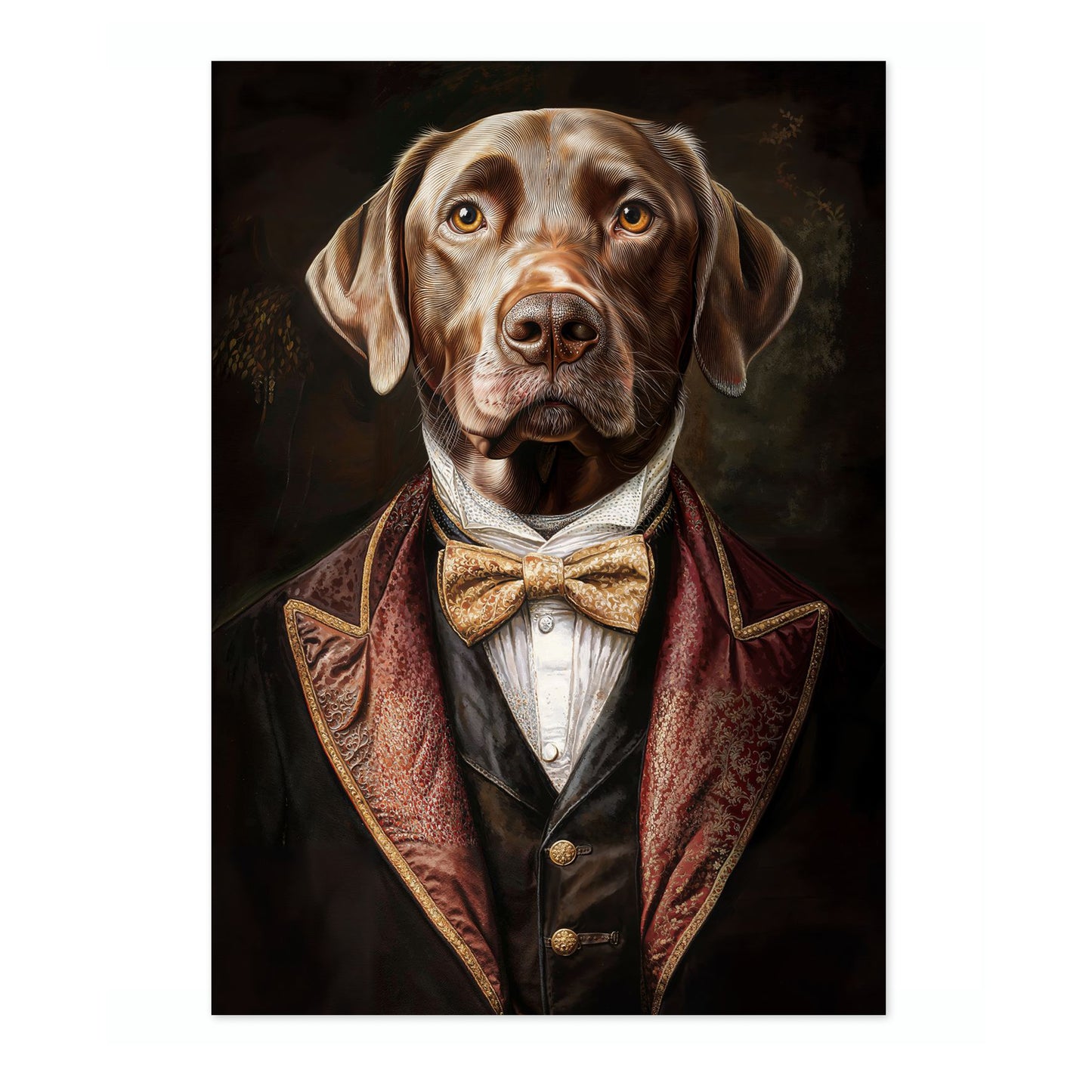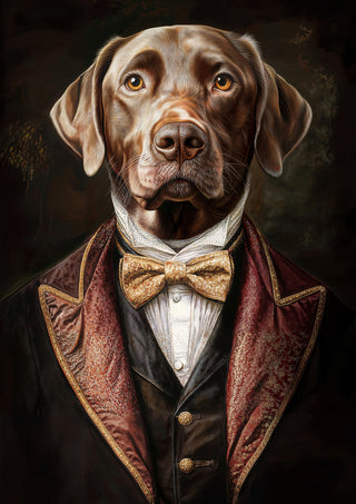 This captivating poster features a dog dressed in regal Tudor-style attire, complete with a luxurious velvet jacket and a gold bow tie. The vintage illustration captures the dog's lifelike expression with remarkable detail, creating a humorous yet sophisticated ambiance. Ideal for those interested in nature, animal portraits, and historic costume themes, this artwork accentuates any space with charm.