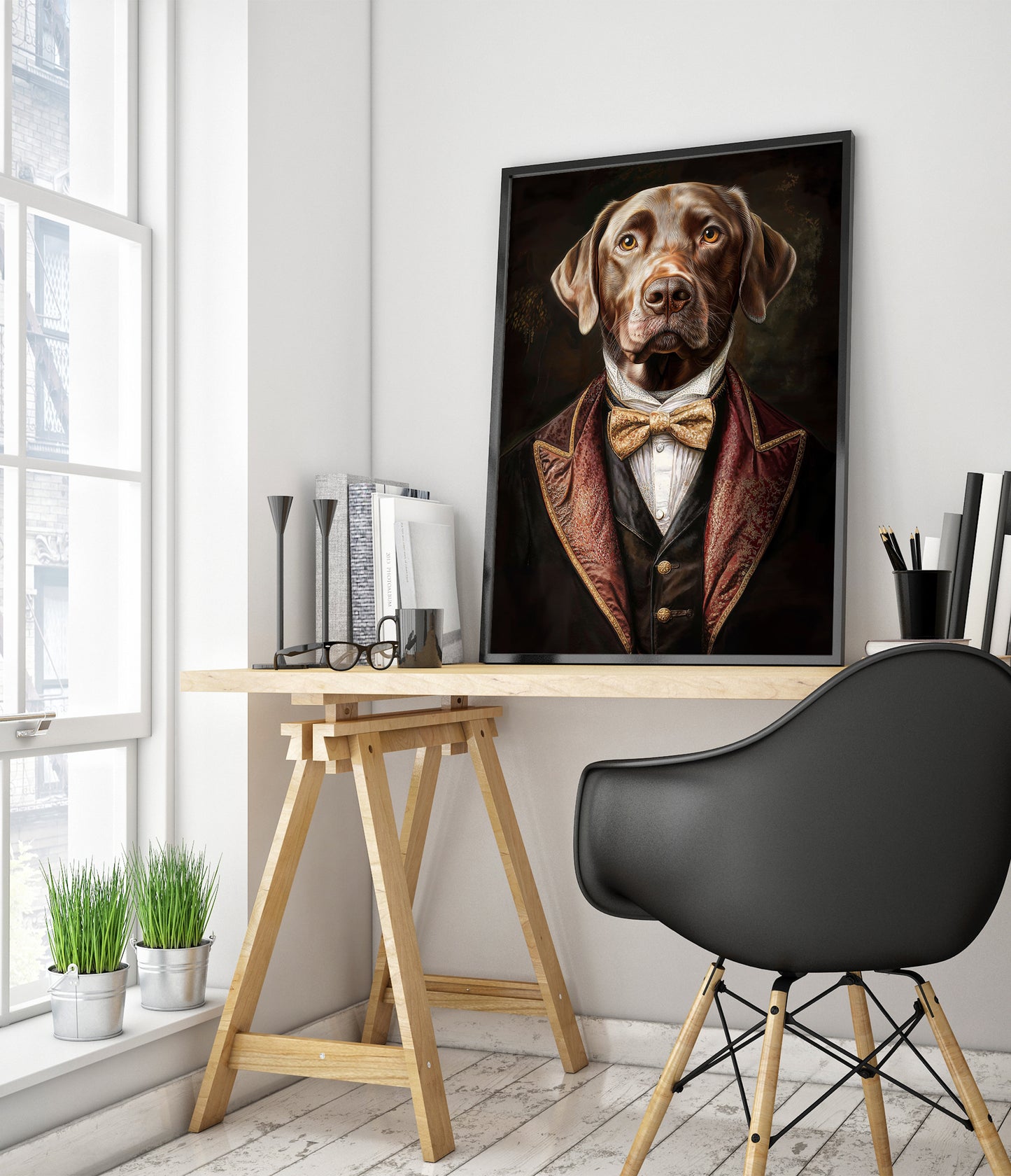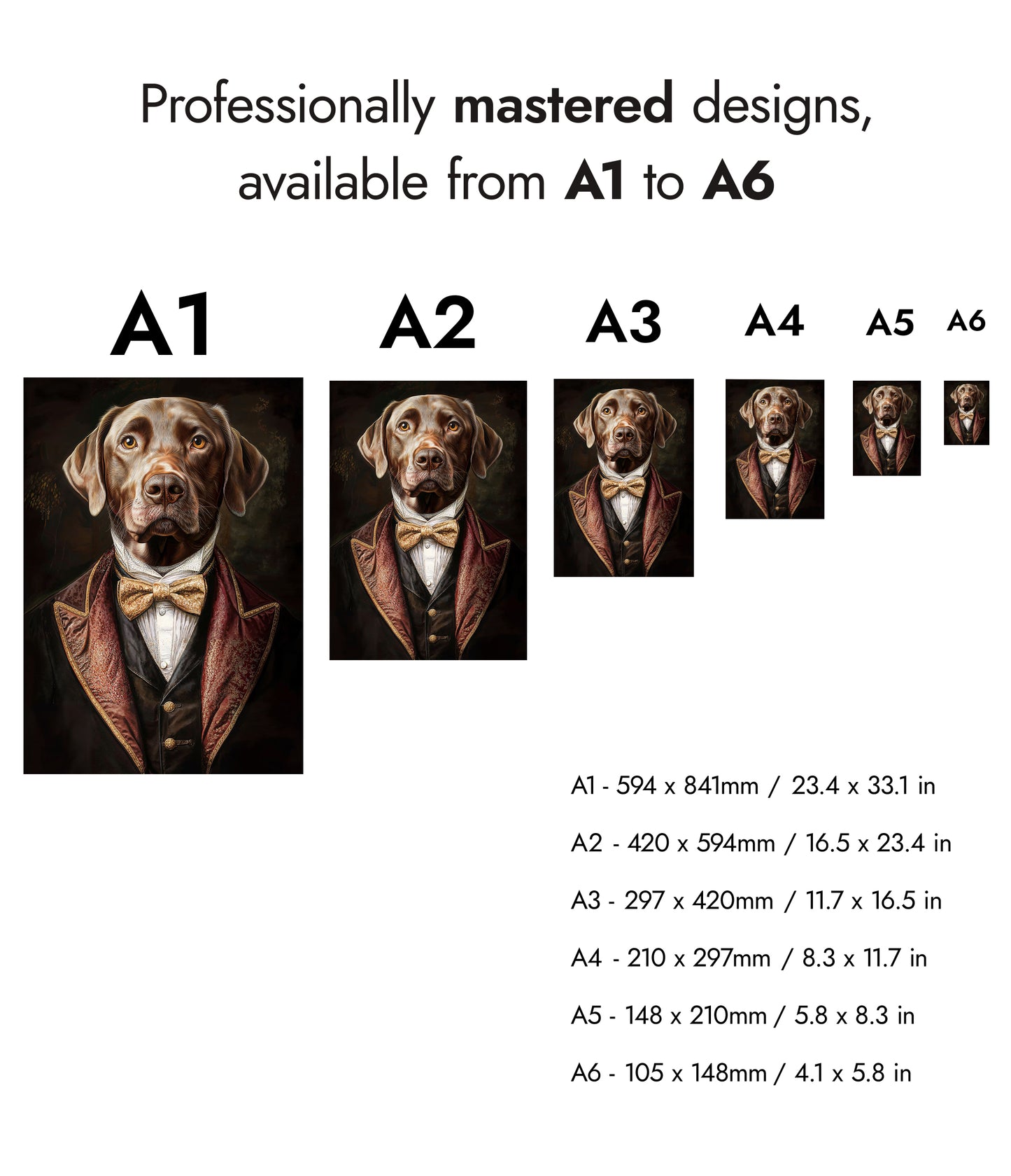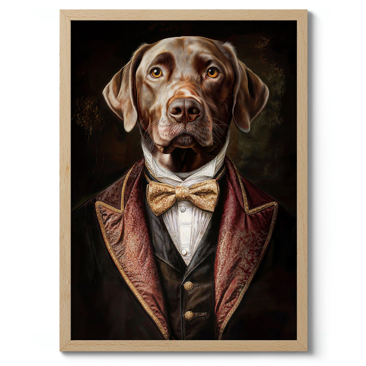 This captivating poster features a dog dressed in regal Tudor-style attire, complete with a luxurious velvet jacket and a gold bow tie. The vintage illustration captures the dog's lifelike expression with remarkable detail, creating a humorous yet sophisticated ambiance. Ideal for those interested in nature, animal portraits, and historic costume themes, this artwork accentuates any space with charm.
