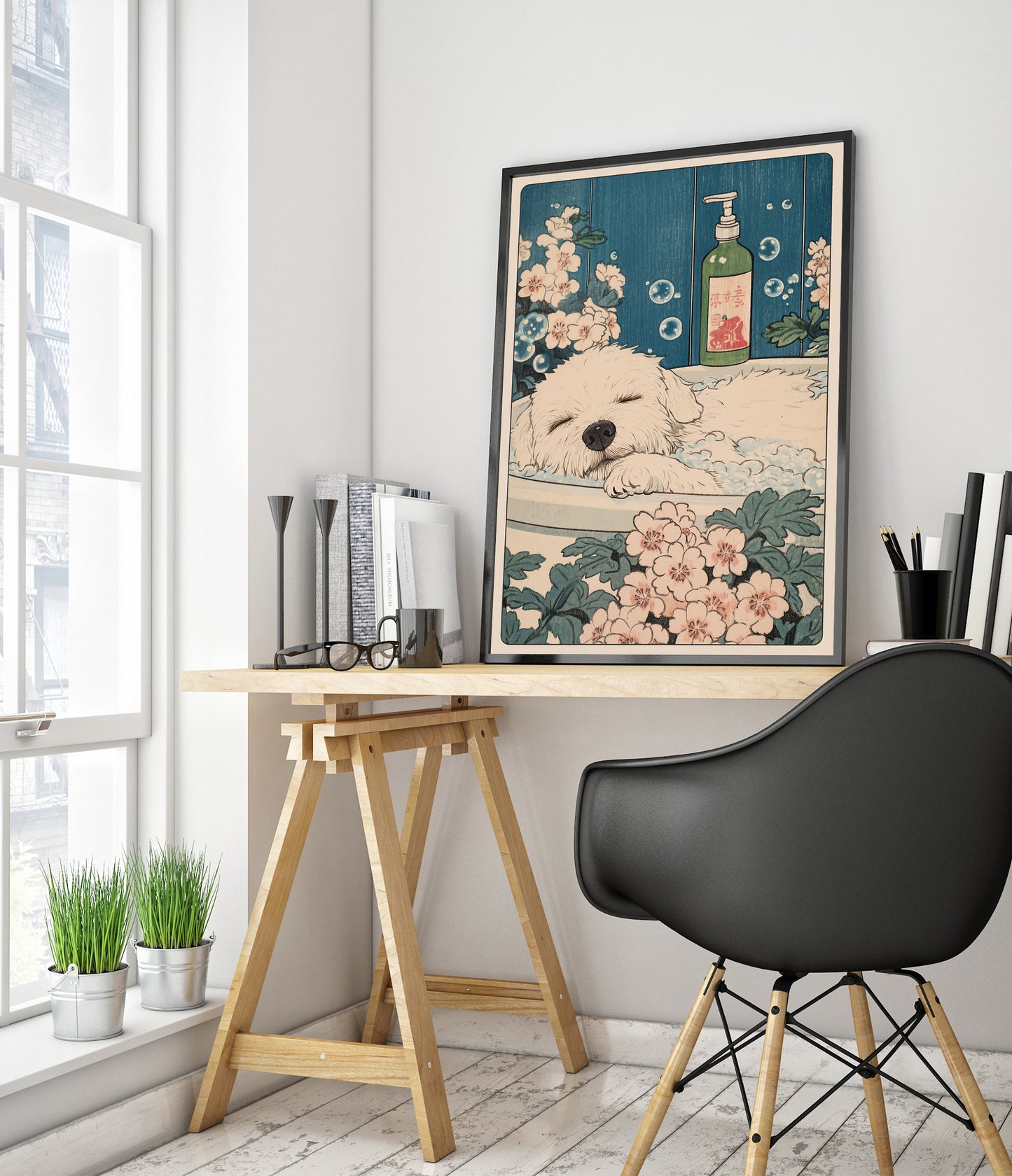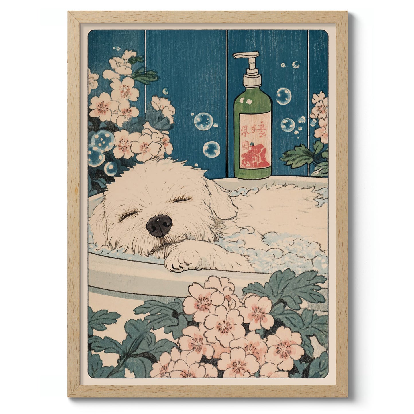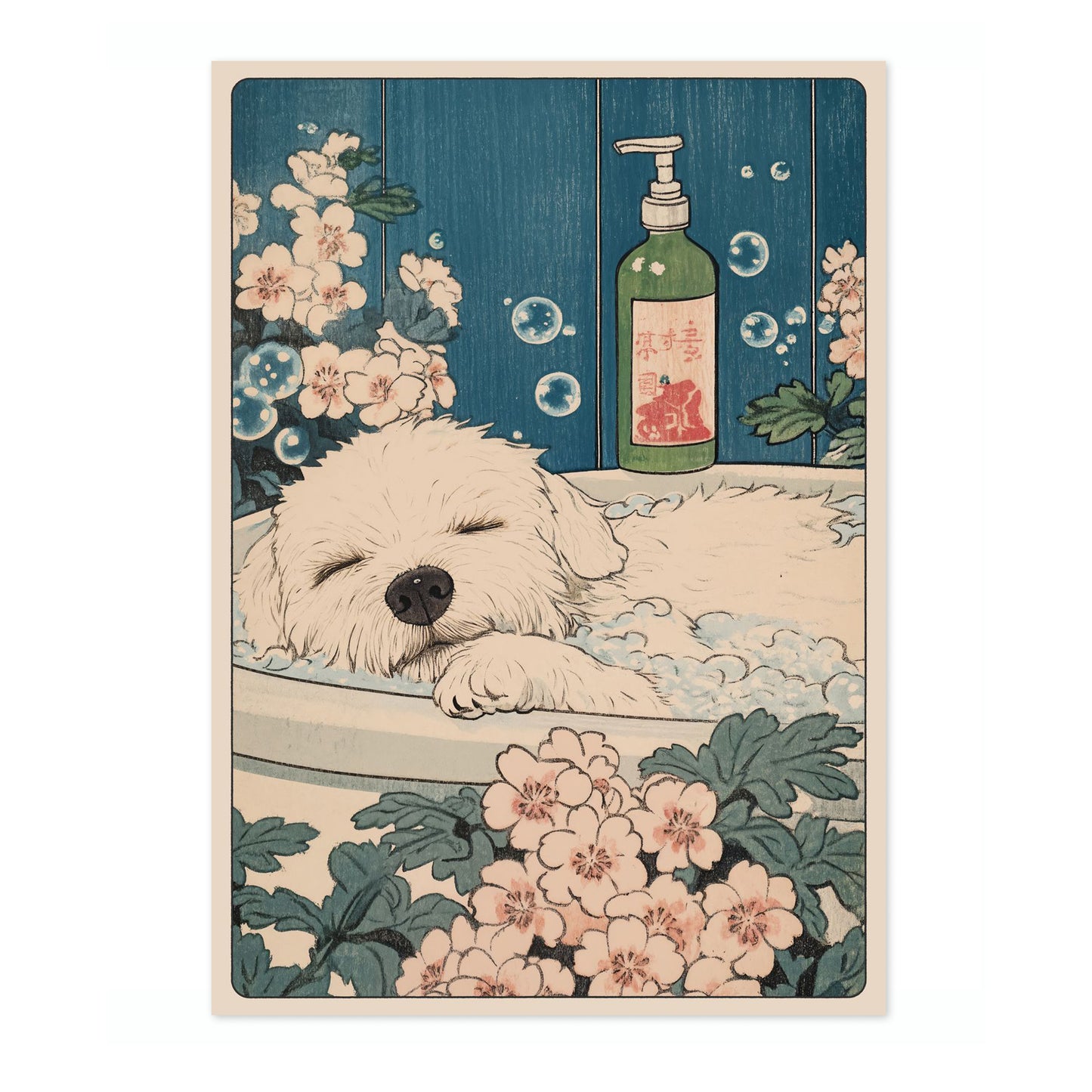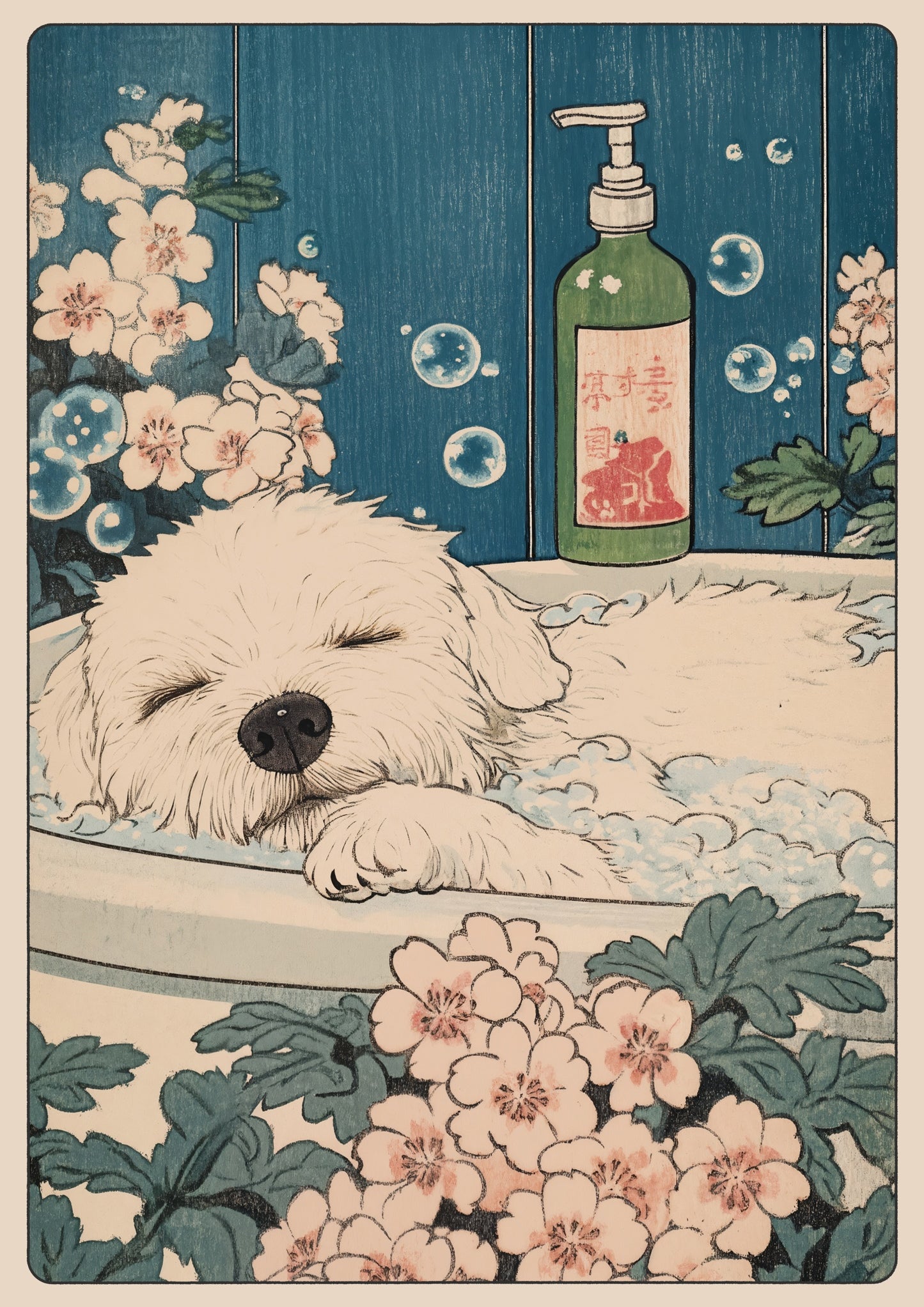This charming anime poster features a fluffy white puppy blissfully resting in a bubble-filled bath, surrounded by cherry blossoms. With a blue wooden backdrop and a traditional Japanese soap bottle adding cultural flair, the illustration evokes tranquility and playfulness. Inspired by woodblock techniques, this delightful scene captures the serene essence of a peaceful bath time moment.