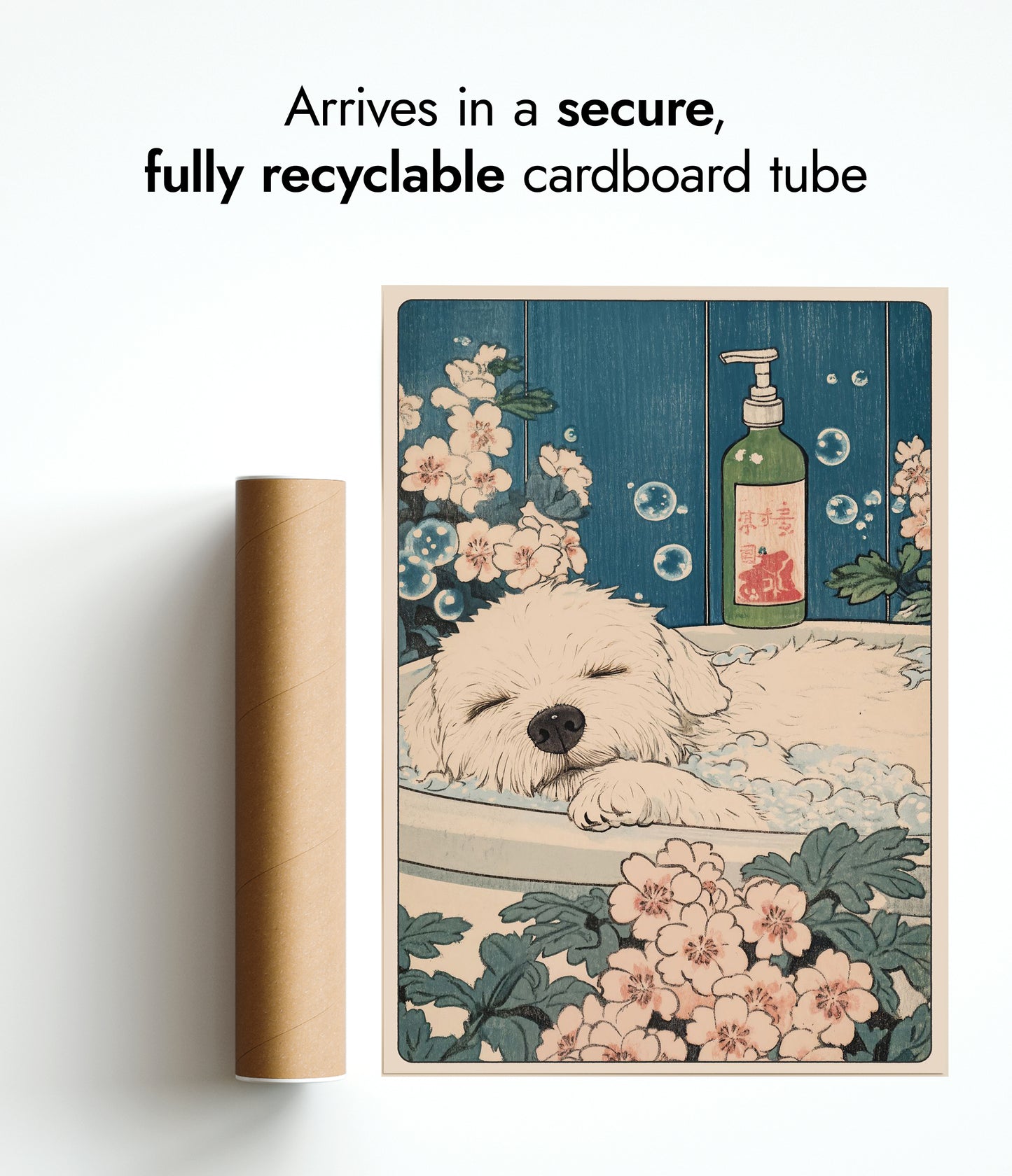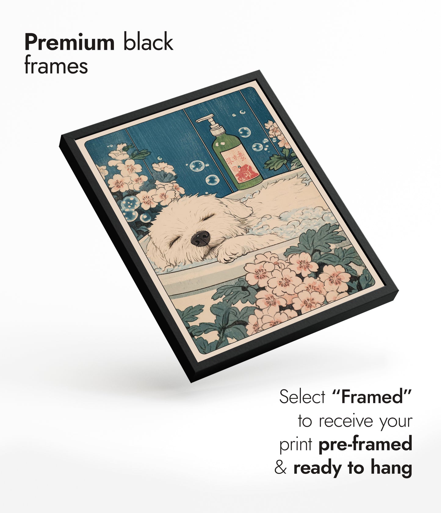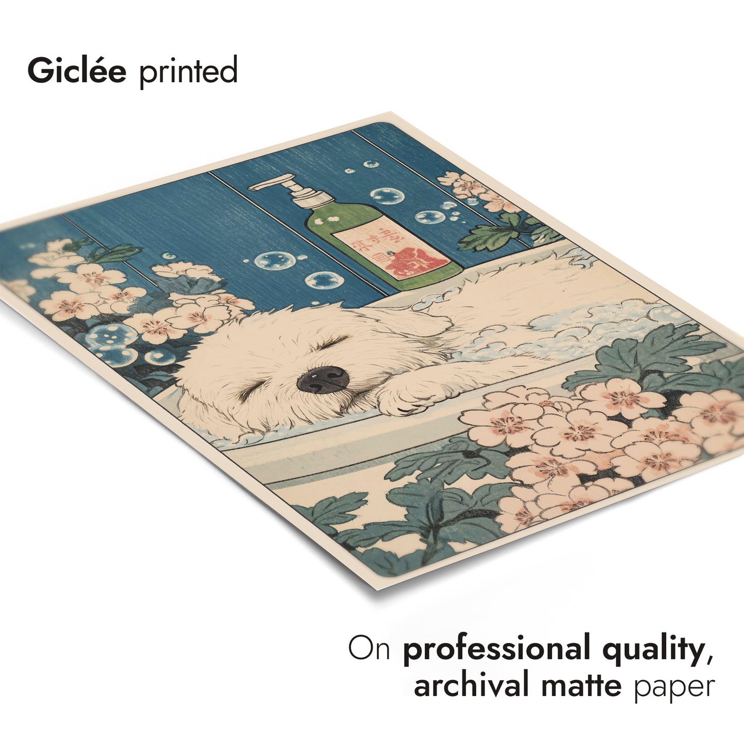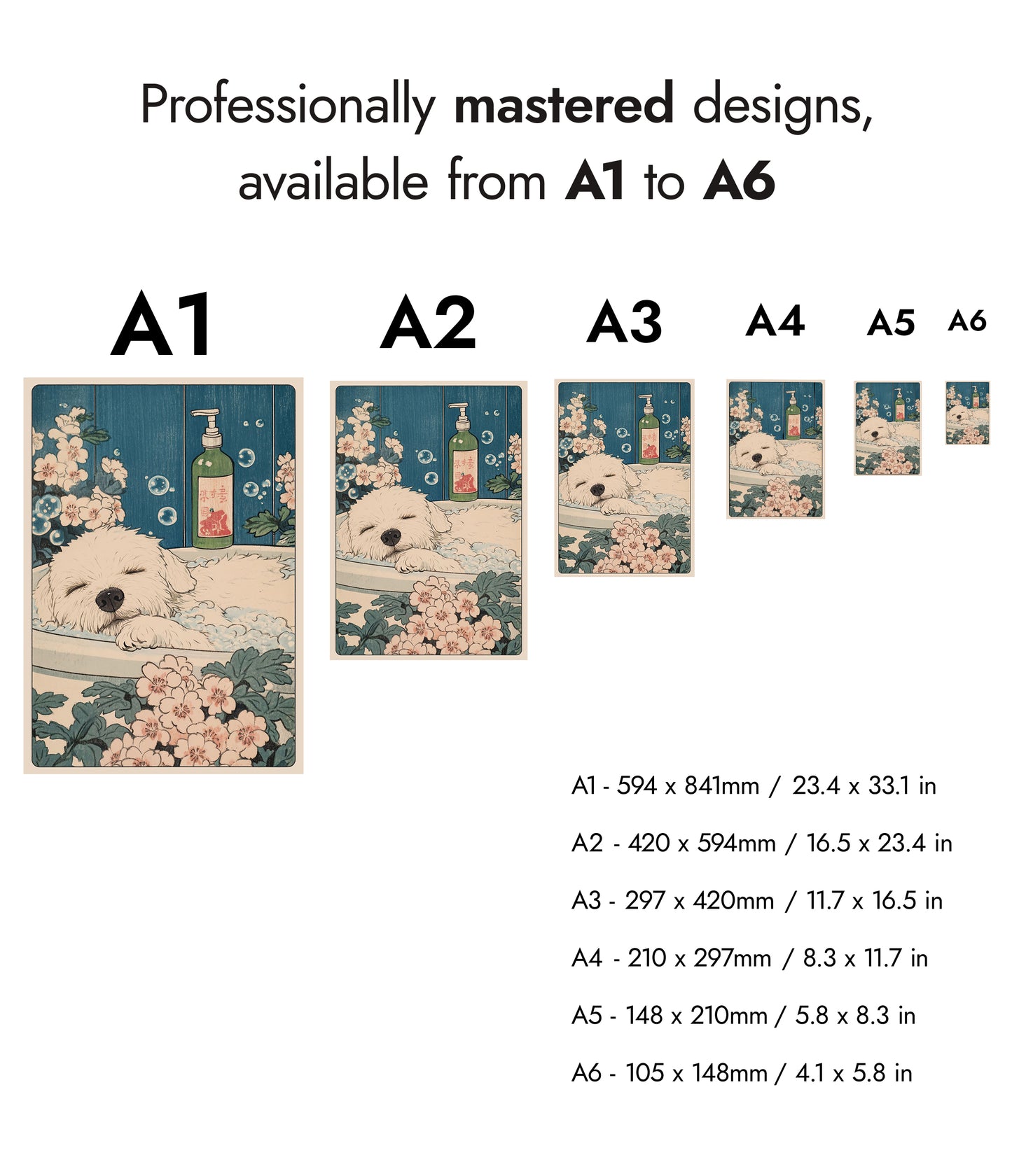 This charming anime poster features a fluffy white puppy blissfully resting in a bubble-filled bath, surrounded by cherry blossoms. With a blue wooden backdrop and a traditional Japanese soap bottle adding cultural flair, the illustration evokes tranquility and playfulness. Inspired by woodblock techniques, this delightful scene captures the serene essence of a peaceful bath time moment.