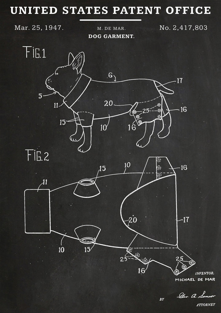 This vintage-style poster features a detailed patent illustration of a dog garment, dated March 25, 1947. The line art meticulously shows the garment's design and measurements against a chalkboard-like background. Ideal for those who appreciate schematic drawings or canine-themed decor, this artwork adds a touch of historical charm to any space. Perfect for dog lovers and vintage patent enthusiasts.