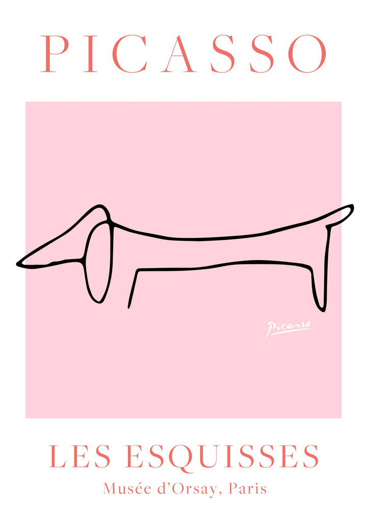 This minimalist poster titled "Pink Dog" by Pablo Picasso features a simple yet striking line drawing of a dog against a soft pink background. Exemplifying Picasso's iconic minimalist style, this art piece incorporates clean lines and an abstract form. Ideal for animal lovers and art enthusiasts, this poster adds a touch of sophistication to any space.