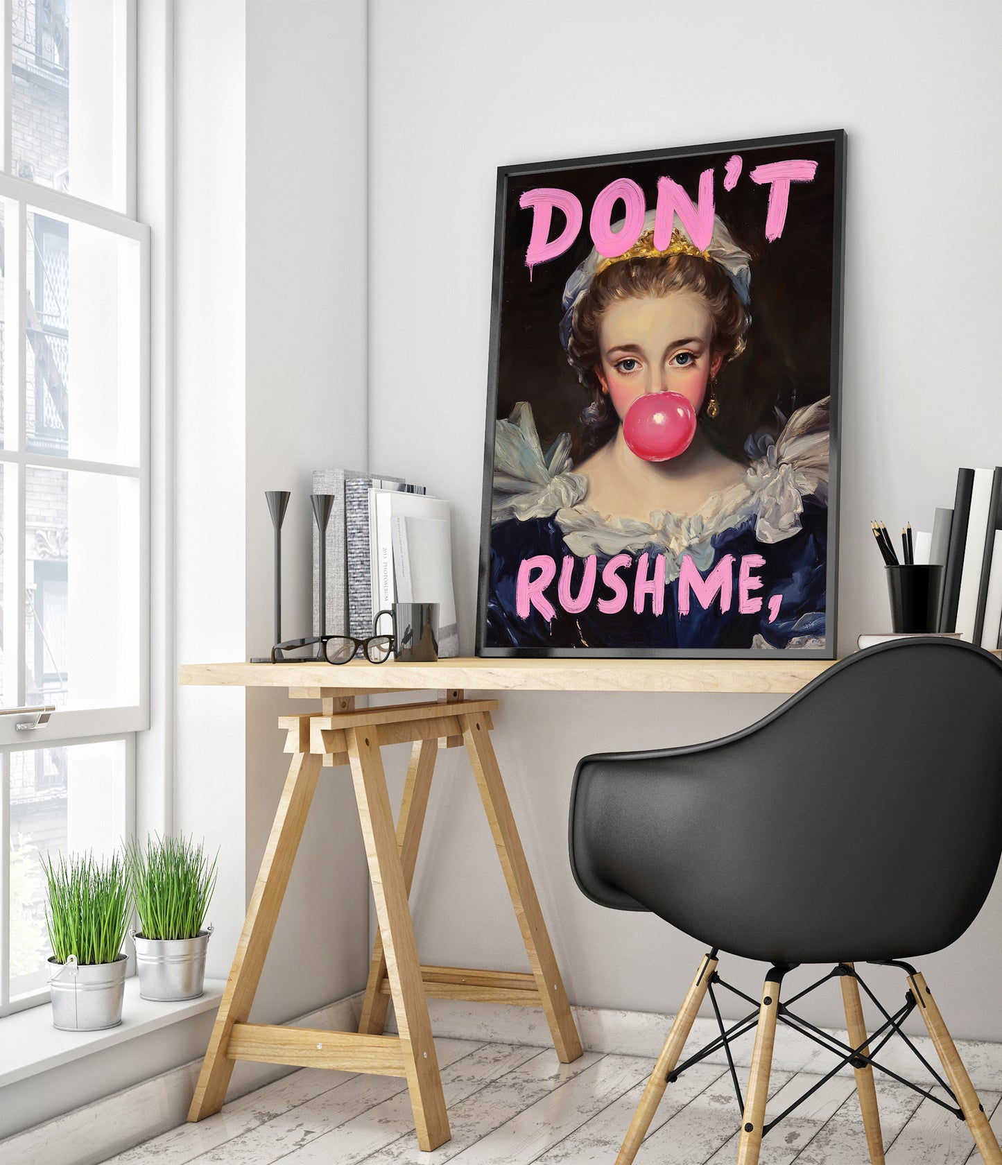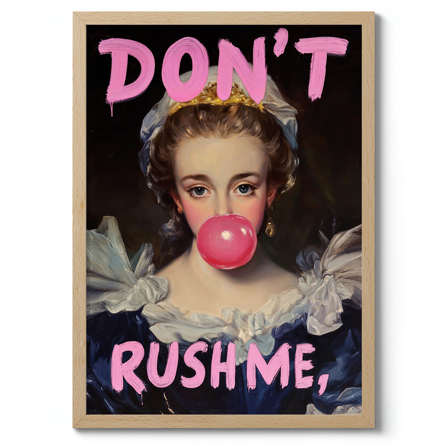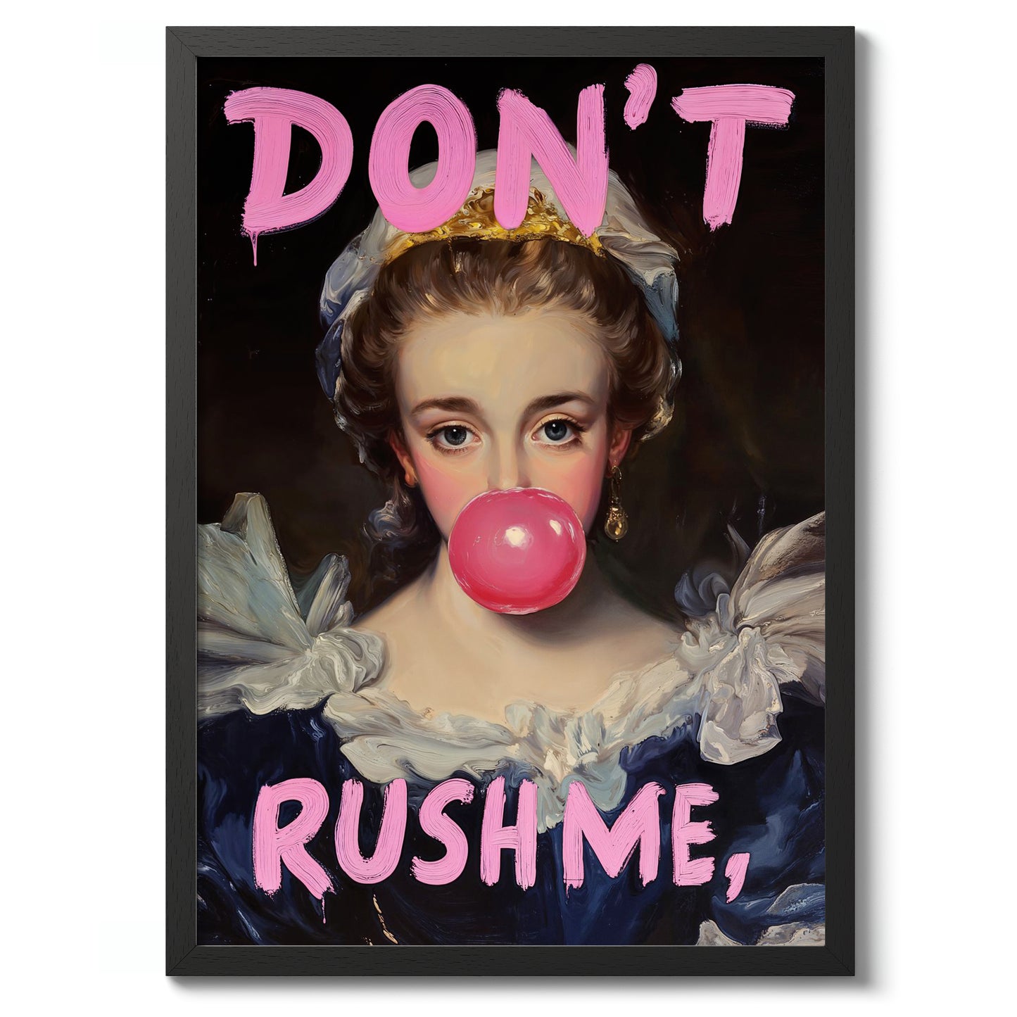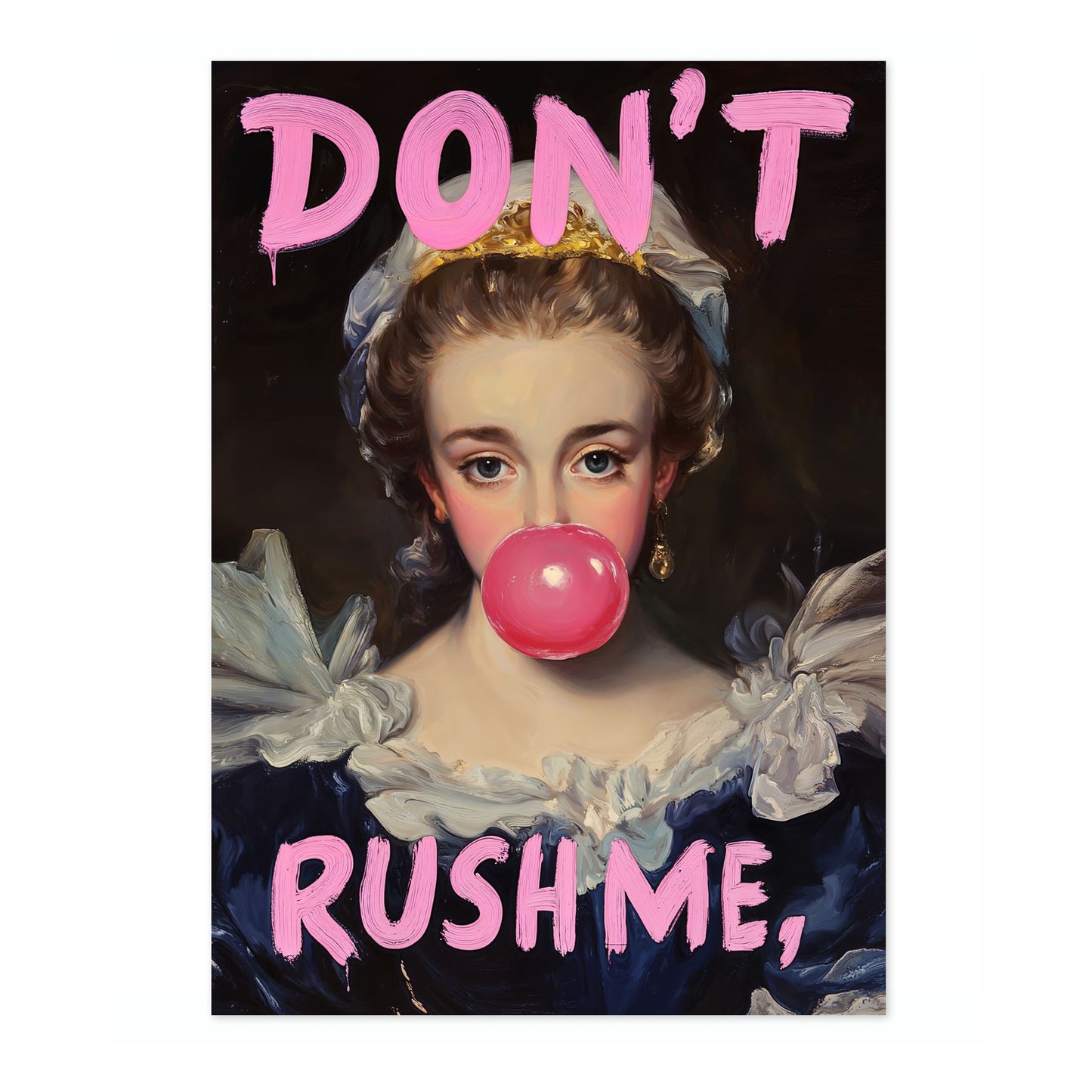 The "Don't Rush Me 2" art poster humorously combines classic portraiture with modern graffiti elements. Featuring a historic-style girl blowing bubblegum, it contrasts playful pink typography against a traditional backdrop. This typographic artwork brings a quirky, funny twist to vintage aesthetics, making it perfect for adding character and wit to any space. Ideal for fans of graphic and historic art styles.