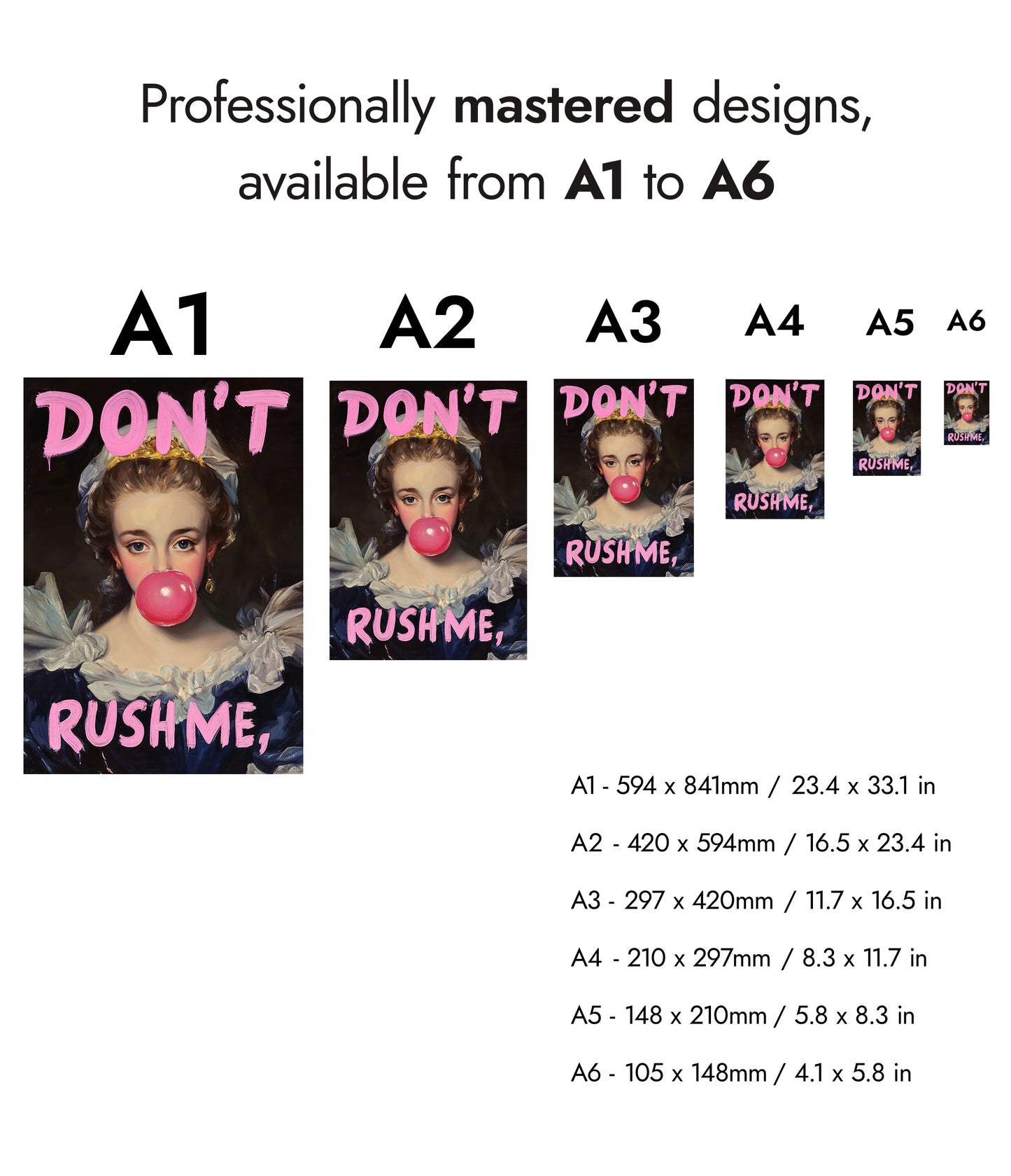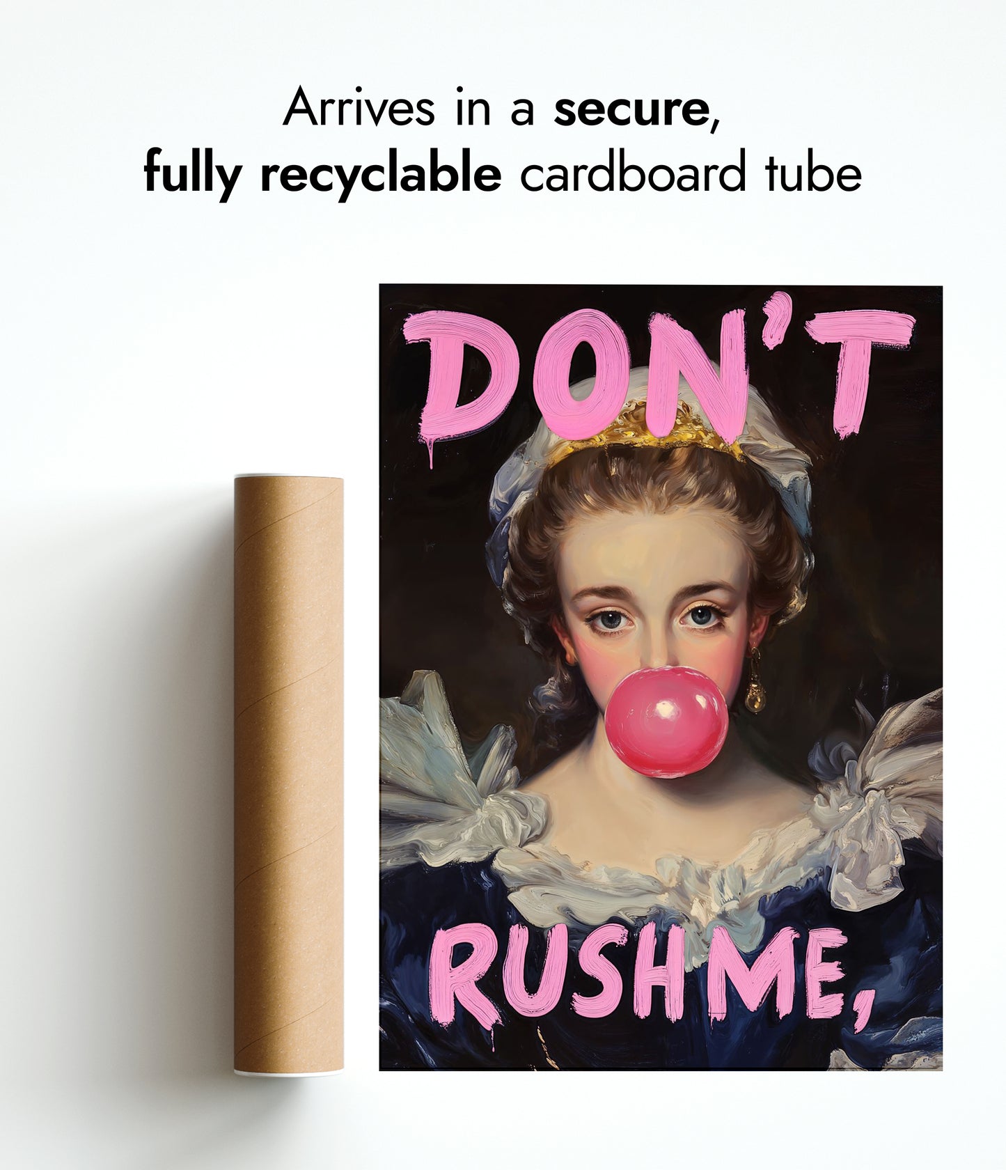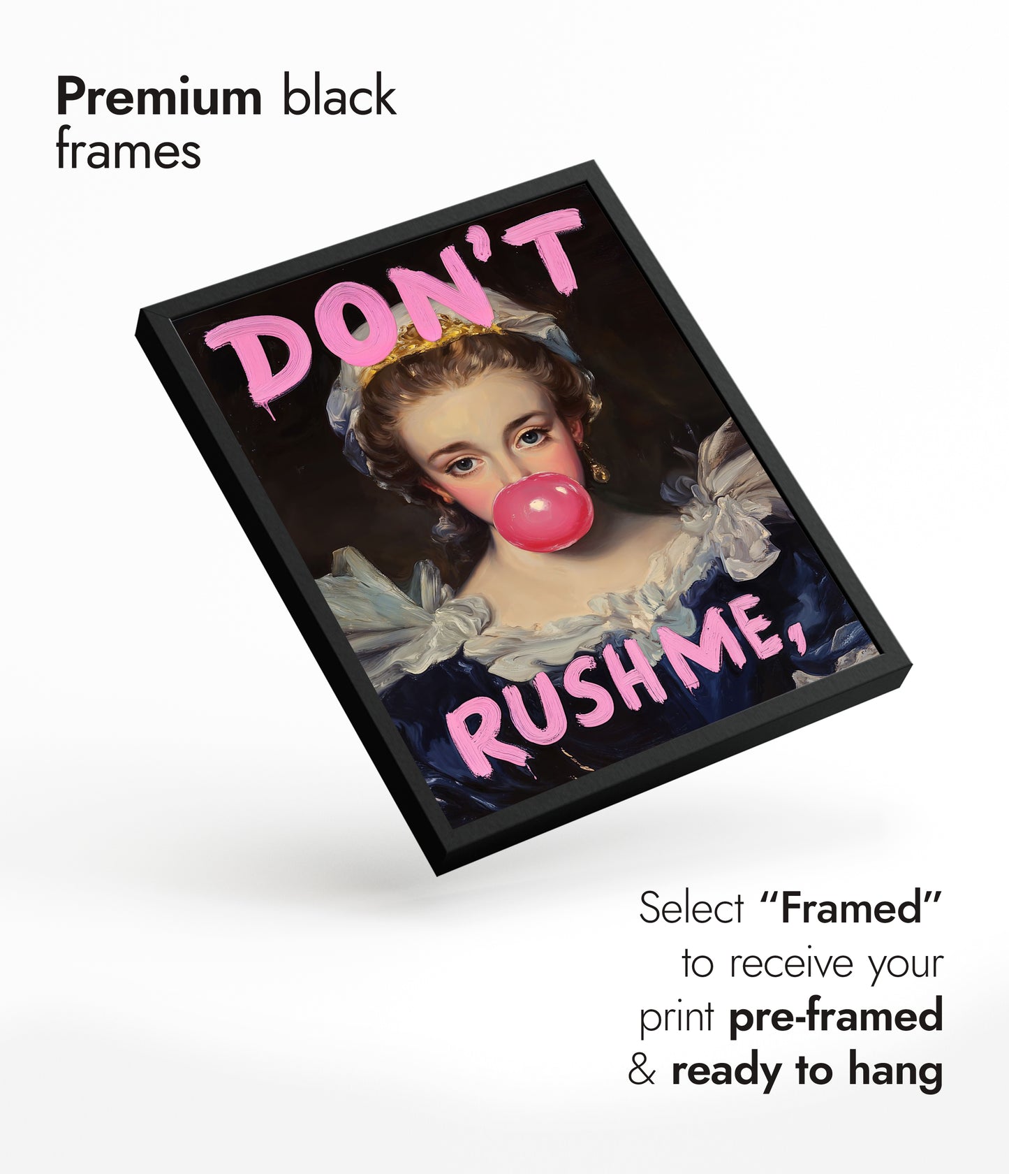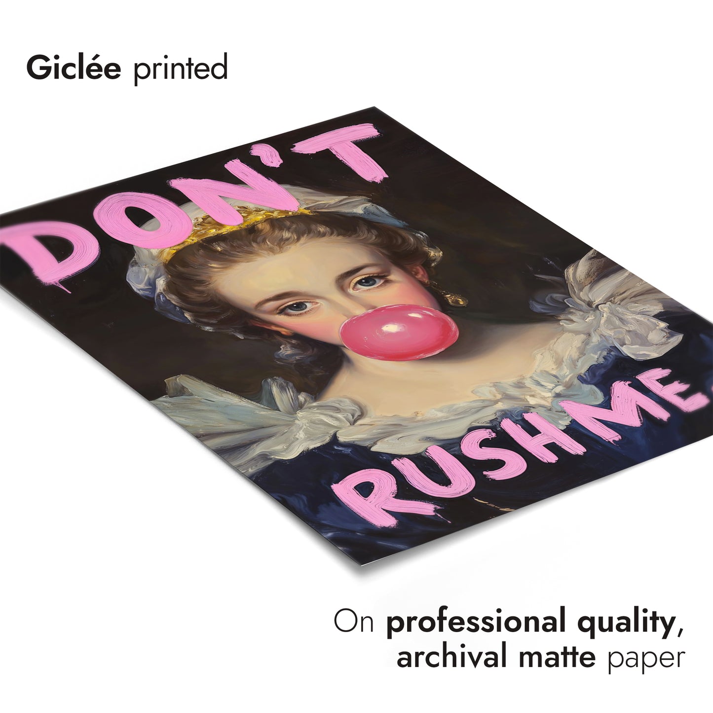 The "Don't Rush Me 2" art poster humorously combines classic portraiture with modern graffiti elements. Featuring a historic-style girl blowing bubblegum, it contrasts playful pink typography against a traditional backdrop. This typographic artwork brings a quirky, funny twist to vintage aesthetics, making it perfect for adding character and wit to any space. Ideal for fans of graphic and historic art styles.
