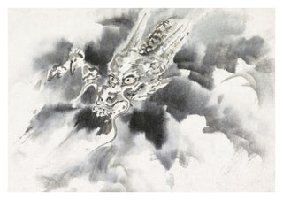 This striking poster features Utagawa Kuniyoshi's traditional Japanese painting of a mythical dragon emerging from smoky clouds. The monochromatic palette emphasizes the dragon's fierce expression and intricate detailing, embodying elements of fantasy and mythology. Perfect for fans of Asian art, this landscape print adds a touch of timeless elegance and cultural richness to any space.