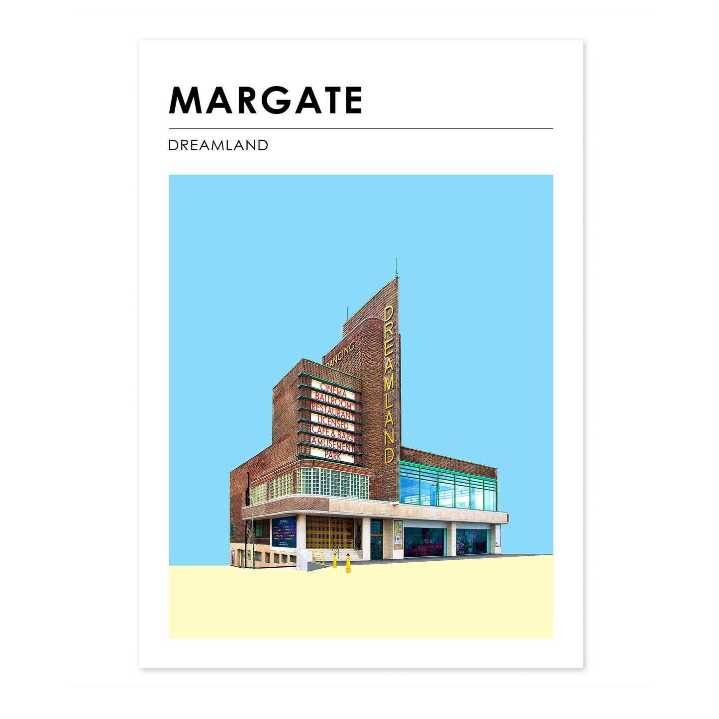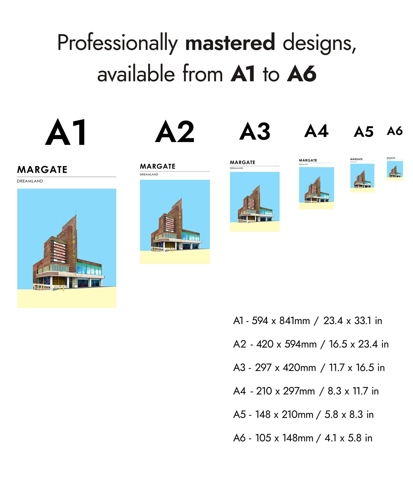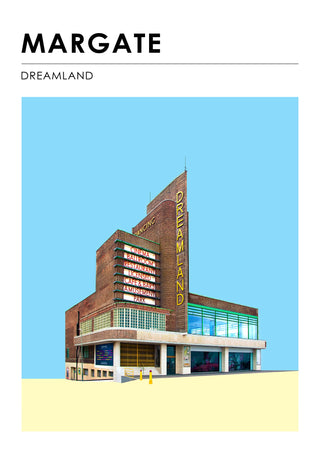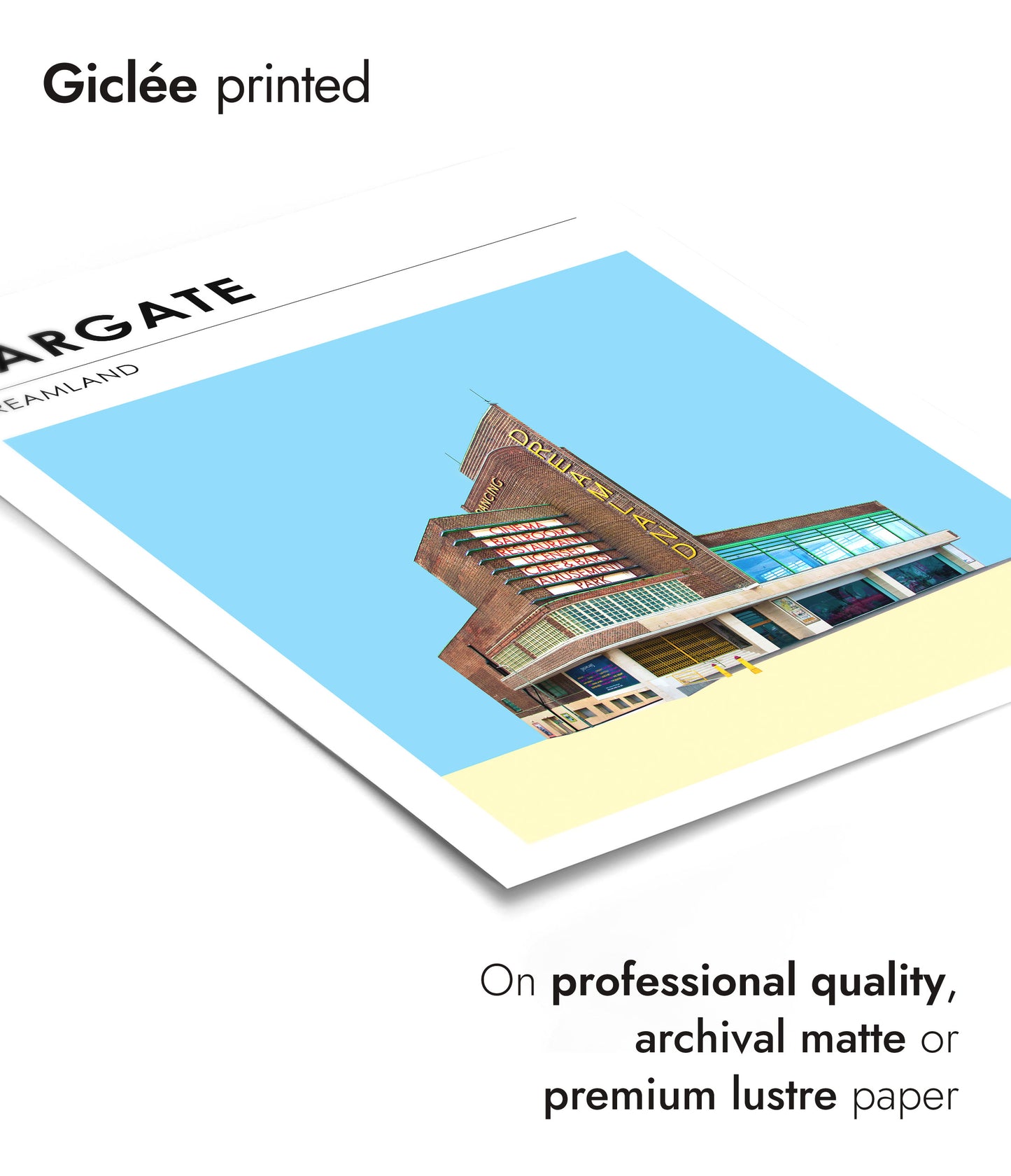 This poster depicts the iconic Dreamland amusement park in Margate, captured with a modern, minimalist aesthetic. The composition highlights the building's vintage design against a crisp, blue sky. Ideal for lovers of architectural photography, this piece by Katy Donaldson emphasizes clean lines and vibrant colours, reflecting the historic charm of this Kent landmark.