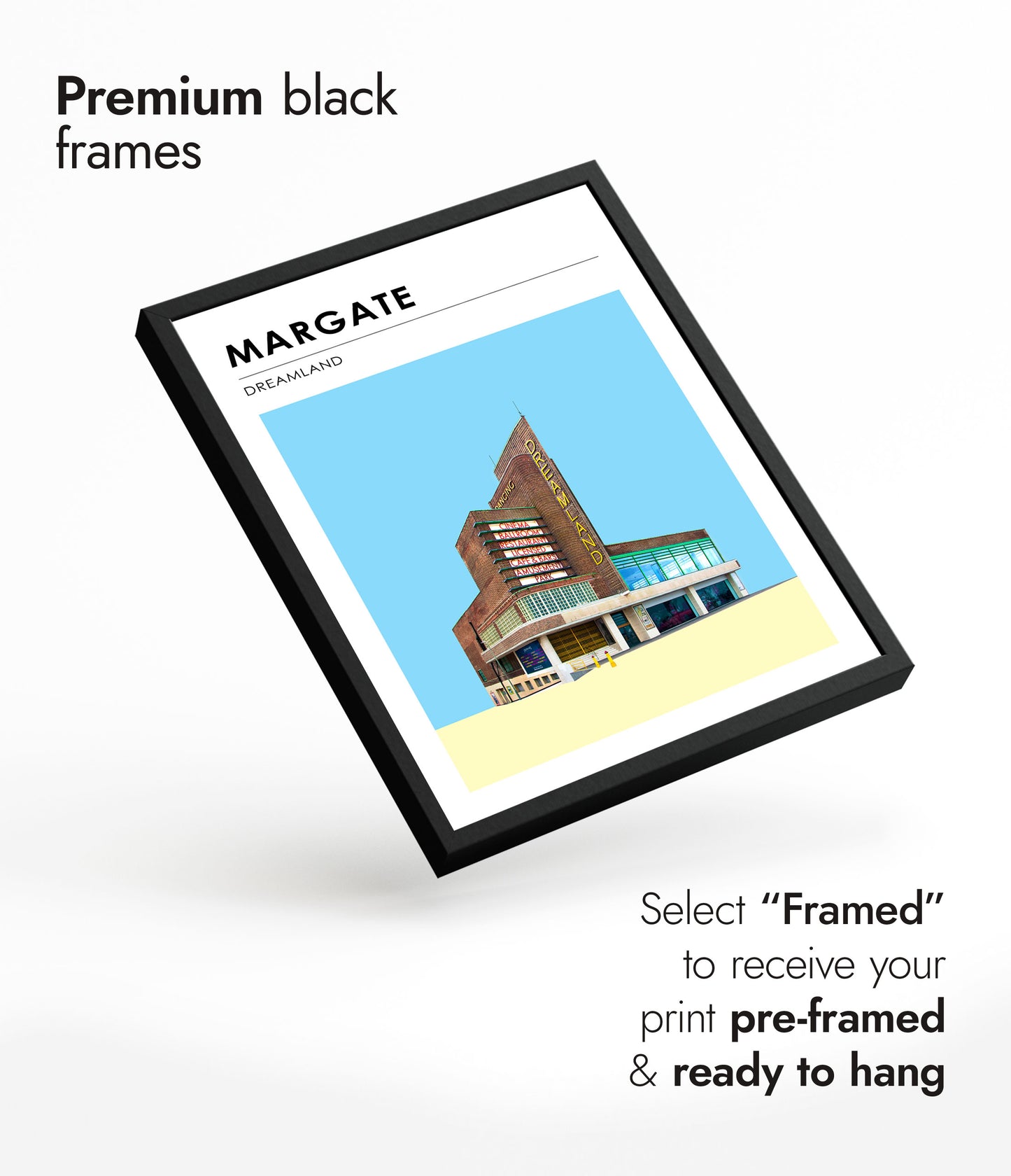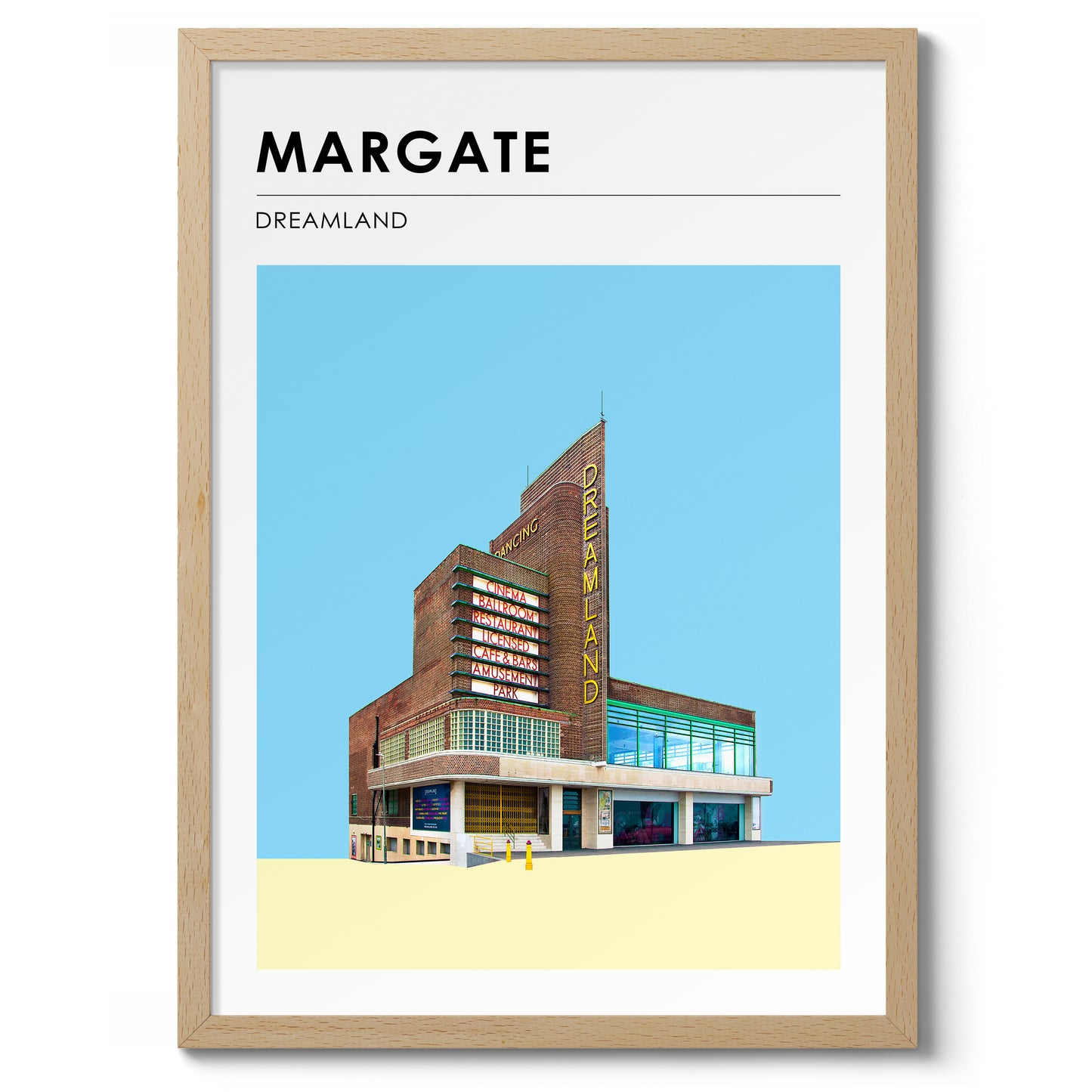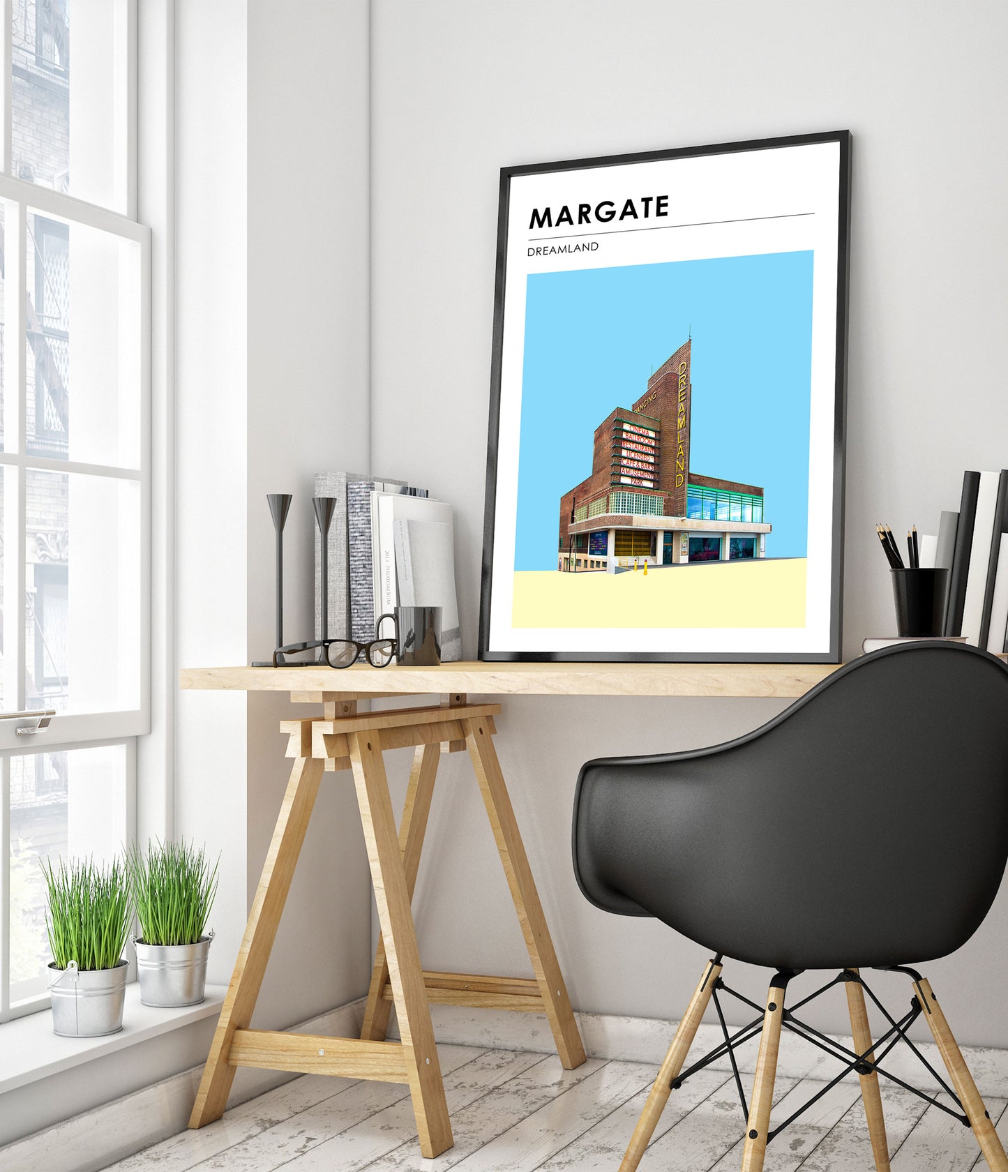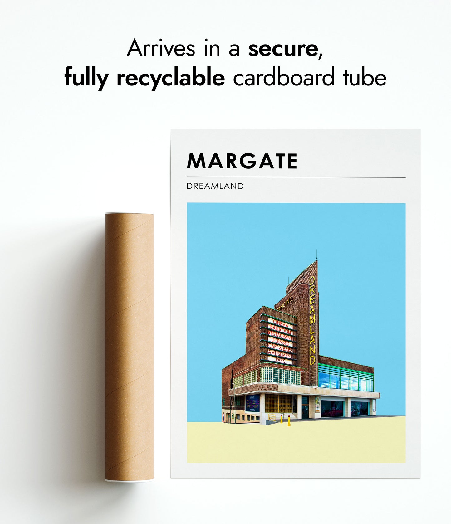 This poster depicts the iconic Dreamland amusement park in Margate, captured with a modern, minimalist aesthetic. The composition highlights the building's vintage design against a crisp, blue sky. Ideal for lovers of architectural photography, this piece by Katy Donaldson emphasizes clean lines and vibrant colours, reflecting the historic charm of this Kent landmark.