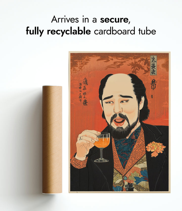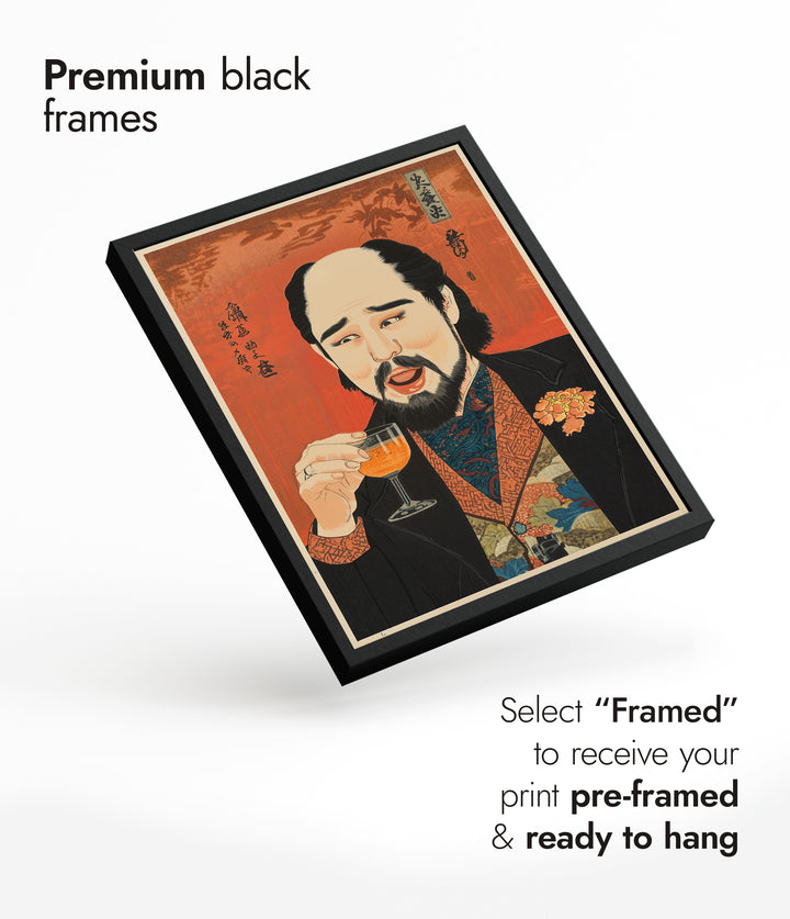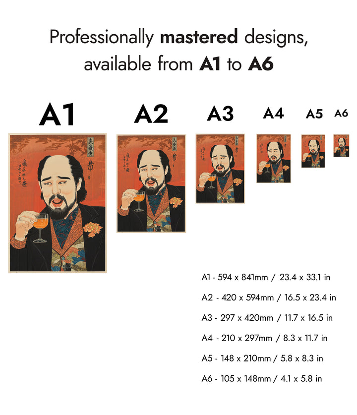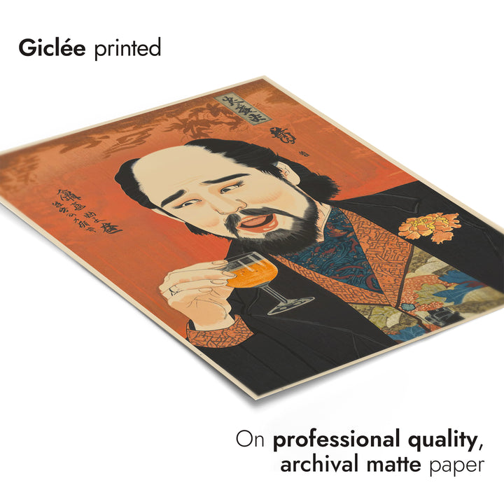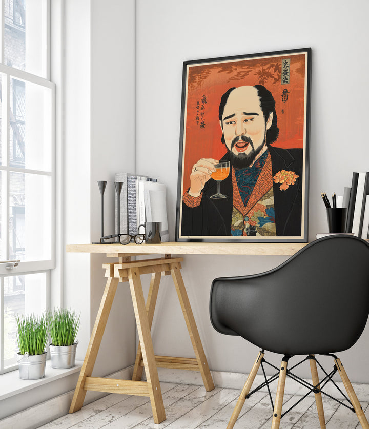 This striking "Drinking Leo" poster captures a humorous fusion of ukiyo-e and anime styles, featuring a character savoring a cocktail. The vibrant orange background contrasts with the intricate detailing of the character's attire. Ideal for enthusiasts of Japanese art and anime, this woodblock-inspired piece adds a playful touch to any space. Keywords: anime poster, ukiyo-e art, cocktail theme.
