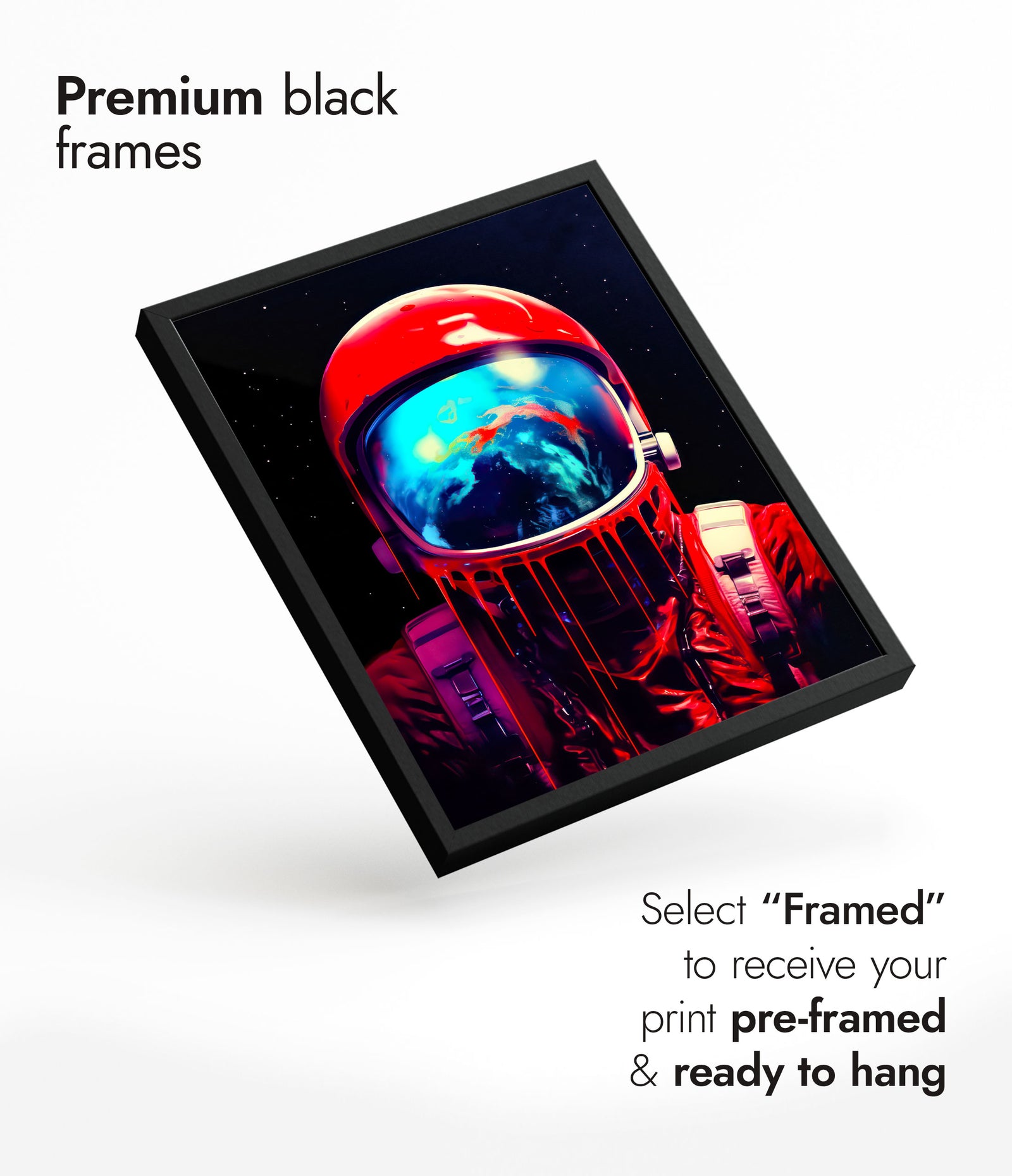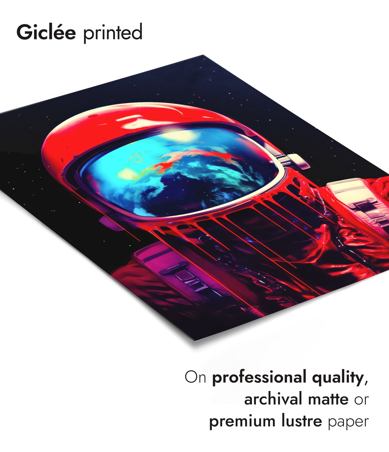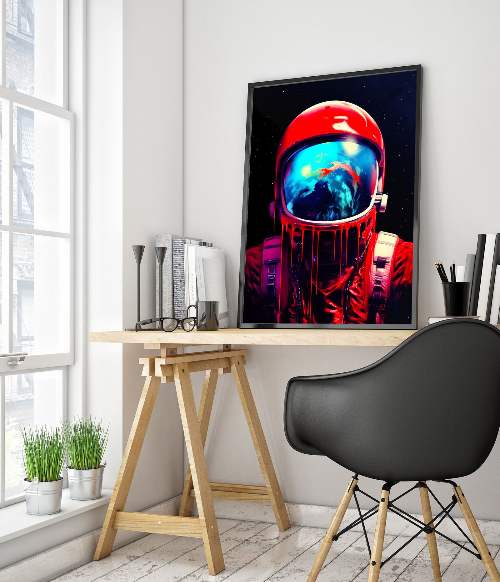 "Drippy Space Man" poster captures a surreal astronaut with a melting effect, vividly illustrating a reflective helmet showcasing planet Earth. Embracing modern Sci-Fi themes, the bold red spacesuit contrasts against the dark space backdrop. This striking illustration combines elements of contemporary art and cosmic exploration, making it an eye-catching piece for any space enthusiast.