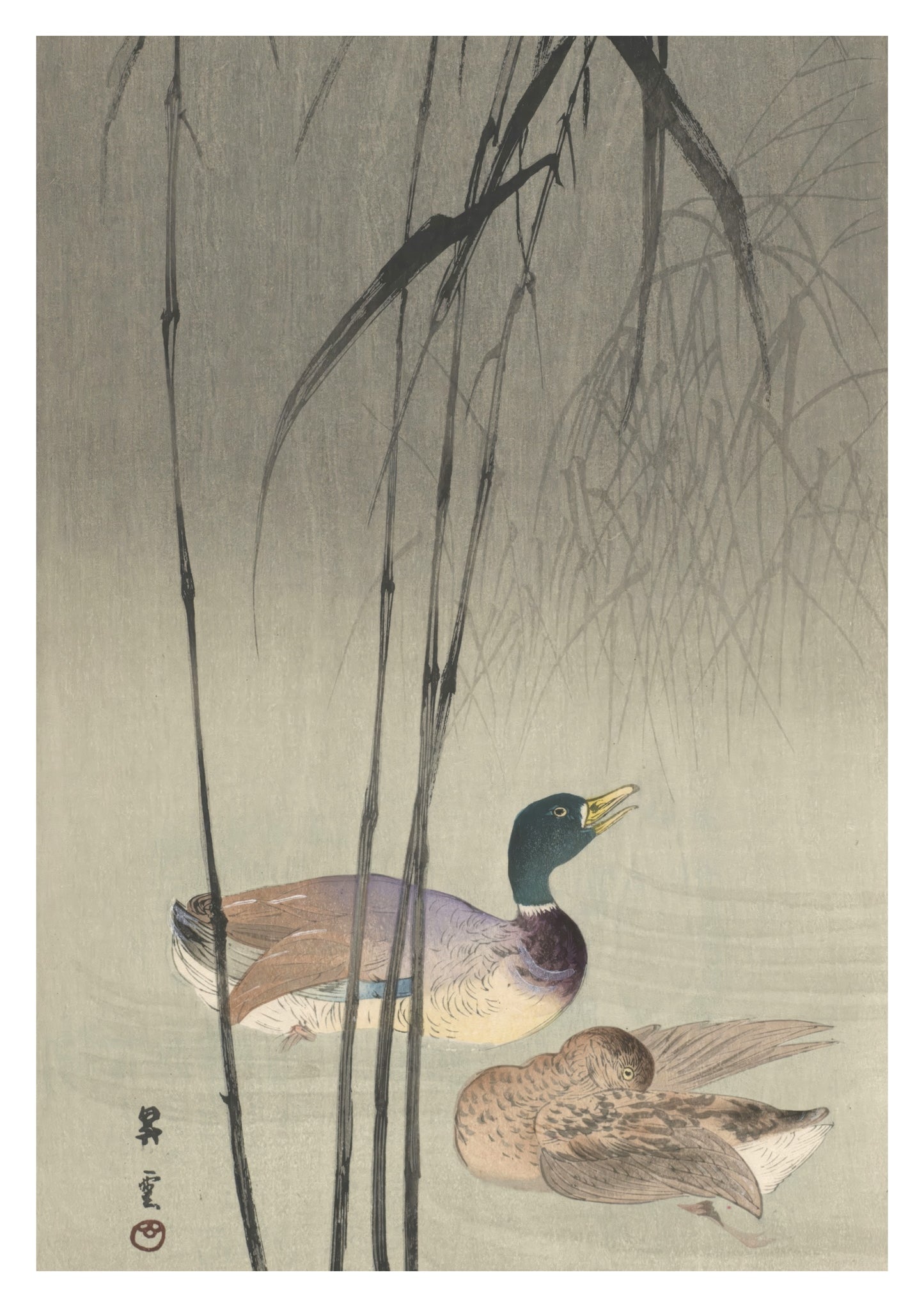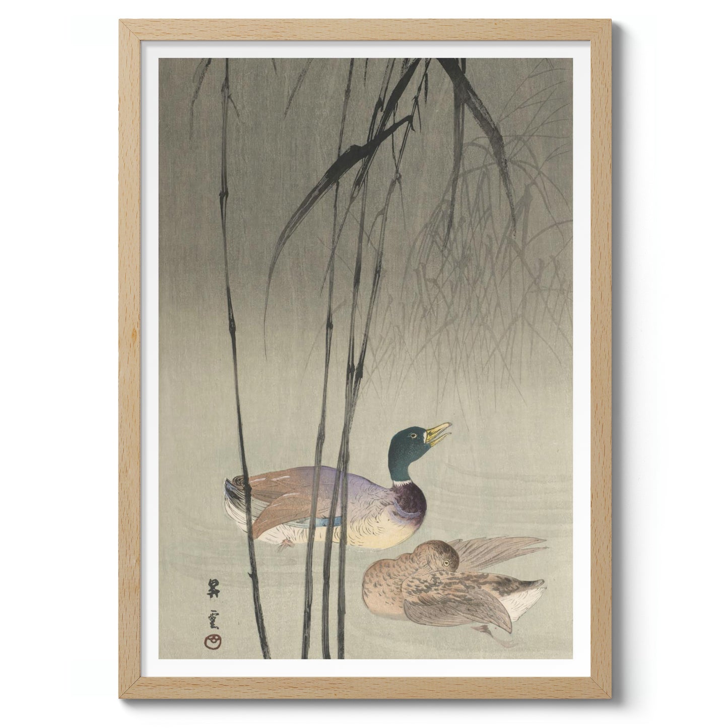 This traditional Japanese woodblock poster, "Duck and Bamboo" by Yamamoto Shoun, beautifully depicts a serene pond scene at dusk. Featuring a pair of mallard ducks swimming amid slender reeds, the artwork captures tranquility with muted beige and grey tones, characteristic of the Shin-Hanga style. This 1906 piece embodies the delicate interplay between nature and traditional artistry.