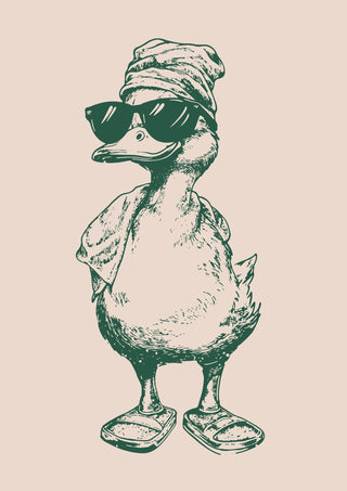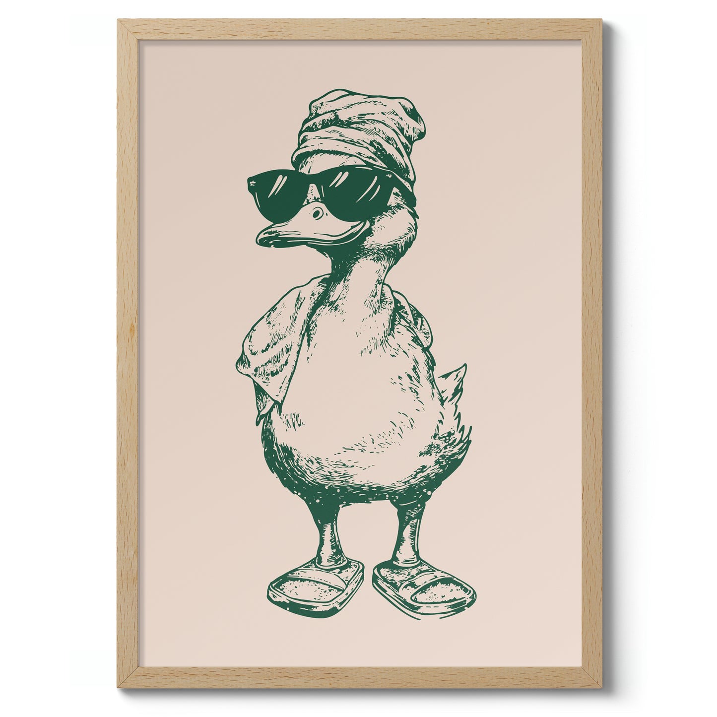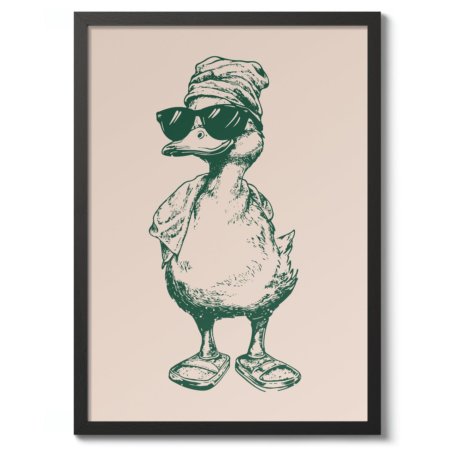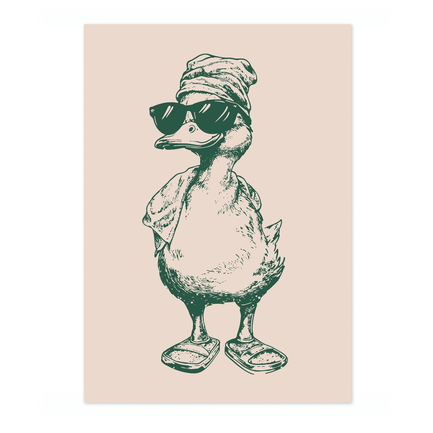 This playful "Duck Bath" poster features a stylish duckling donning sunglasses, a towel, and a beanie, set against a beige backdrop. The cartoon illustration captures a whimsical, bathroom-themed vibe. Perfect for adding a touch of humor and charm to your space, this print highlights delightful details and a relaxed duck personality. Ideal for children's rooms or playful decor.