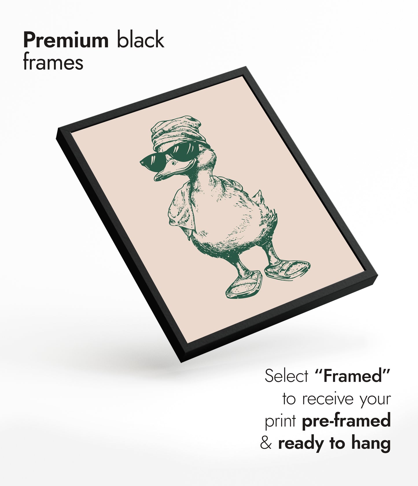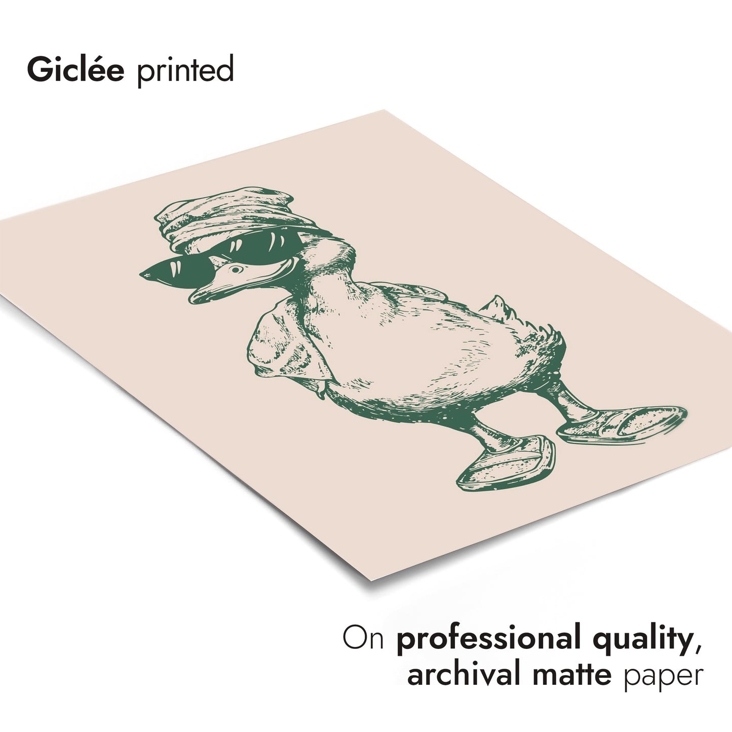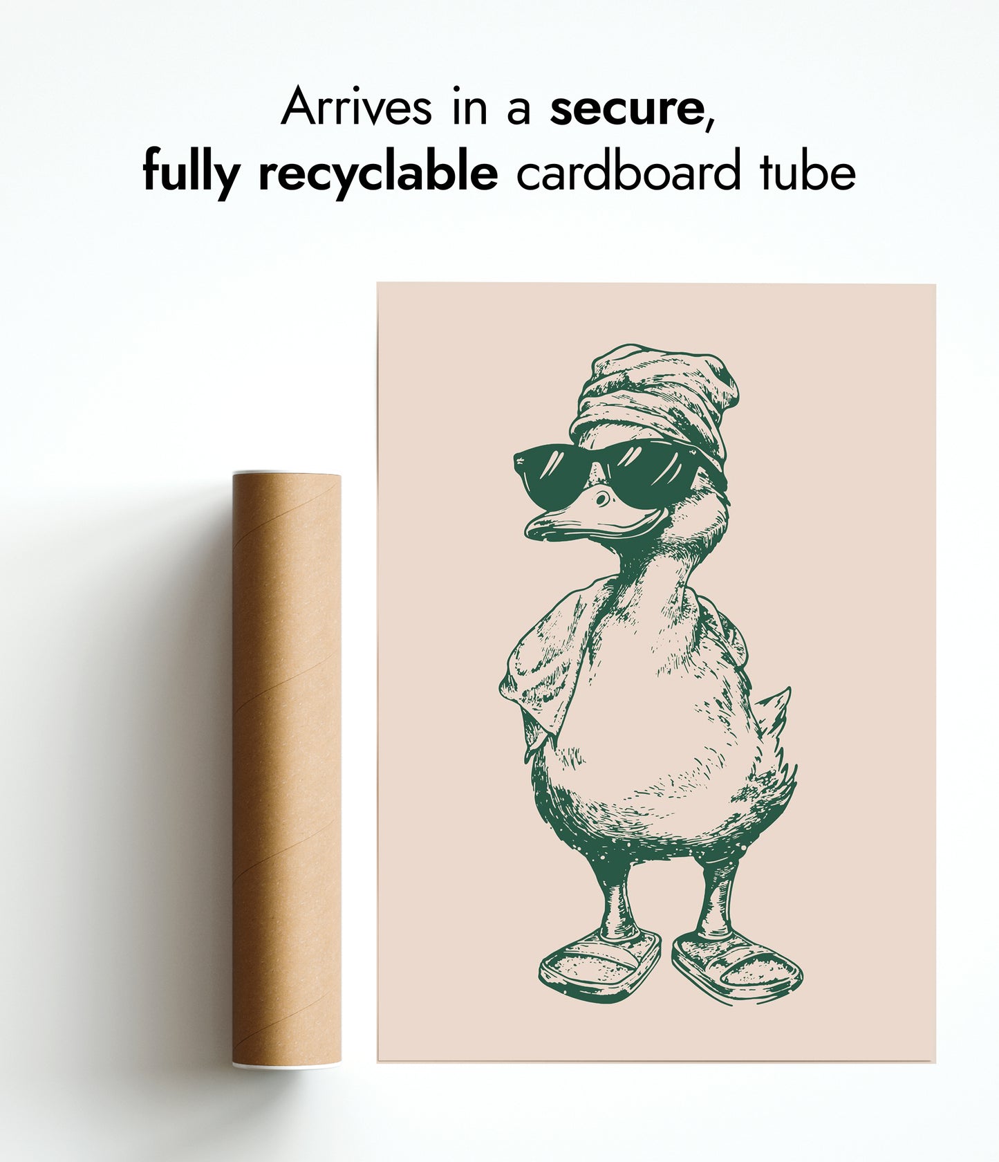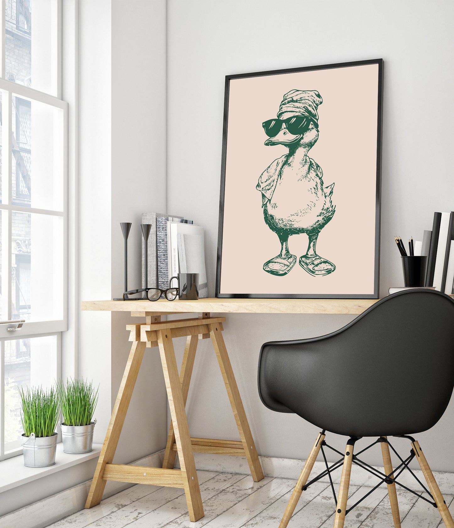 This playful "Duck Bath" poster features a stylish duckling donning sunglasses, a towel, and a beanie, set against a beige backdrop. The cartoon illustration captures a whimsical, bathroom-themed vibe. Perfect for adding a touch of humor and charm to your space, this print highlights delightful details and a relaxed duck personality. Ideal for children's rooms or playful decor.