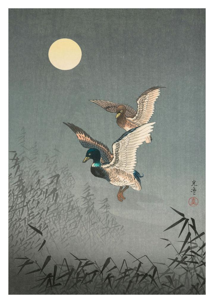 This traditional Japanese woodblock poster by Tsuchiya Koitsu features two ducks in flight under a full moon. The serene night scene showcases the meticulous detail of the ducks' plumage and the delicate reeds and bamboo below. Ideal for lovers of classic Japanese art and nature-themed decor, this exquisite illustration embodies calmness and timeless beauty.