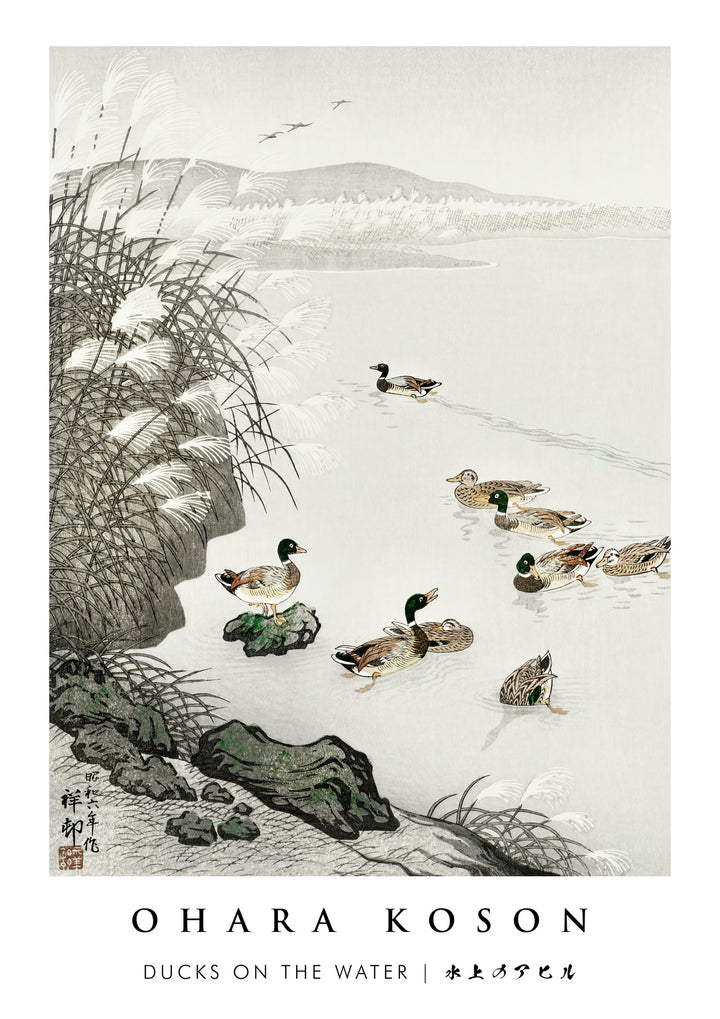 Capture the serene beauty of nature with this Ohara Koson "Ducks on the Water" poster. This traditional Japanese woodblock print showcases a tranquil scene of ducks gliding across a placid lake, surrounded by tall grasses and gentle hills. Ideal for lovers of Ukiyo-e and landscape art, this piece epitomizes harmony and natural elegance.