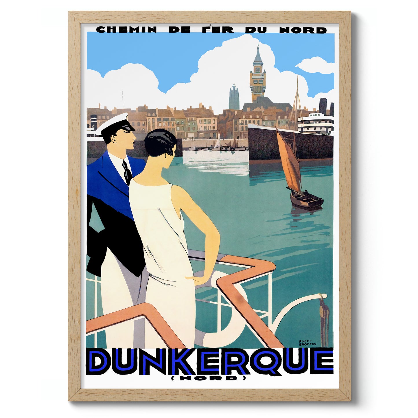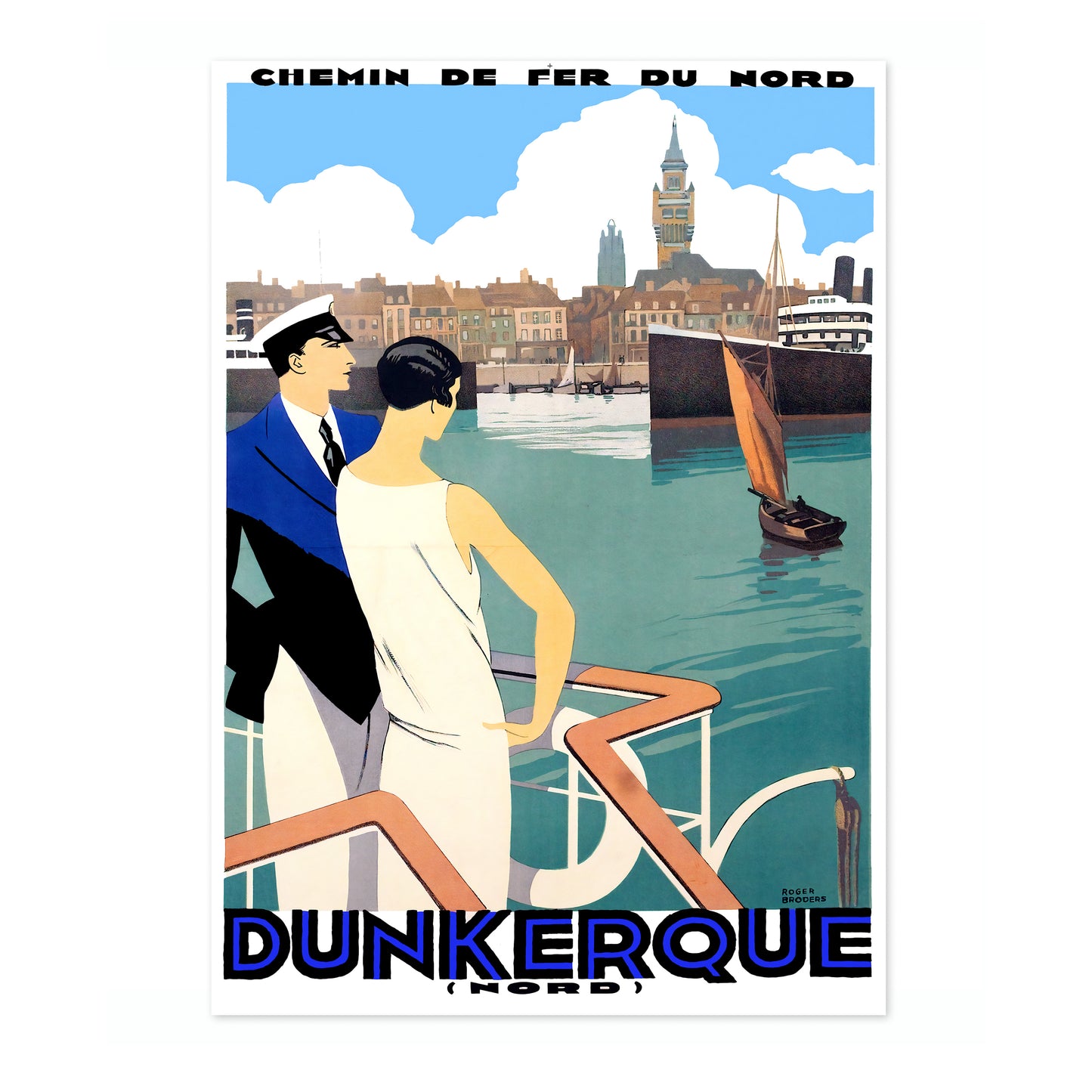 This vintage Dunkirk travel poster beautifully captures a scenic view of the harbor. Featuring two figures aboard a ship, the illustration showcases the cityscape of Dunkirk, France, with boats gently drifting in the bay. The bold, minimalist style and vibrant colours emphasize the bustling port and tranquil sea, making it an ideal addition to a nautical-themed or travel-inspired decor.