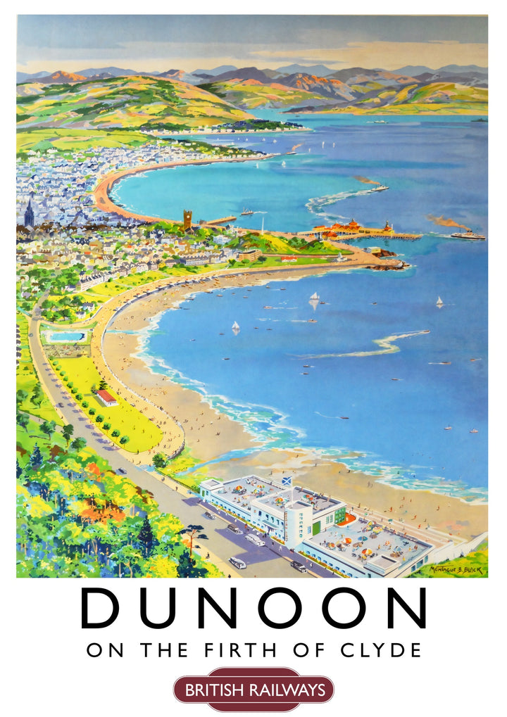 Capture the serene beauty of the Scottish coastline with this vintage-style Dunoon poster. Featuring a vibrant illustration of the seaside village on the Firth of Clyde, this artwork highlights the inviting beach, picturesque bay, and charming townscape. Perfect for lovers of travel and British railway history, this print adds a nostalgic touch to any decor.