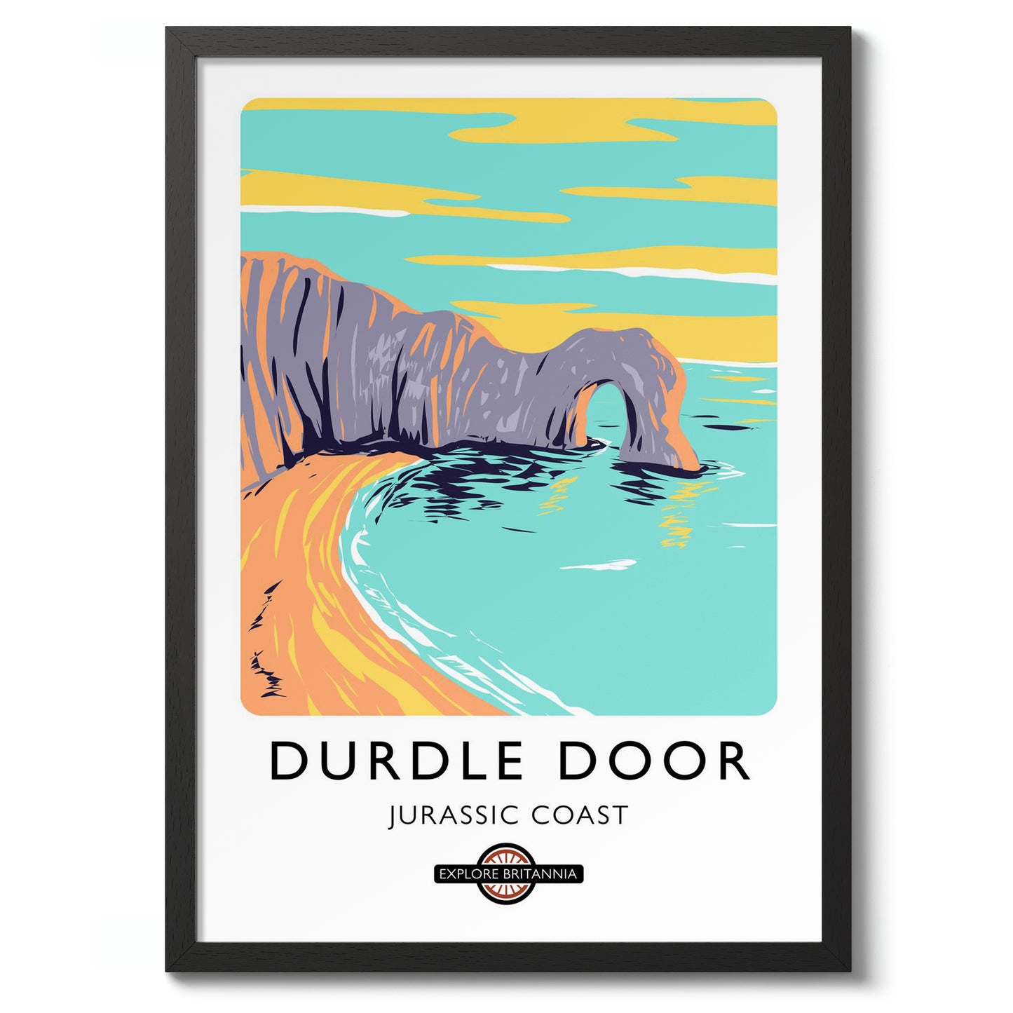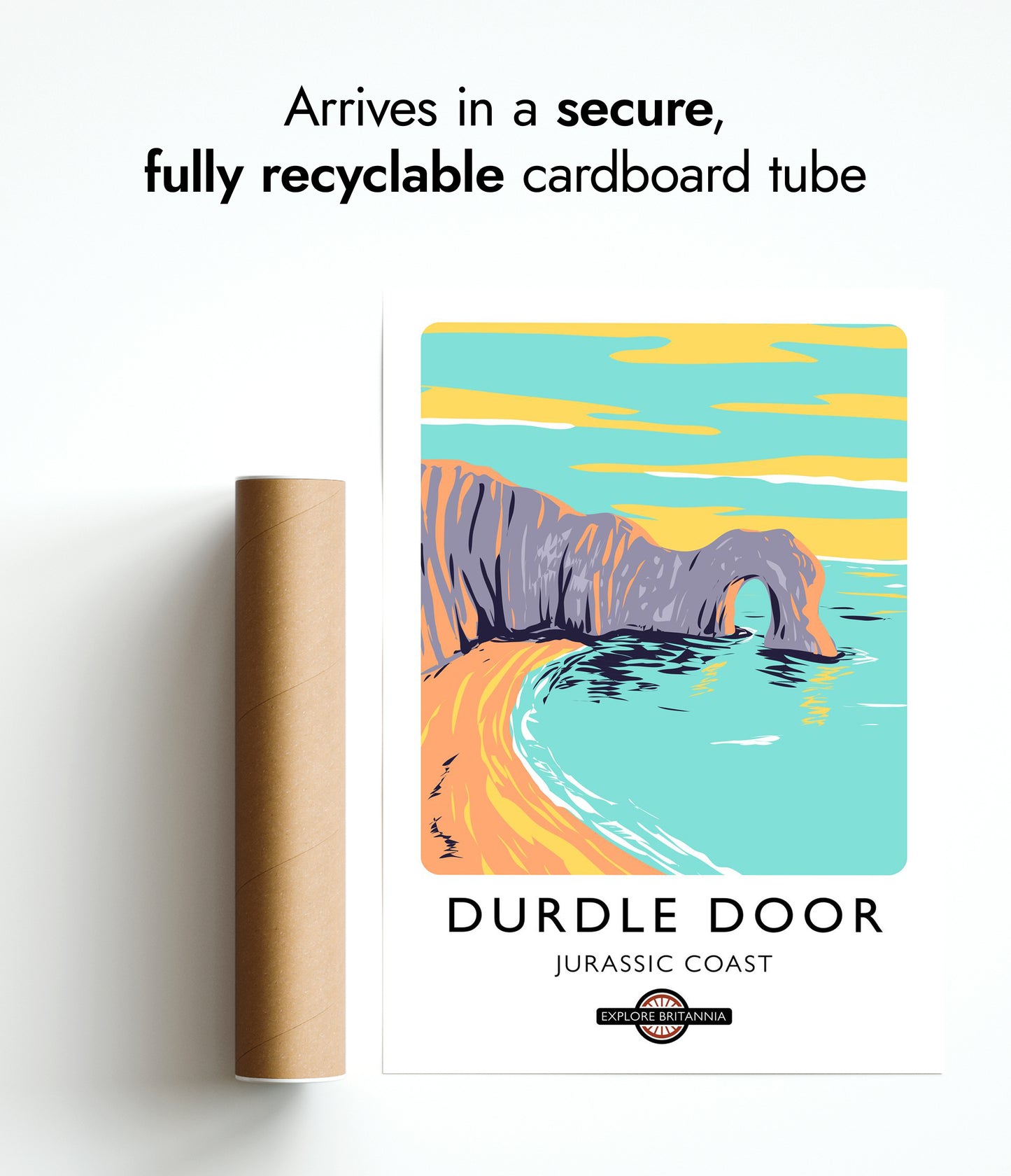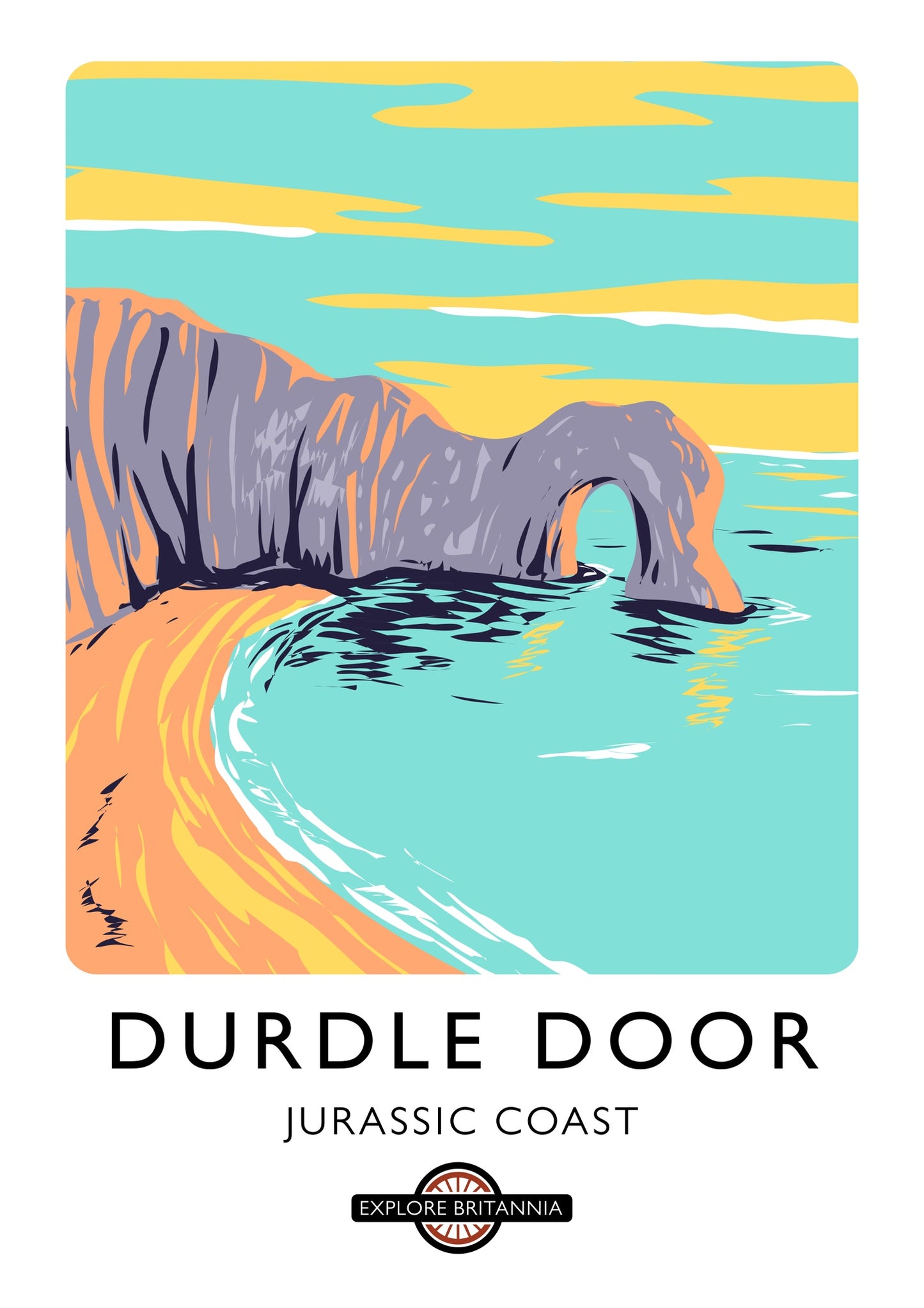 This vibrant poster of Durdle Door beautifully depicts the iconic limestone arch along England's Jurassic Coast. Featuring bold colors and crisp graphic lines, it captures the natural beauty of the beach, sea, and cliffs. Ideal for travel enthusiasts and lovers of British landscapes, this illustration is part of an exploration of England's Areas of Outstanding Natural Beauty.