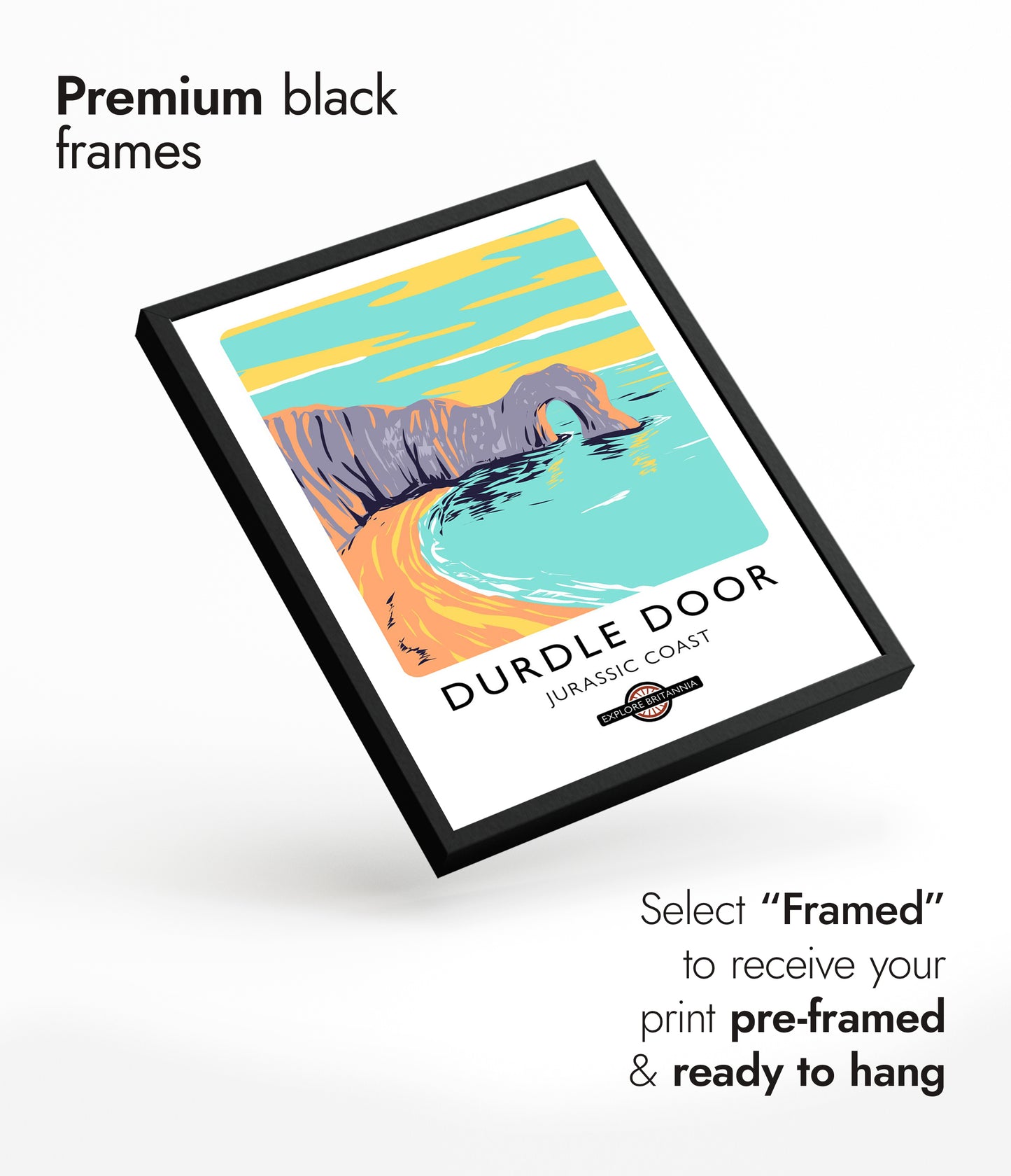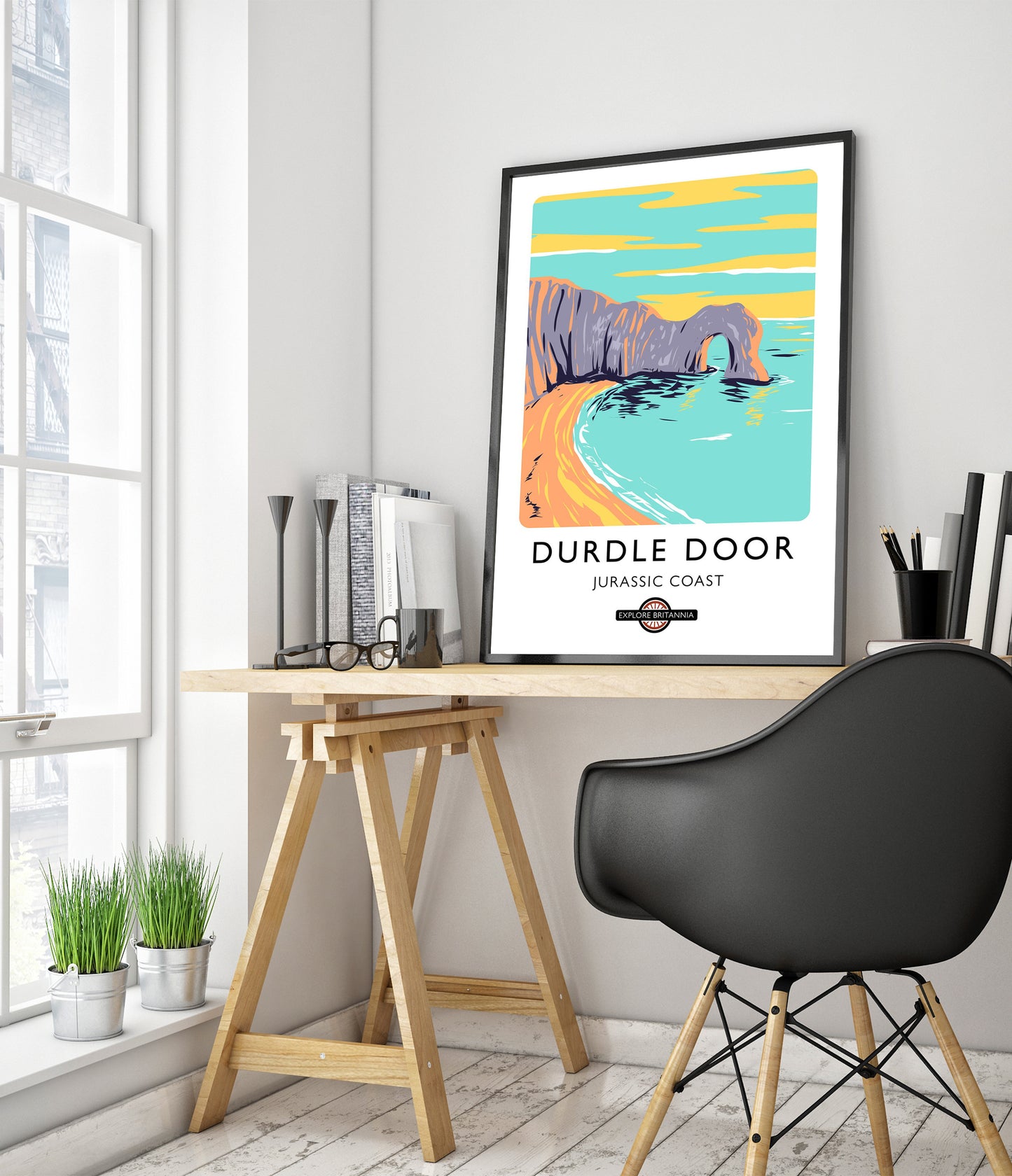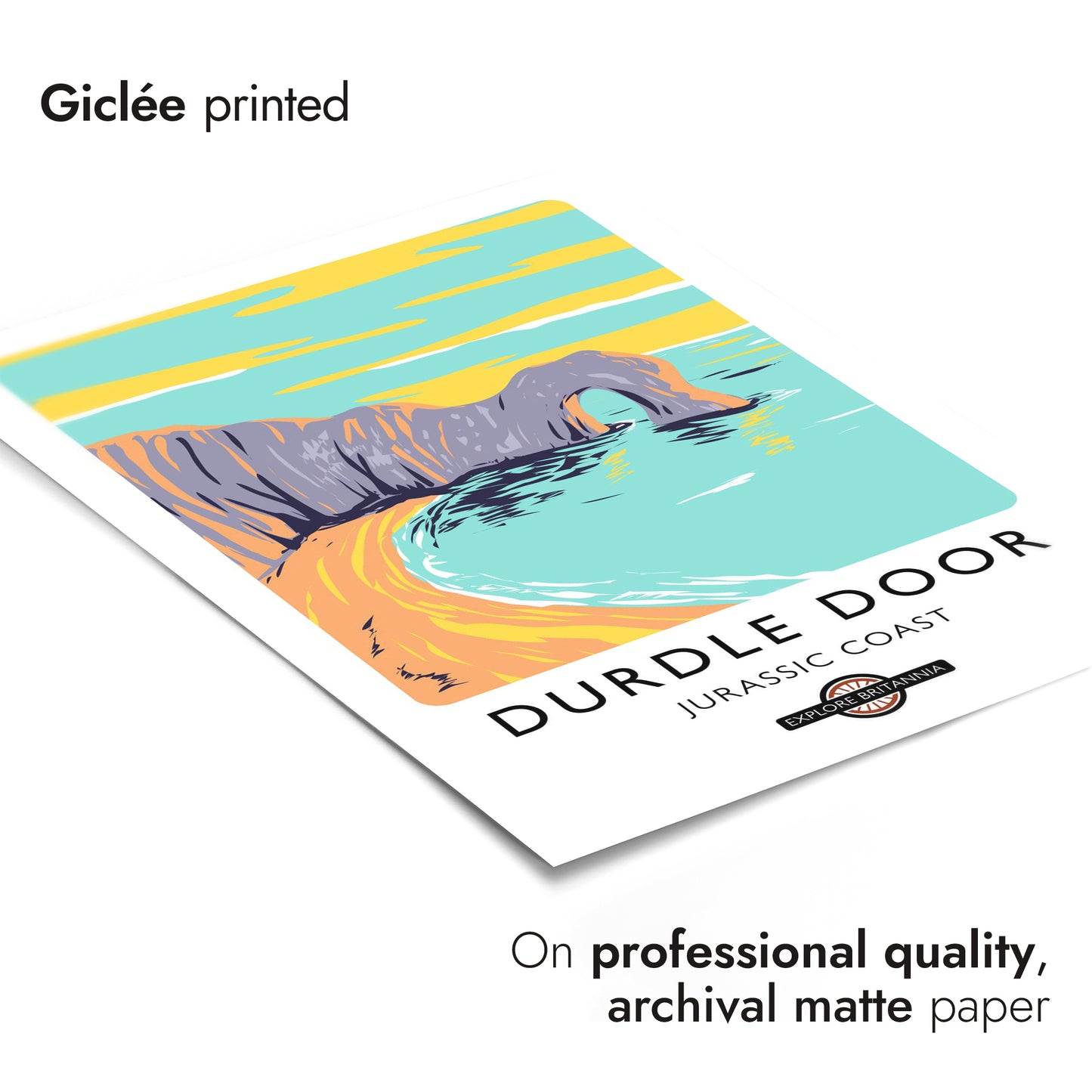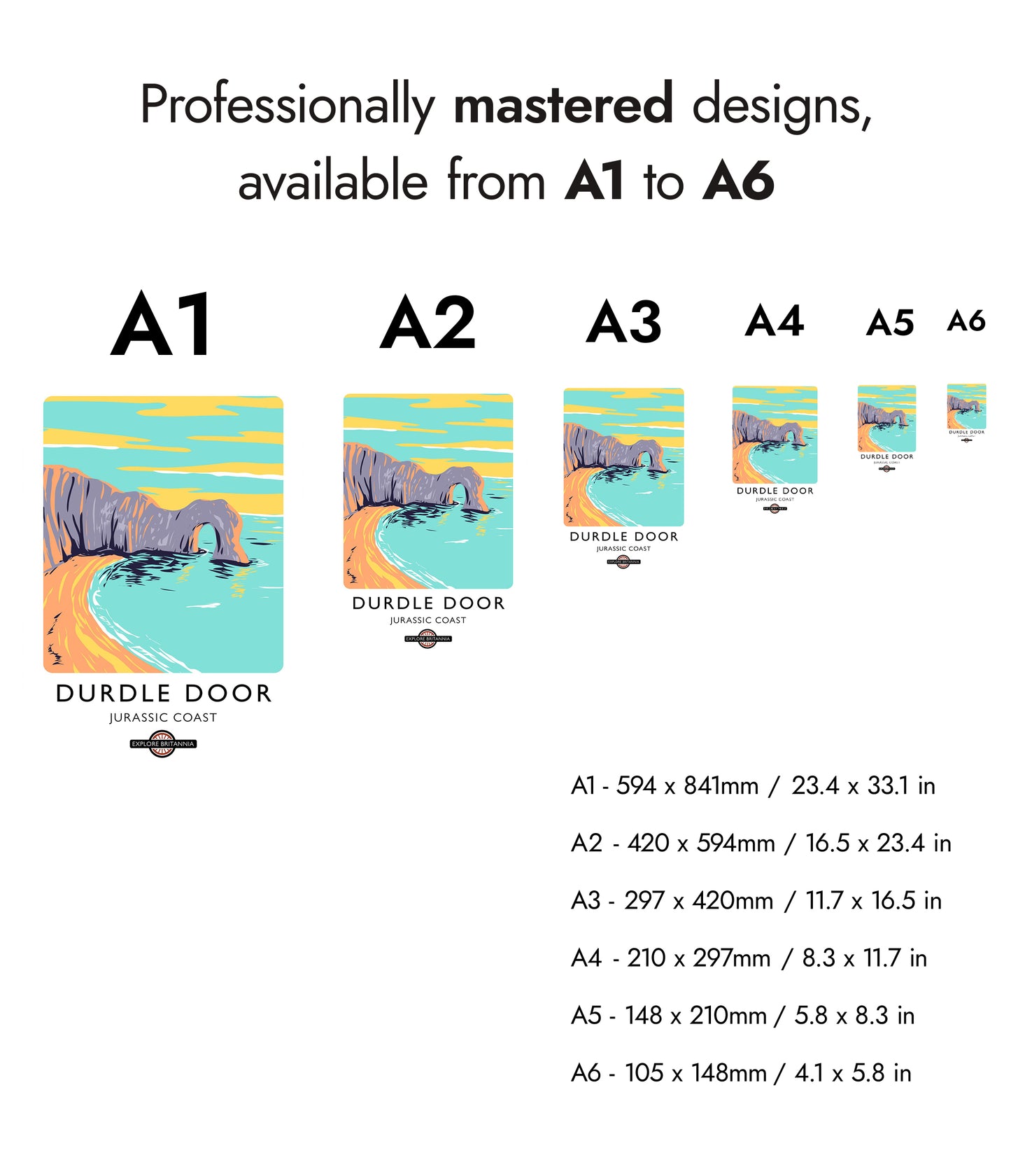 This vibrant poster of Durdle Door beautifully depicts the iconic limestone arch along England's Jurassic Coast. Featuring bold colors and crisp graphic lines, it captures the natural beauty of the beach, sea, and cliffs. Ideal for travel enthusiasts and lovers of British landscapes, this illustration is part of an exploration of England's Areas of Outstanding Natural Beauty.