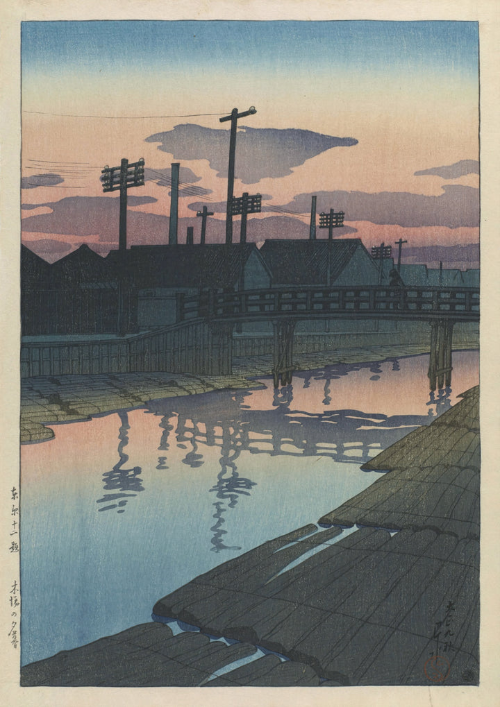 "Dusk at Kiba" by Kawase Hasui captures a serene riverside scene in traditional Japanese woodblock style. This portrait poster features a tranquil village at sunset, with reflections dancing on the water and a bridge silhouetted against the evening sky. Ideal for anyone who appreciates Ukiyo-E and classic Japanese art posters.