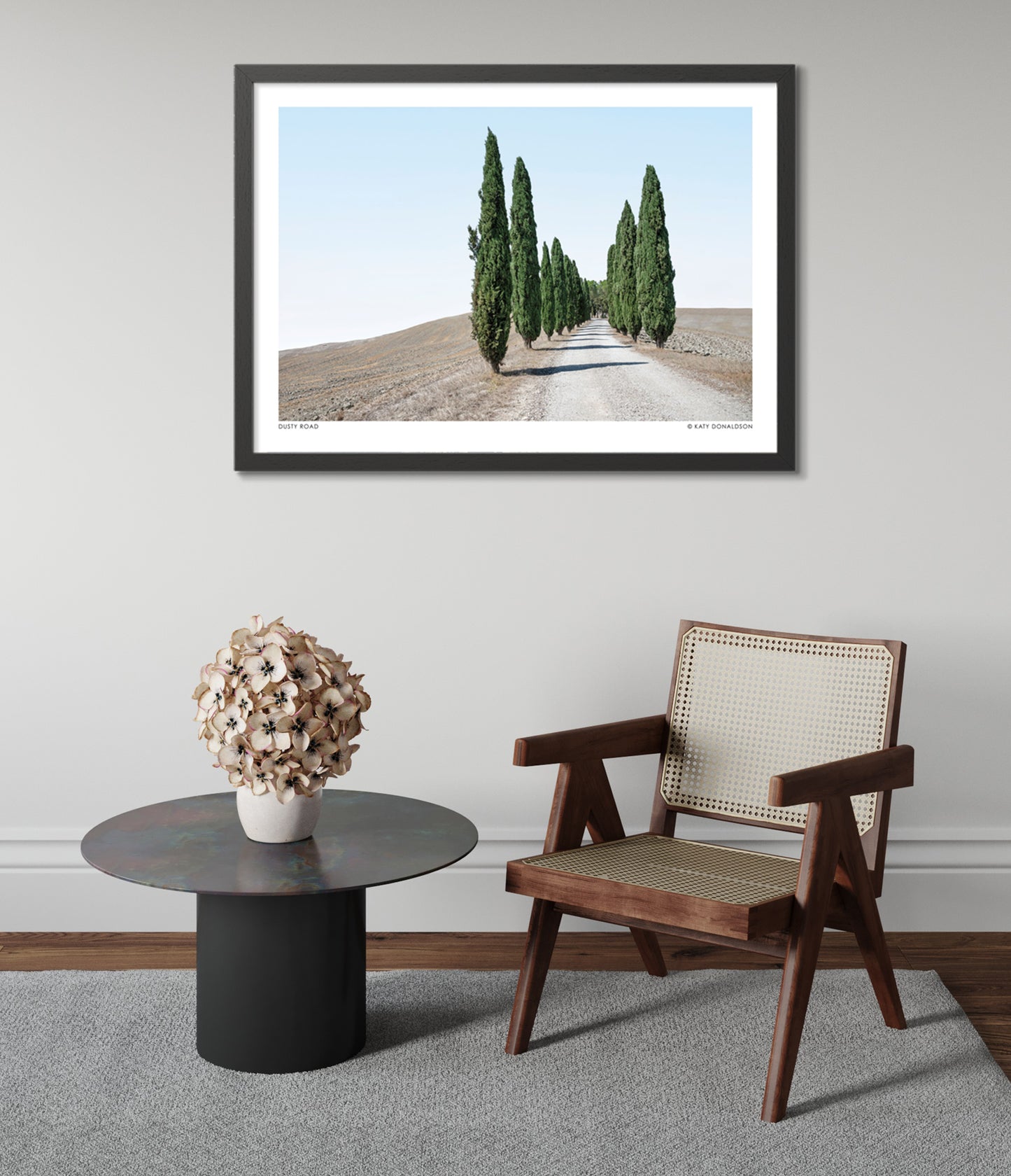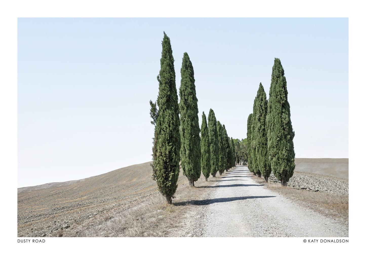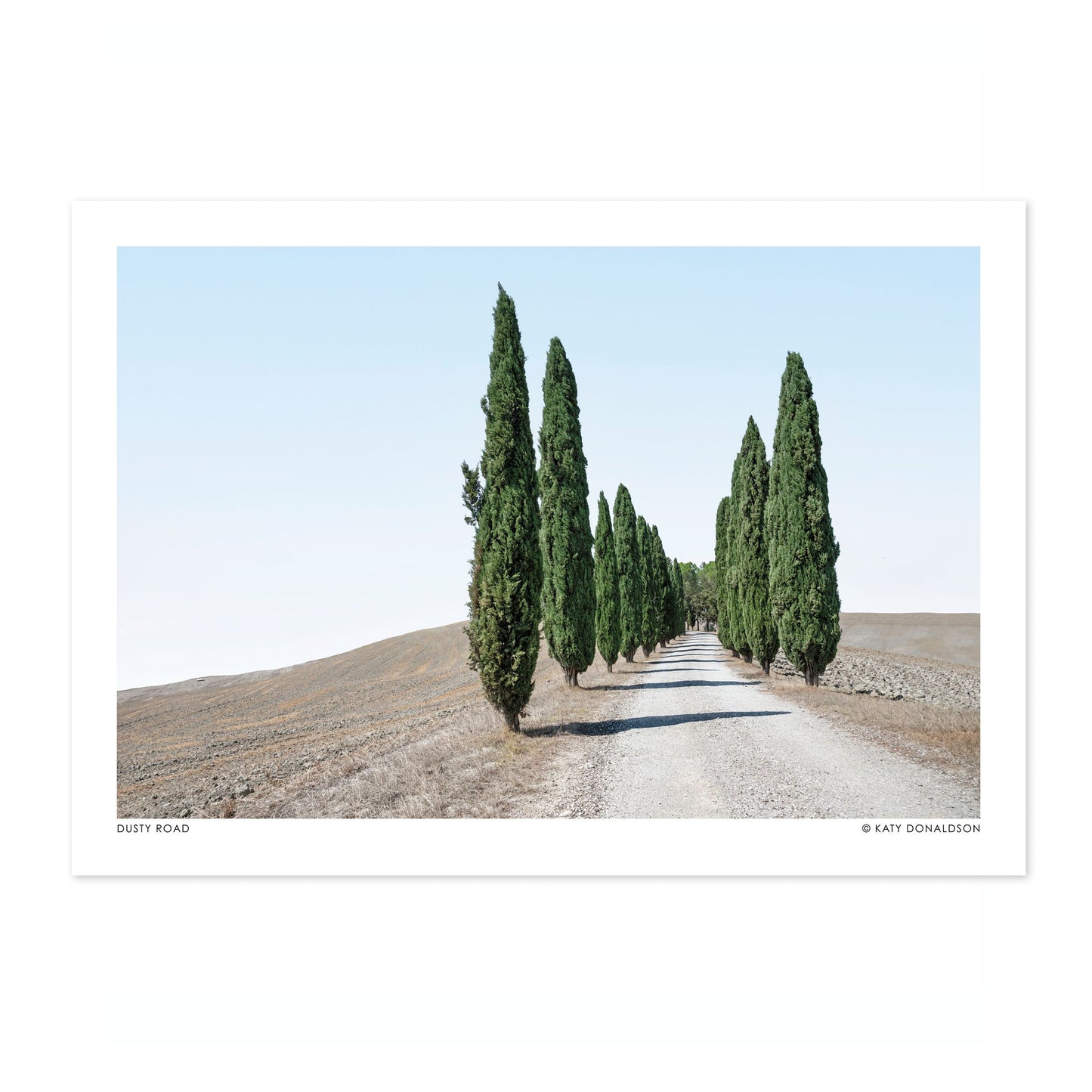 "Dusty Road Landscape" by Katy Donaldson captures a serene Italian scene with a minimalist approach. Tall, slender cypress trees line a gravel road under a clear blue sky, evoking a sense of peaceful travel. This photographic poster beautifully contrasts the rich green foliage with the muted hues of the surrounding landscape, offering a tranquil journey through Italy’s countryside.