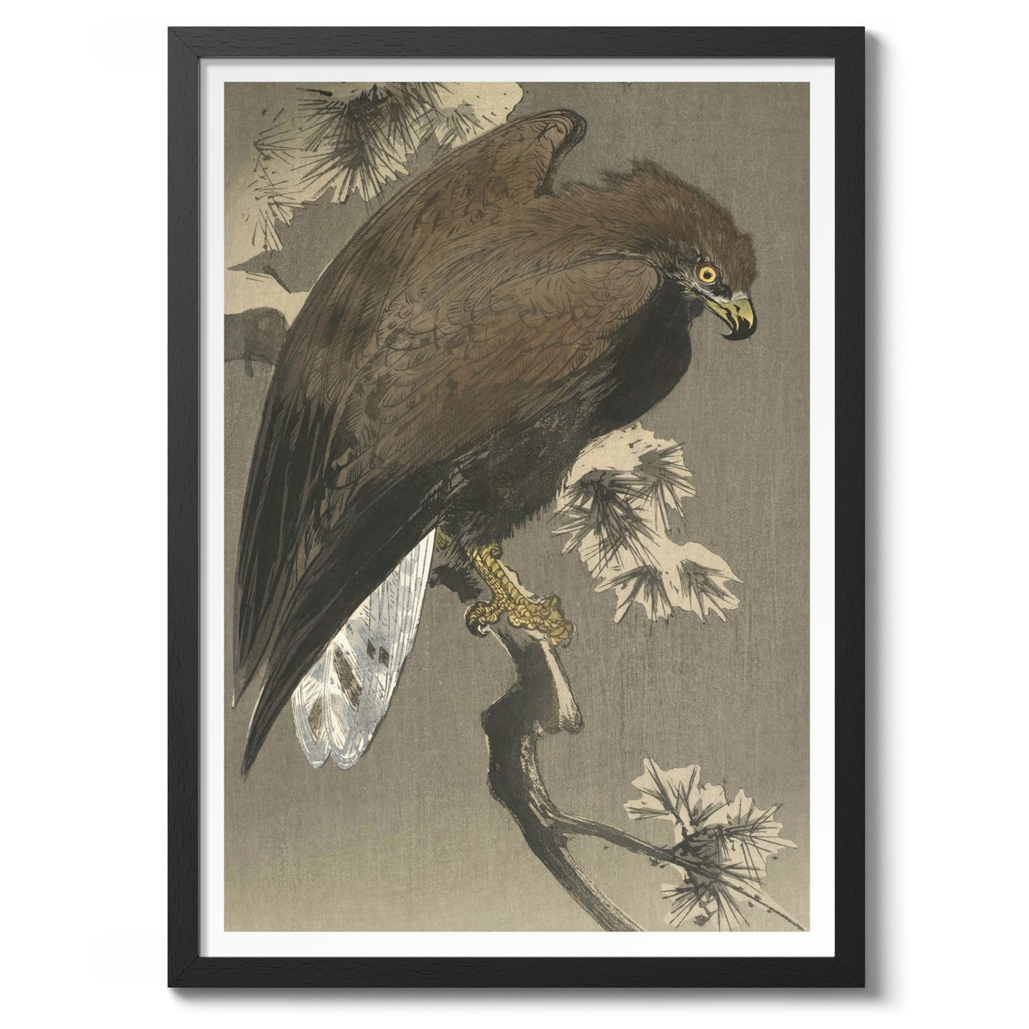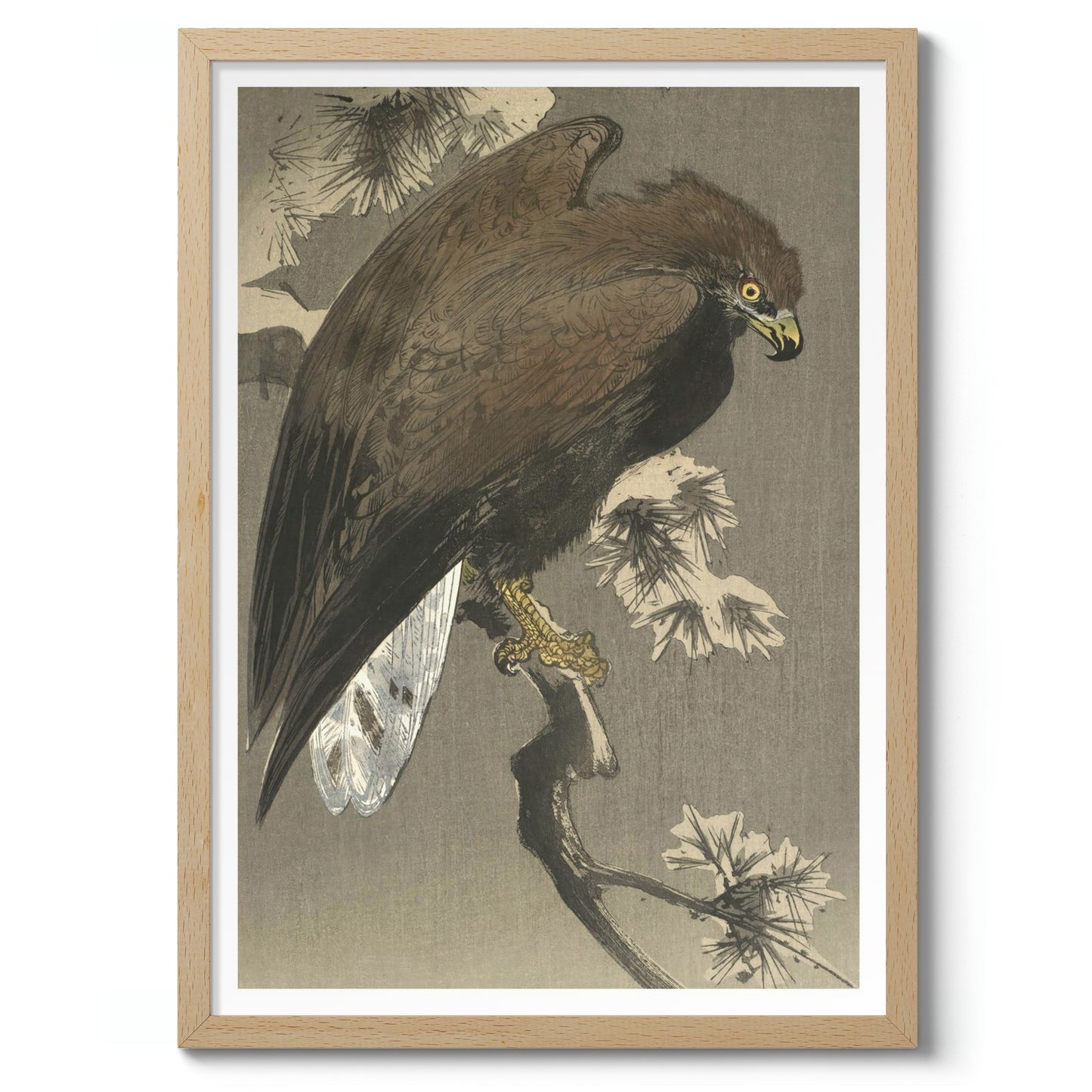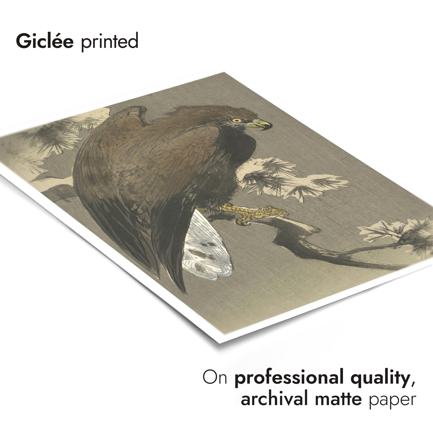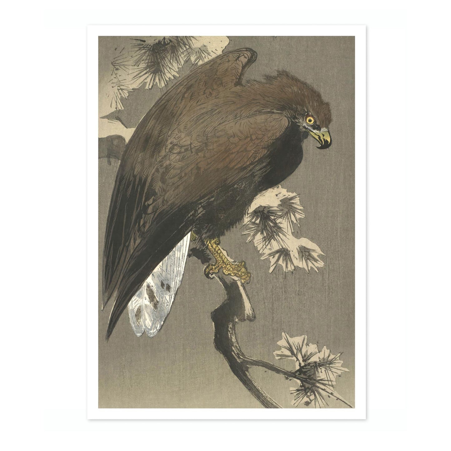 This "Eagle and Pine" poster by Yamamoto Shoun, created in 1906, showcases a majestic eagle perched on a snow-dusted pine branch. Rendered in traditional Japanese woodblock style, it features muted grey and brown tones with subtle white highlights on the feathers. The Shin-Hanga and Ukiyo-E influences are evident, offering a detailed depiction of the serene winter scene.