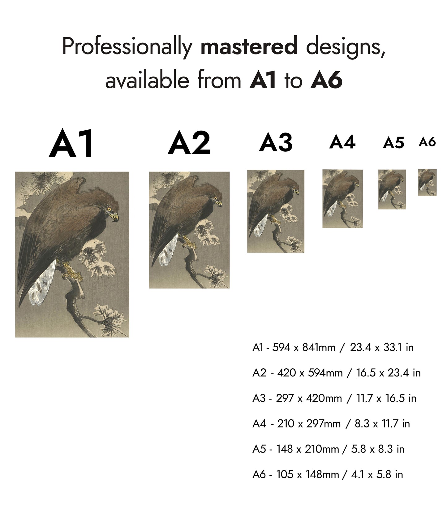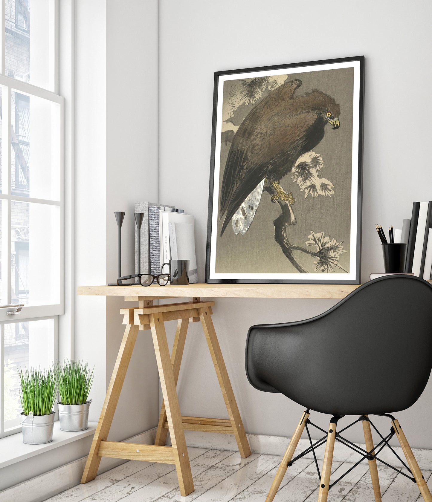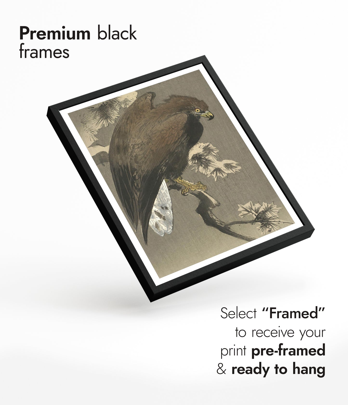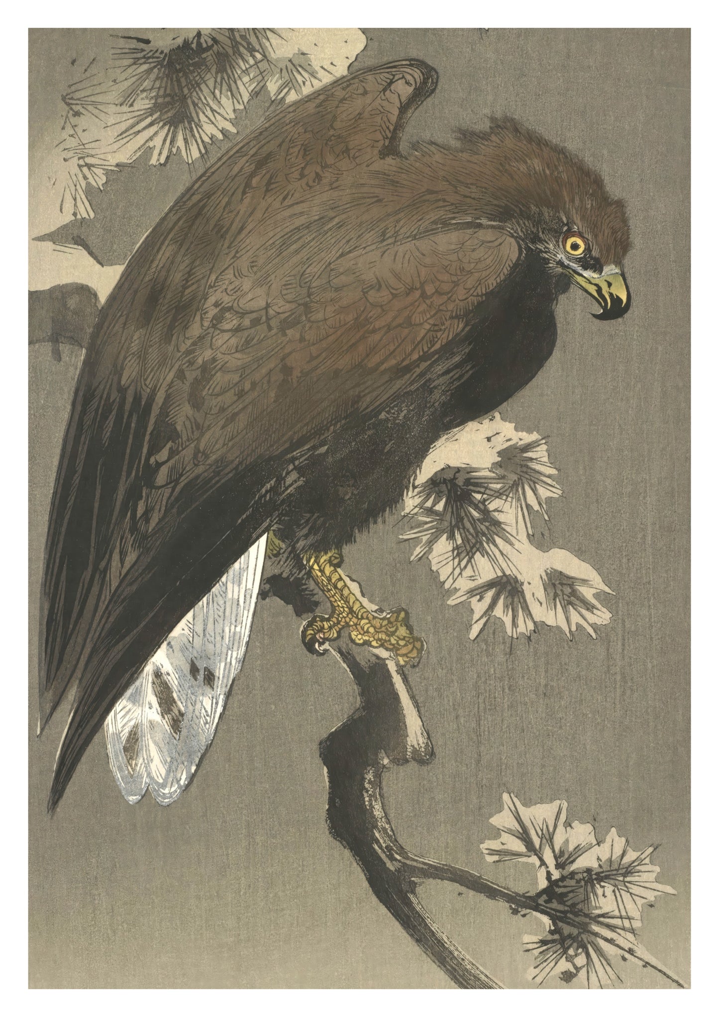 This "Eagle and Pine" poster by Yamamoto Shoun, created in 1906, showcases a majestic eagle perched on a snow-dusted pine branch. Rendered in traditional Japanese woodblock style, it features muted grey and brown tones with subtle white highlights on the feathers. The Shin-Hanga and Ukiyo-E influences are evident, offering a detailed depiction of the serene winter scene.