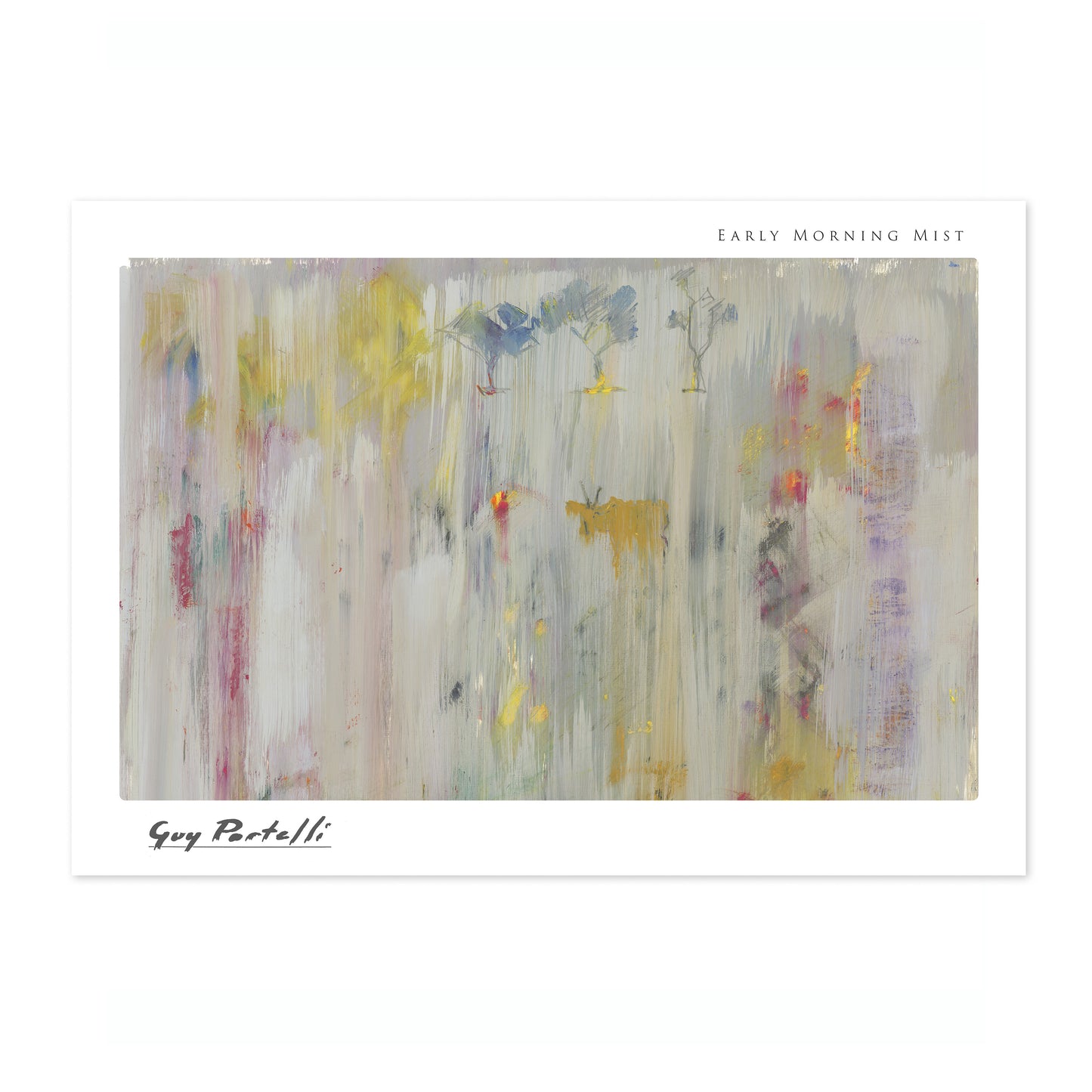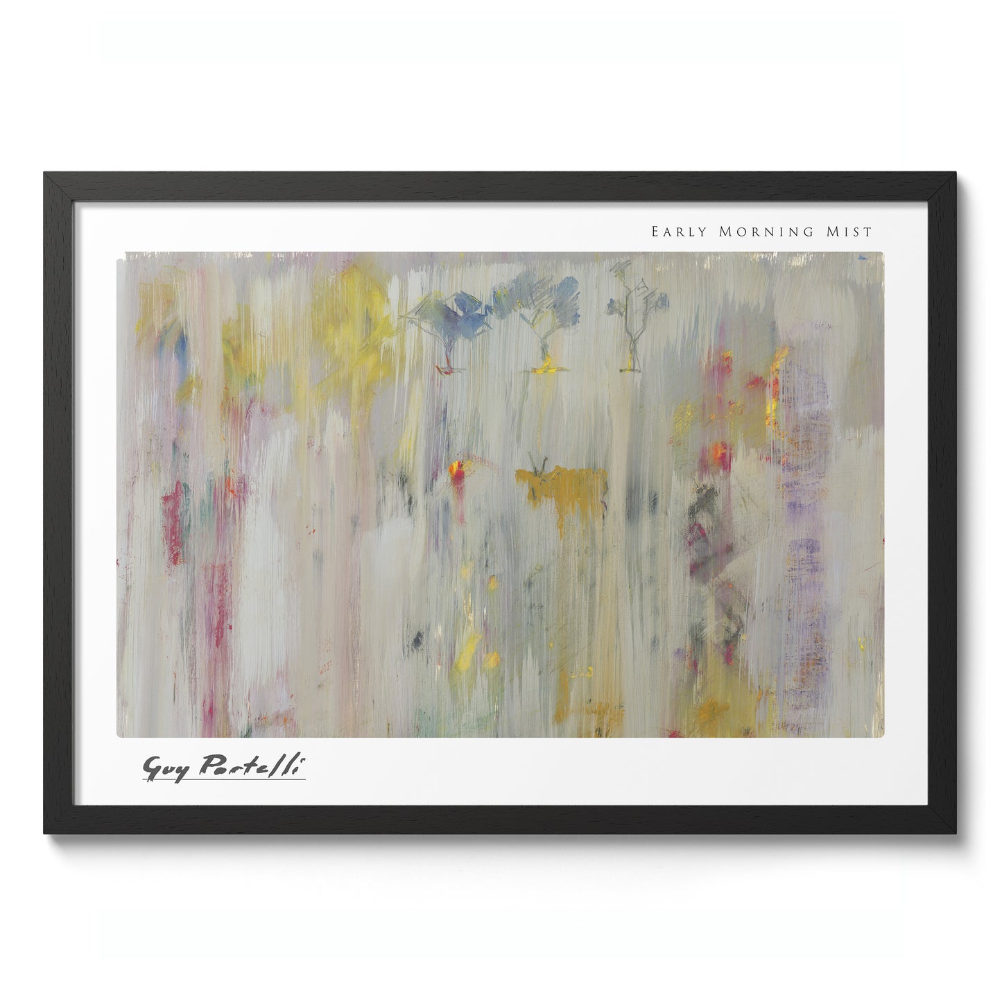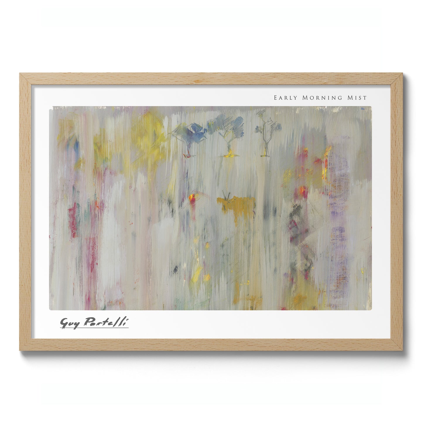 "Early Morning Mist" by Guy Portelli captures a serene, abstract landscape in watercolour. Subtle hues blend into each other, evoking the tranquility of dawn. Delicate forms suggest trees and fleeting animals, painted in a minimalist style. This nature-themed poster is perfect for creating a calm, introspective space in any room.