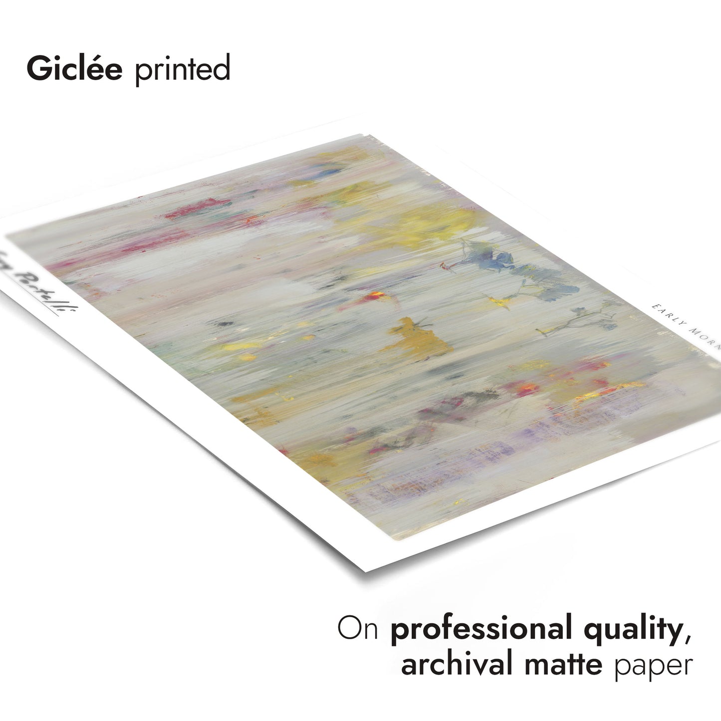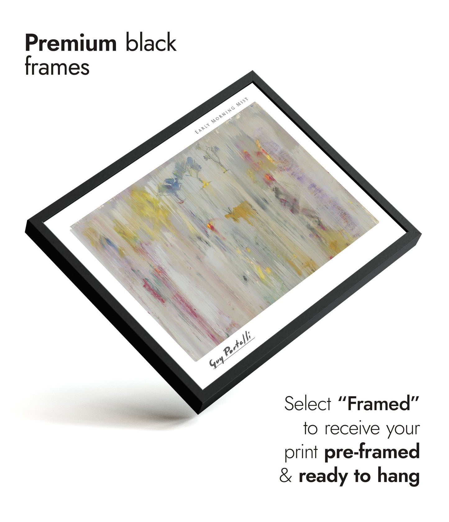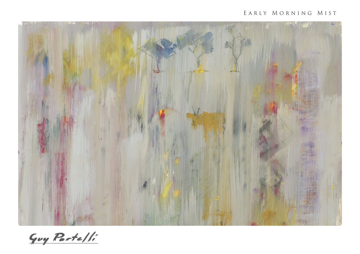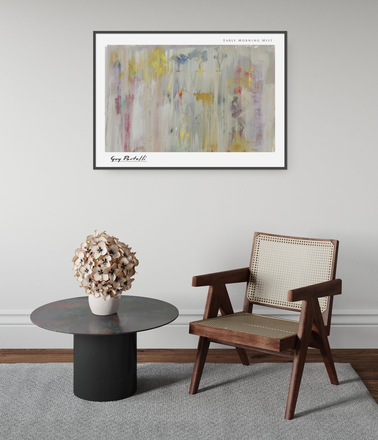 "Early Morning Mist" by Guy Portelli captures a serene, abstract landscape in watercolour. Subtle hues blend into each other, evoking the tranquility of dawn. Delicate forms suggest trees and fleeting animals, painted in a minimalist style. This nature-themed poster is perfect for creating a calm, introspective space in any room.