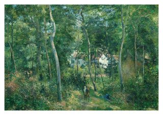 This "Edge of the Woods near l'Hermitage, Pontoise" poster by Camille Pissarro showcases a serene forest scene with lush greenery and dappled light filtering through the trees. Nestled among the foliage are quaint houses, adding a touch of rustic charm to this Impressionist landscape. Ideal for nature and art enthusiasts, this print captures the tranquil beauty of the countryside.