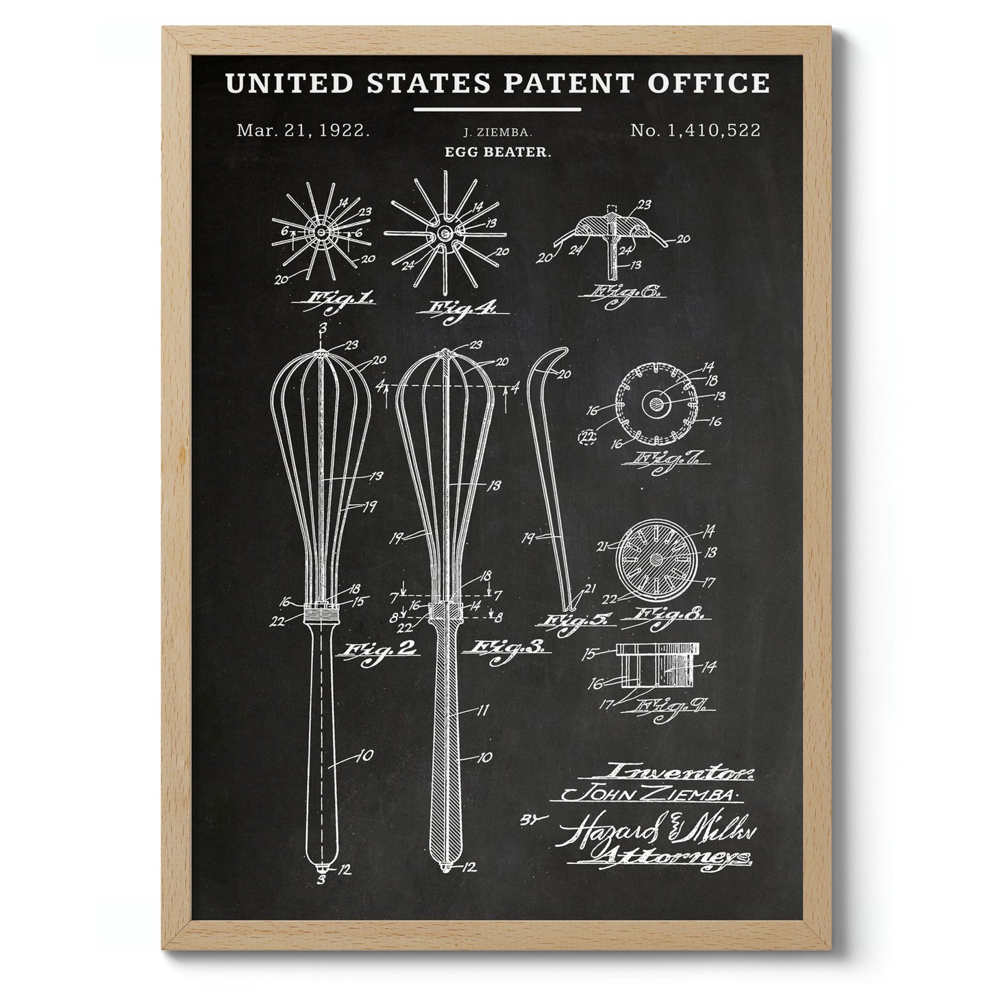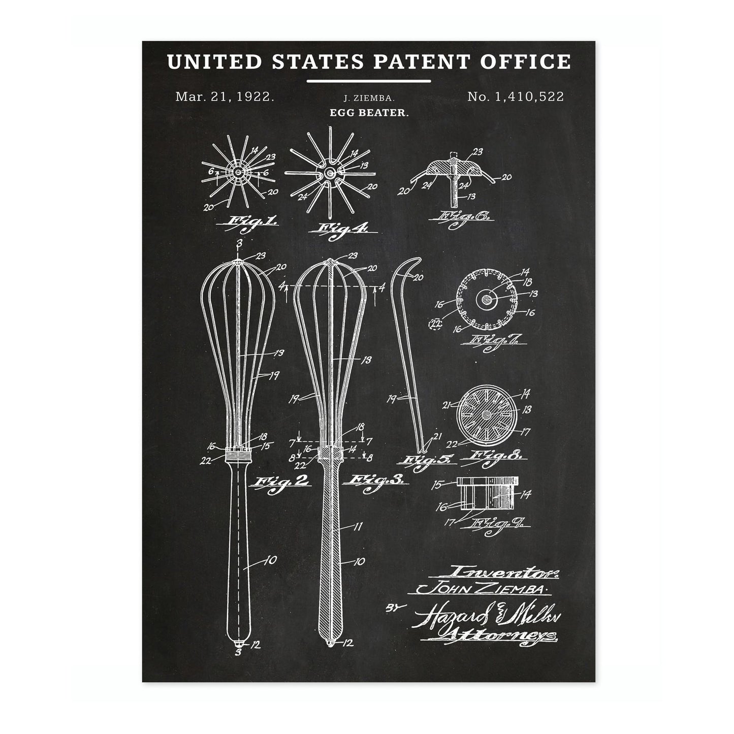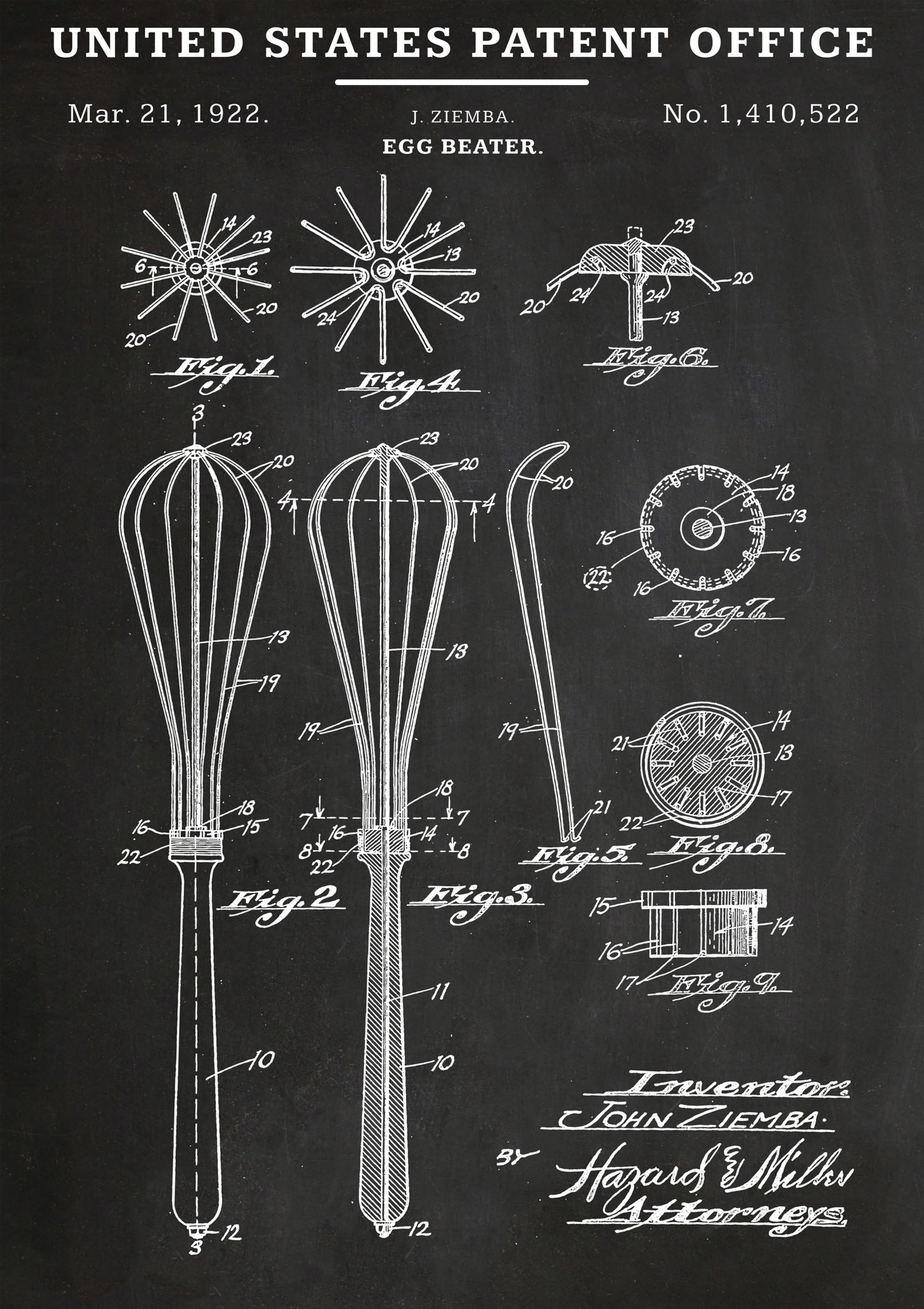 This vintage egg beater patent poster features intricate line art illustrations detailing the mechanics and design of an early 20th-century kitchen tool. Presented on a black background, the white schematic diagrams create a striking contrast, highlighting the functional artistry of this kitchen essential. Ideal for those interested in culinary history or vintage invention designs, this poster adds a timeless touch to any space.