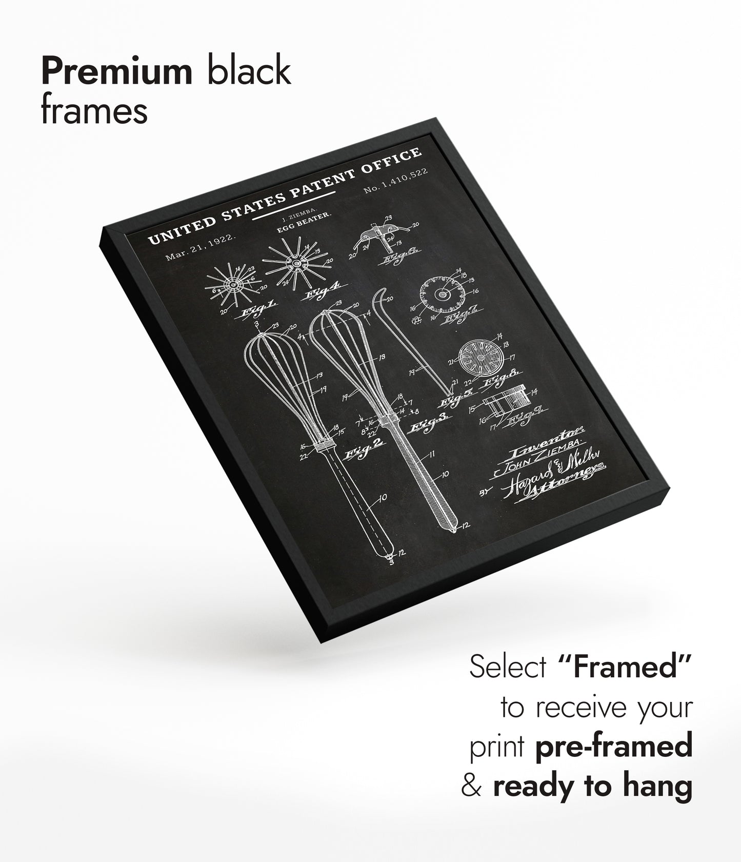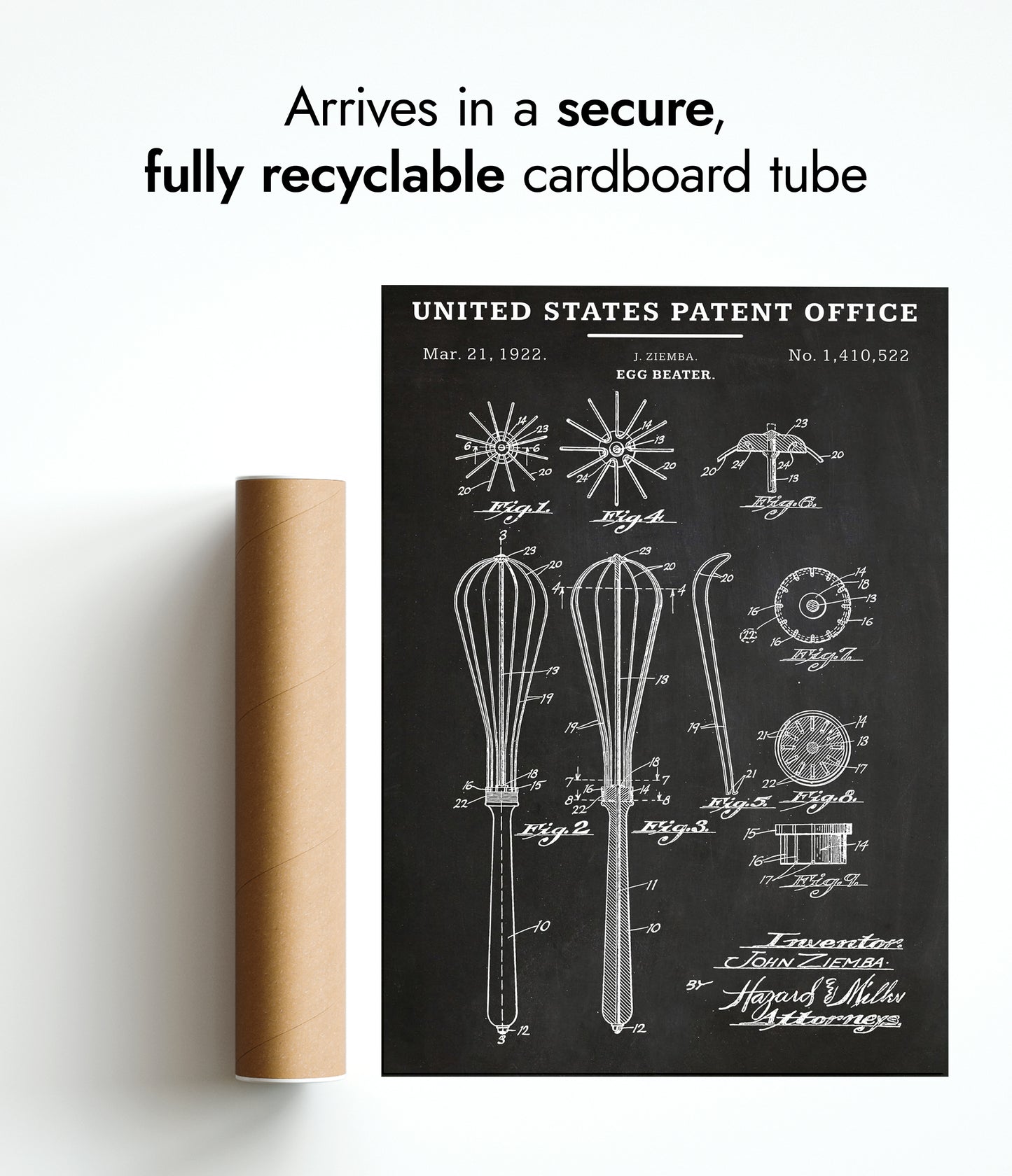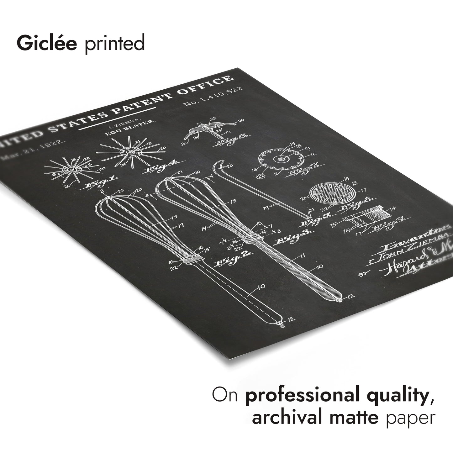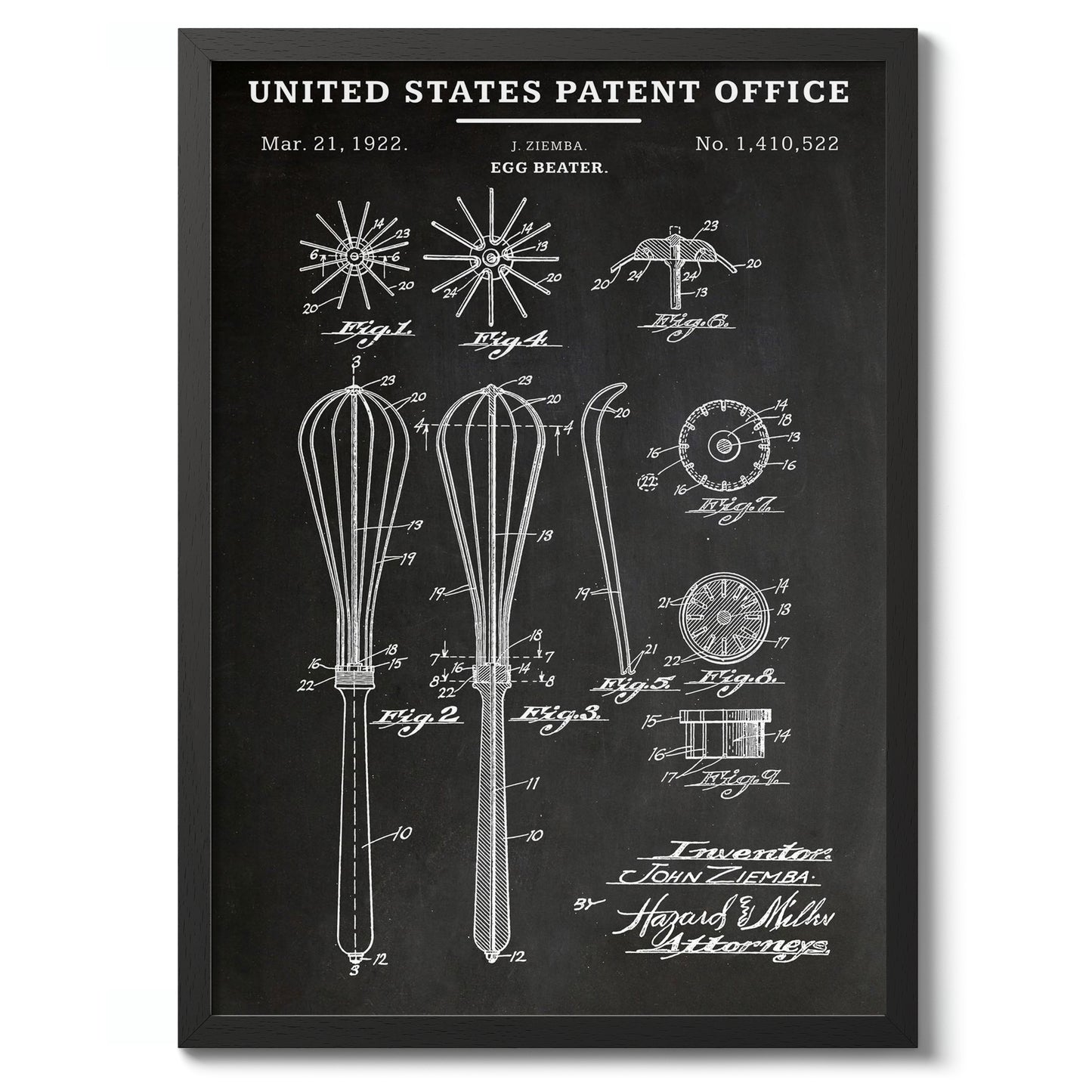 This vintage egg beater patent poster features intricate line art illustrations detailing the mechanics and design of an early 20th-century kitchen tool. Presented on a black background, the white schematic diagrams create a striking contrast, highlighting the functional artistry of this kitchen essential. Ideal for those interested in culinary history or vintage invention designs, this poster adds a timeless touch to any space.