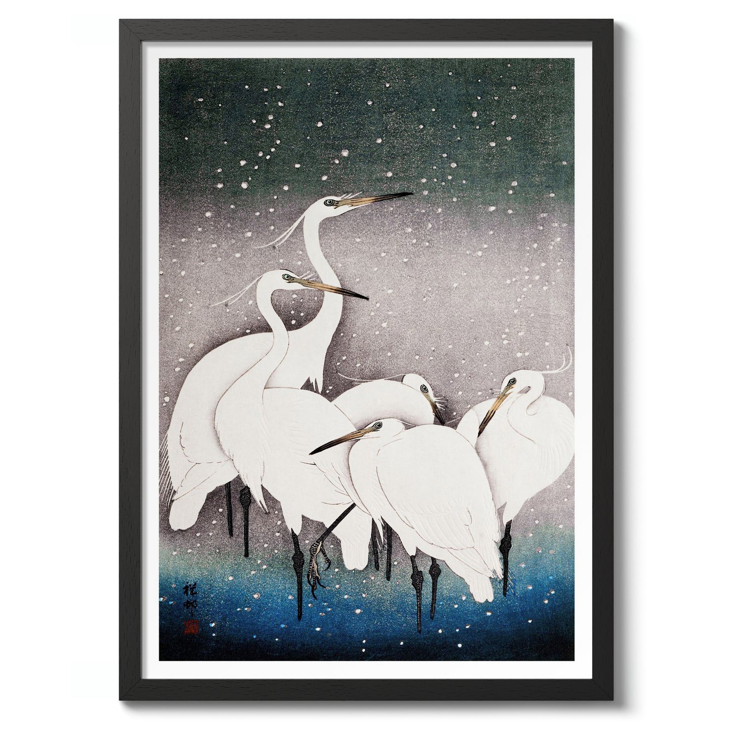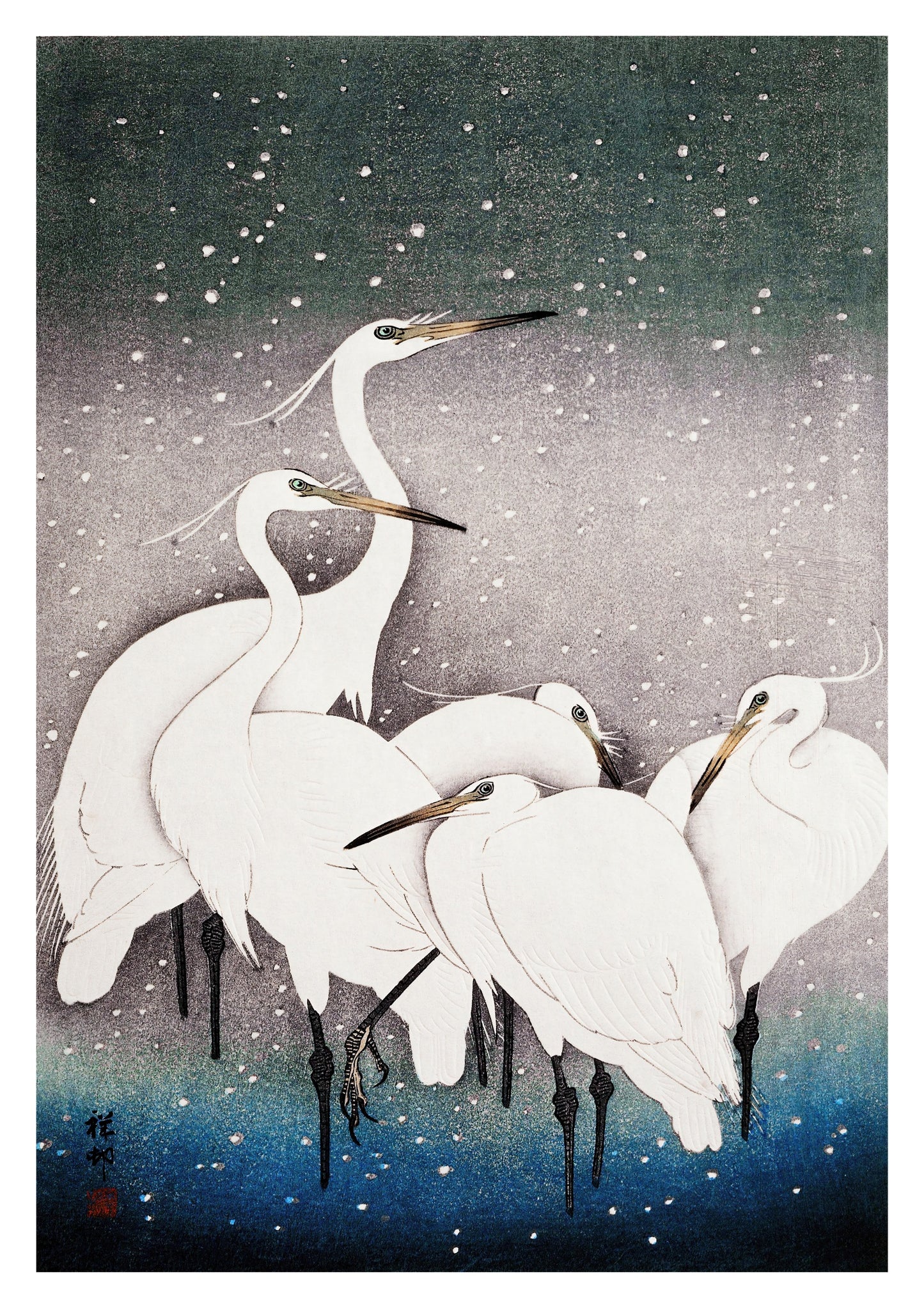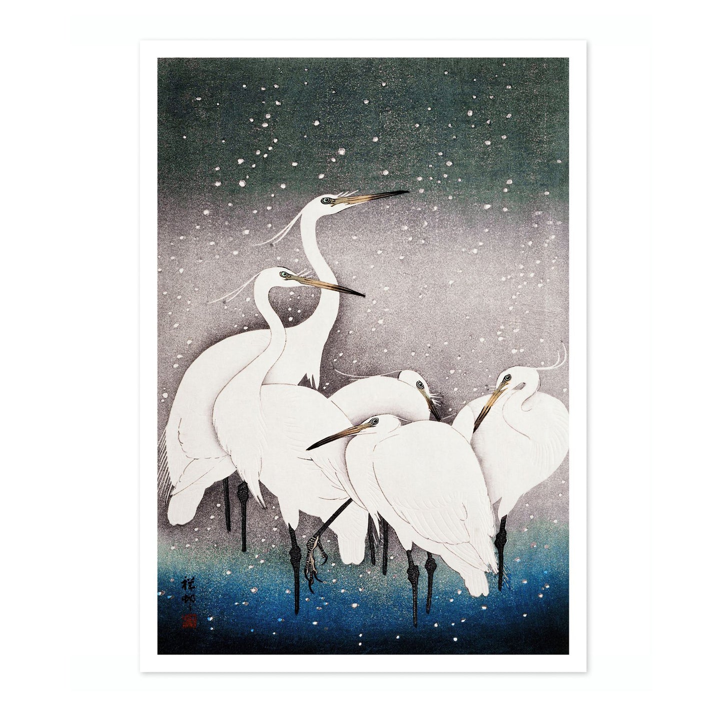 Ohara Koson's "Egrets in the Snow" poster beautifully captures a serene winter scene with elegant white egrets set against a softly falling snow backdrop. The traditional woodblock style enhances the delicate portrayal, with a gradient of white, blue, and grey hues evoking a peaceful, wintry atmosphere. Perfect for admirers of ukiyo-e and nature-themed art.