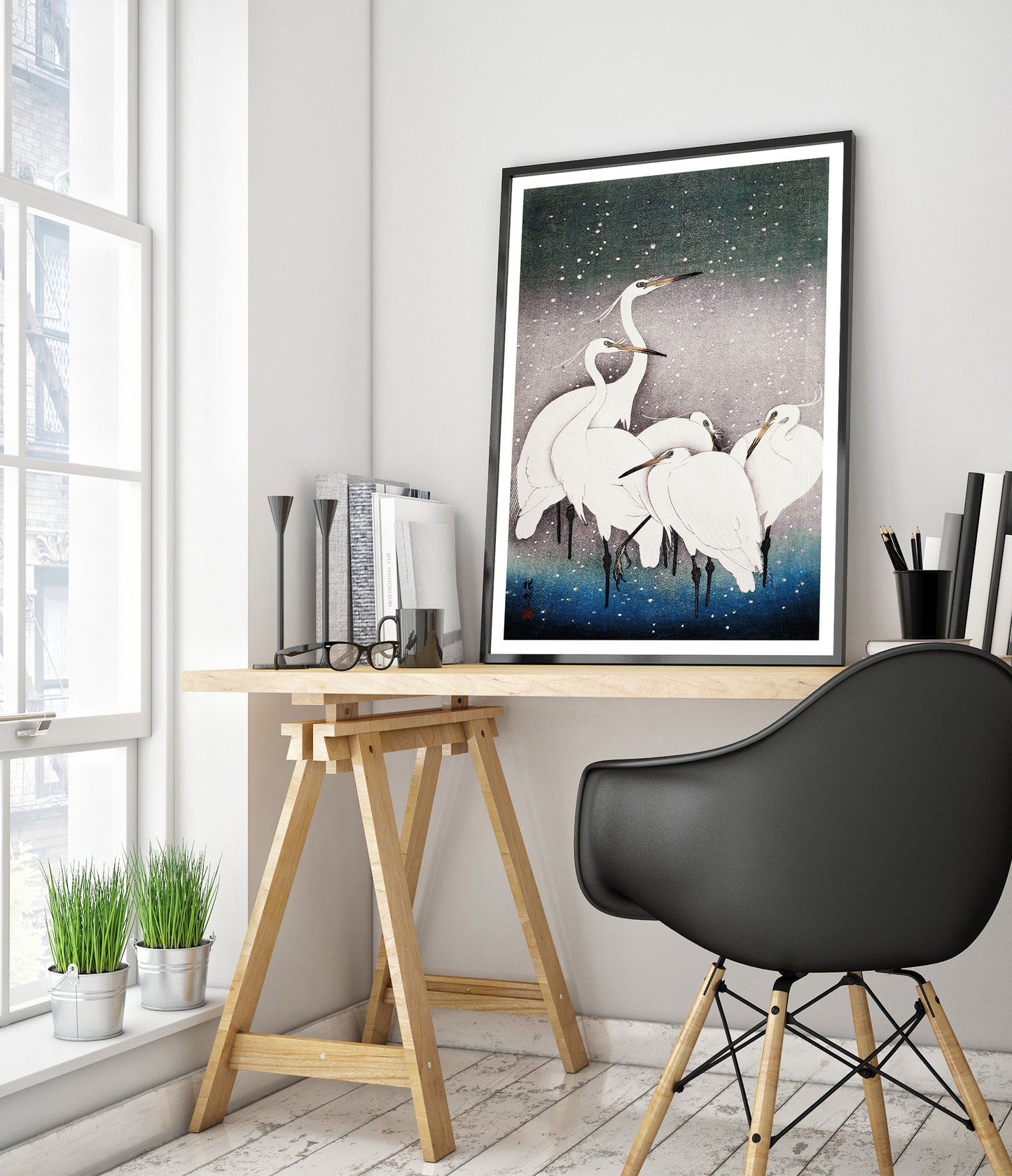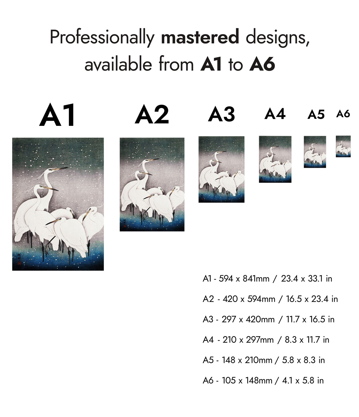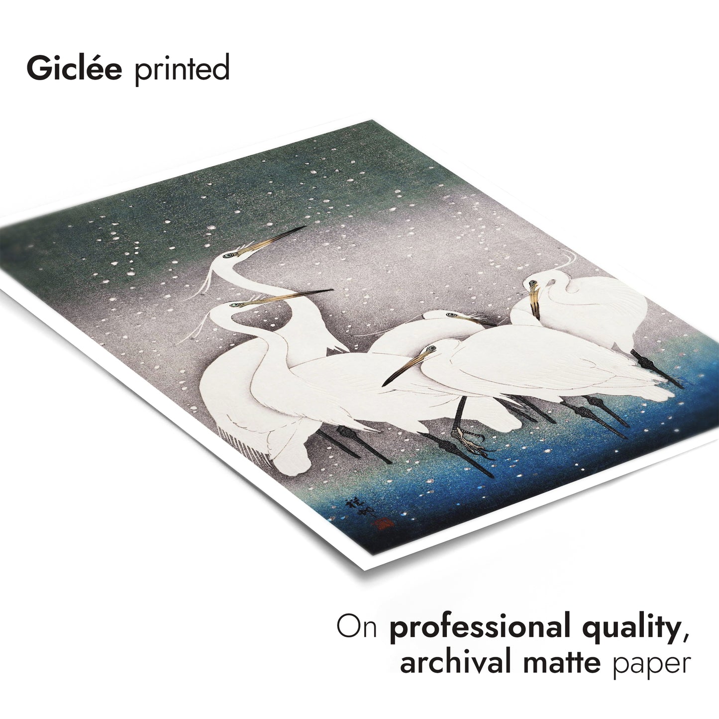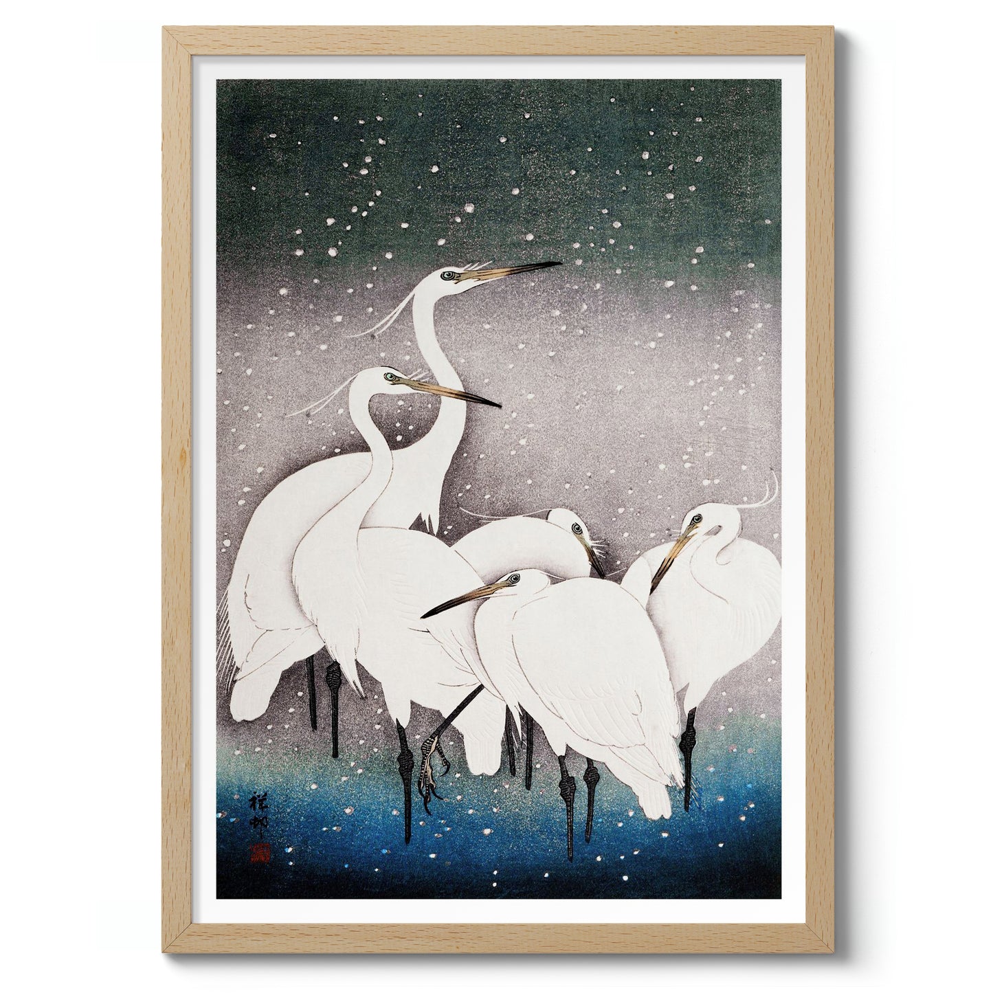 Ohara Koson's "Egrets in the Snow" poster beautifully captures a serene winter scene with elegant white egrets set against a softly falling snow backdrop. The traditional woodblock style enhances the delicate portrayal, with a gradient of white, blue, and grey hues evoking a peaceful, wintry atmosphere. Perfect for admirers of ukiyo-e and nature-themed art.