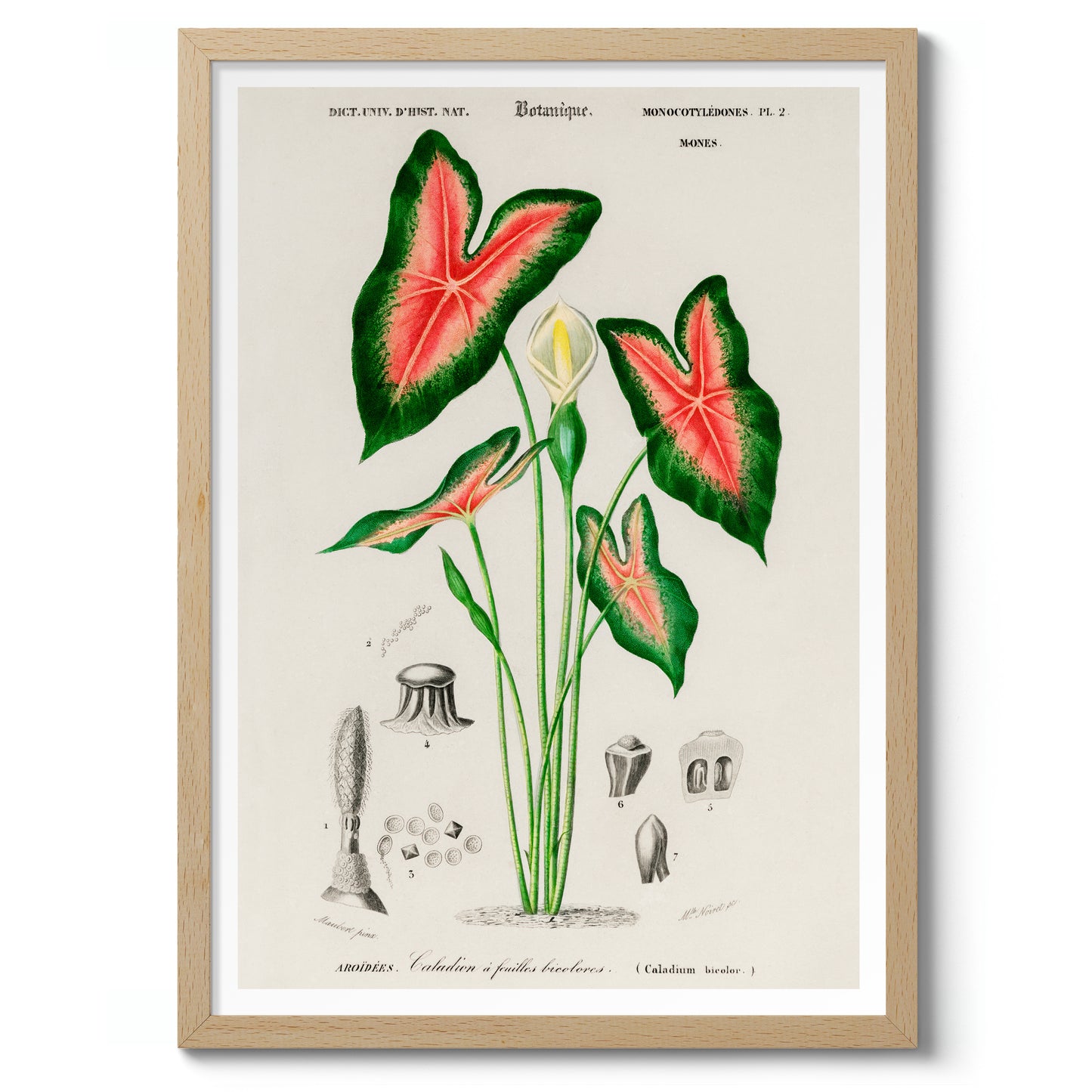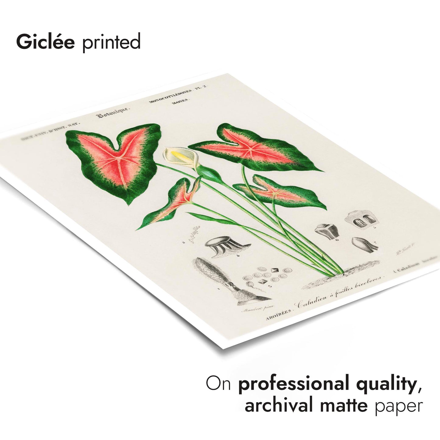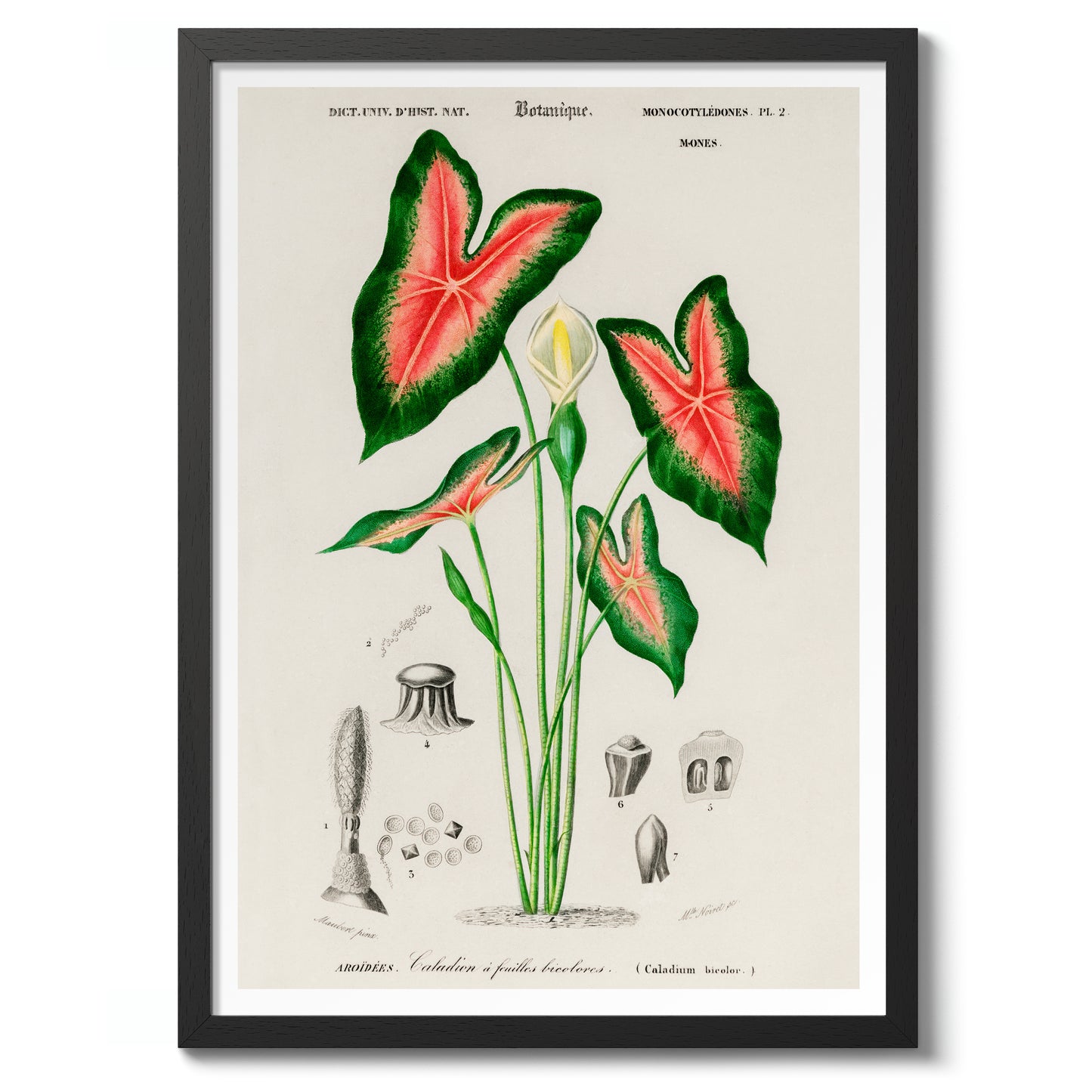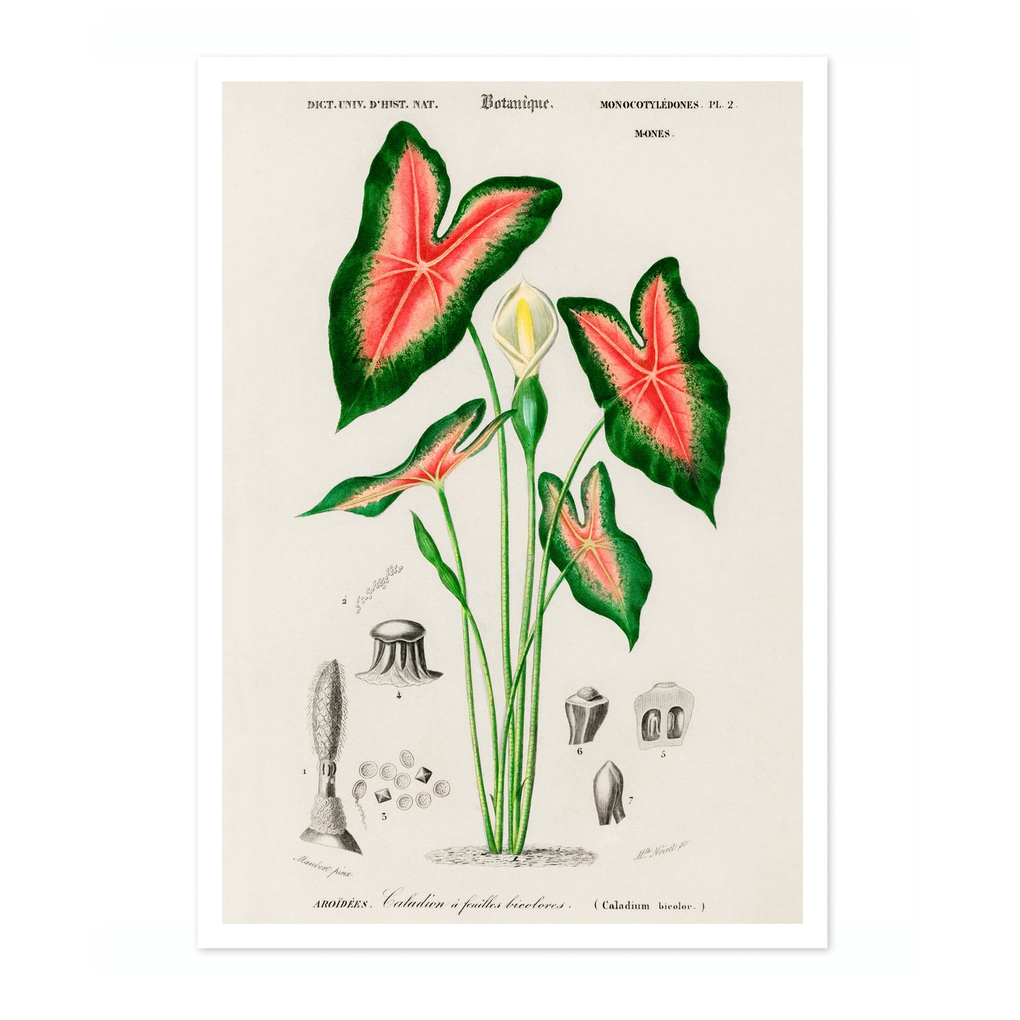 This vintage botanical poster titled "Elephant Ears" by Charles D'Orbigny depicts the intricate details of Caladium bicolour. Featuring vibrant green leaves with striking red veining, the classic illustration style highlights the plant's natural beauty. Perfect for nature enthusiasts, this botanical print brings a touch of timeless elegance to any space. Ideal for those seeking vintage, plant-themed wall art.