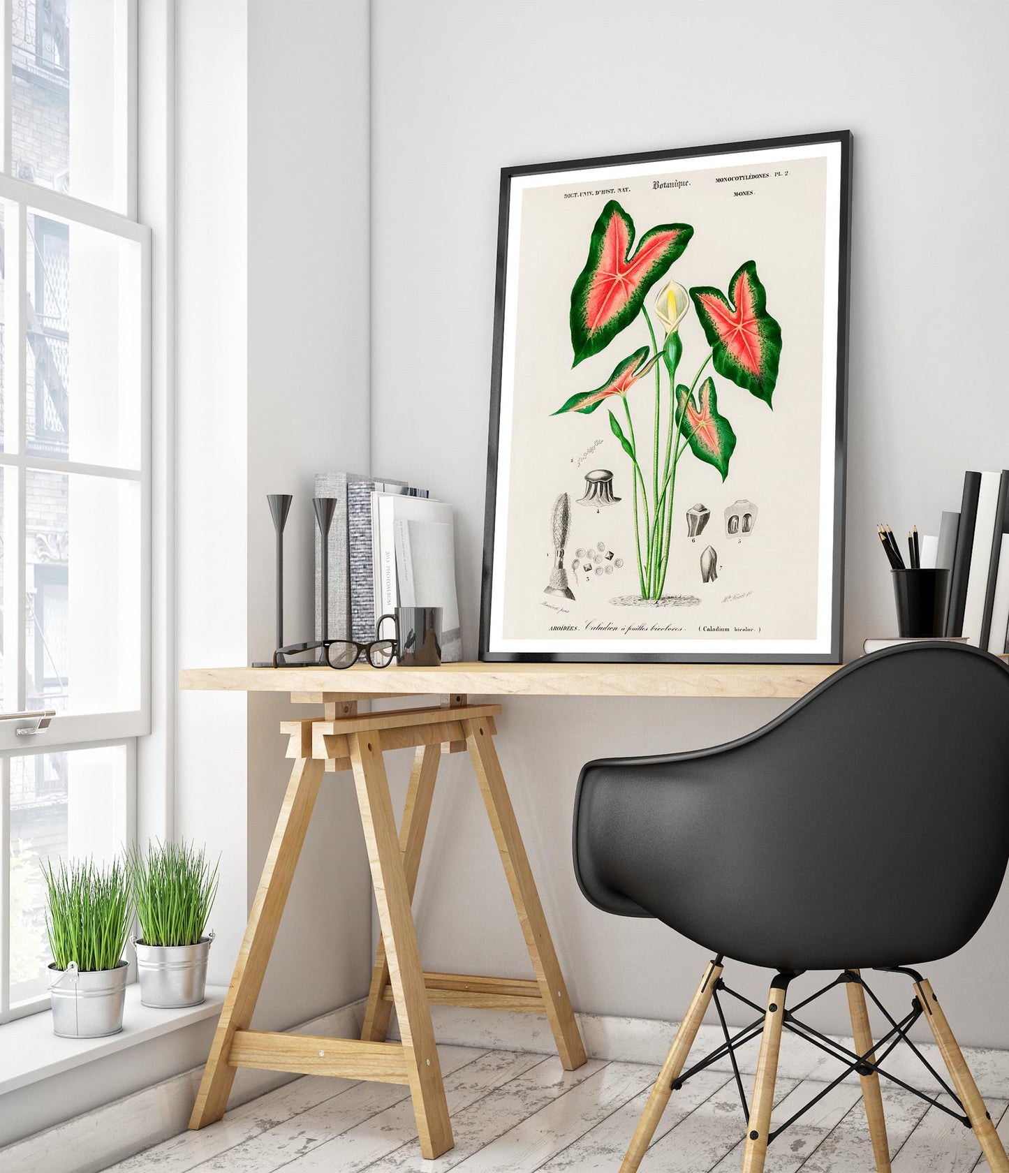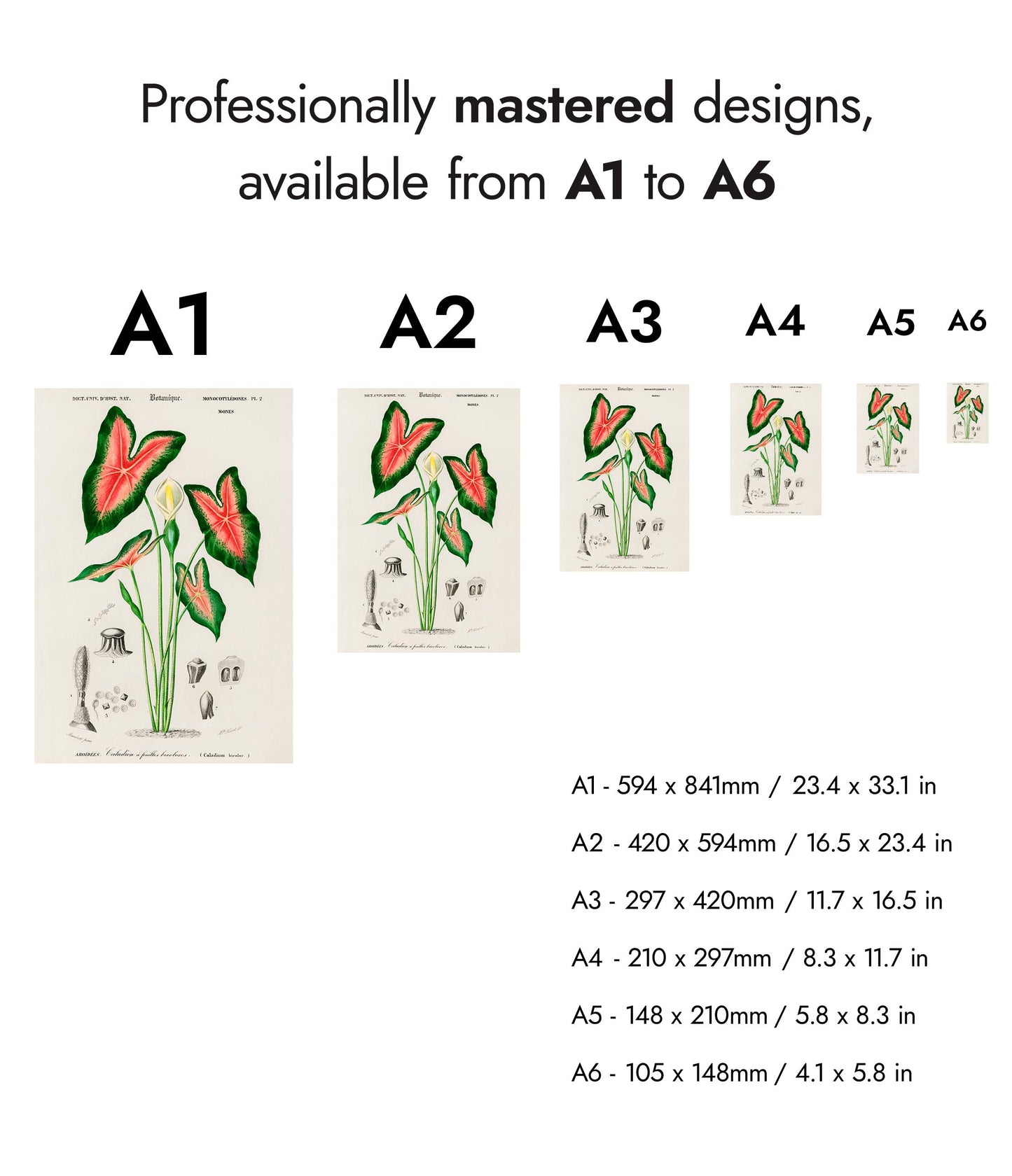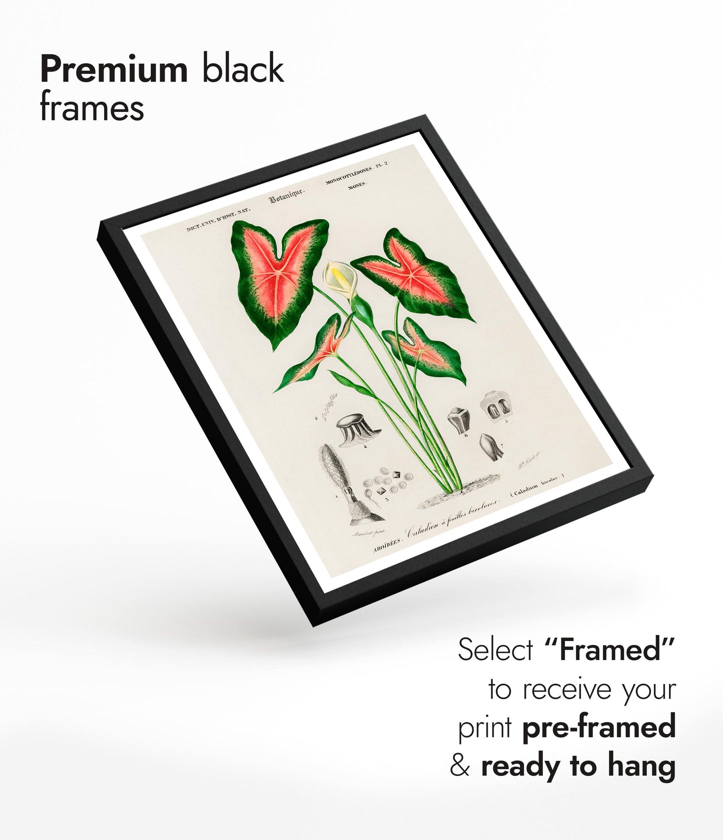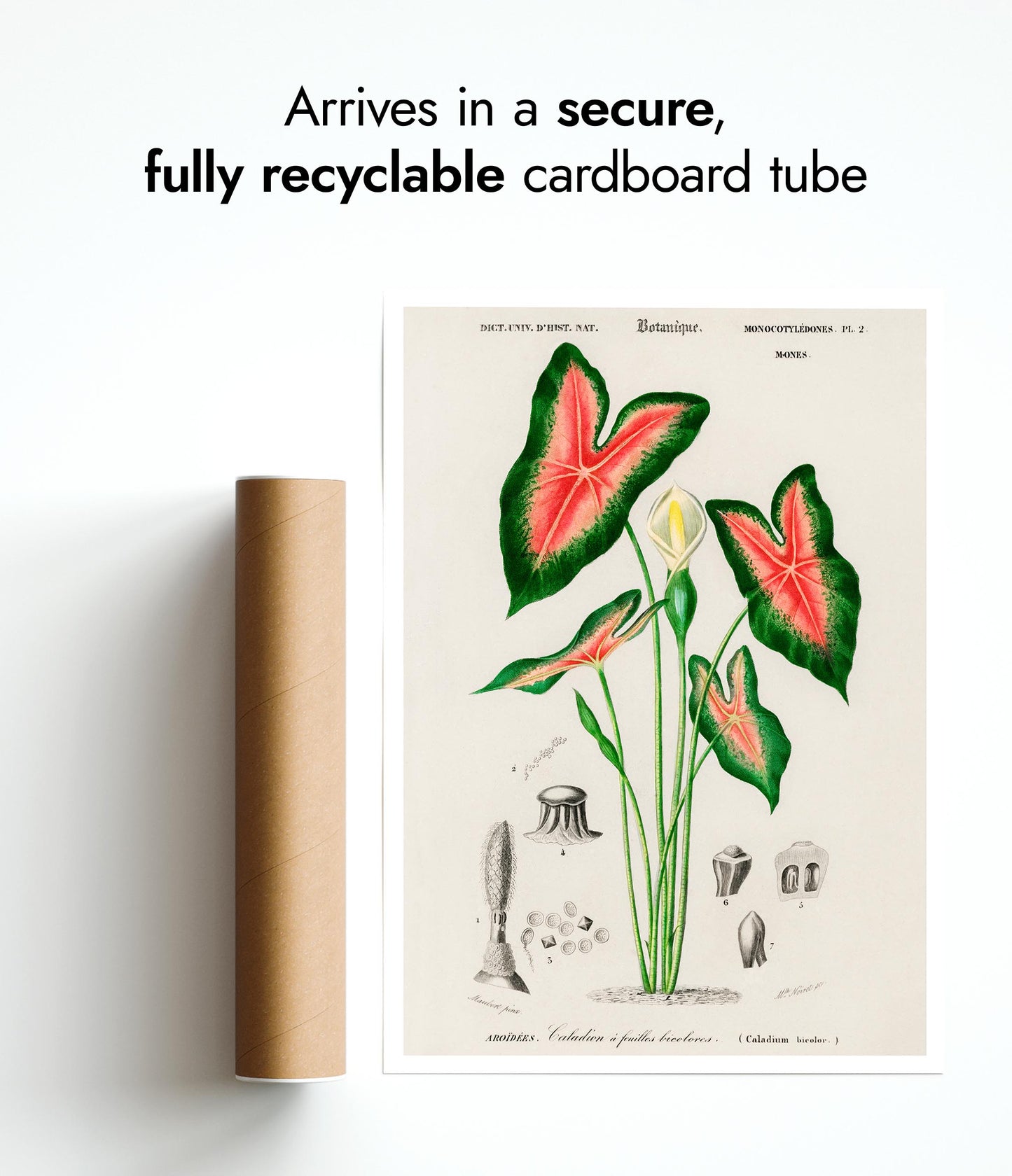 This vintage botanical poster titled "Elephant Ears" by Charles D'Orbigny depicts the intricate details of Caladium bicolour. Featuring vibrant green leaves with striking red veining, the classic illustration style highlights the plant's natural beauty. Perfect for nature enthusiasts, this botanical print brings a touch of timeless elegance to any space. Ideal for those seeking vintage, plant-themed wall art.