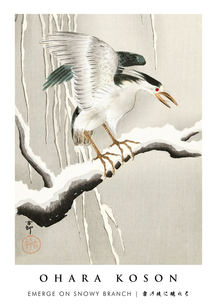 "Emerge on Snowy Branch" by Ohara Koson is a traditional Japanese woodblock print poster featuring a bird perched delicately on a snow-covered branch. This artwork beautifully captures the serene and natural essence of winter, highlighting the intricate detail and elegance typical of Ukiyo-E style. Perfect for nature and animal enthusiasts.