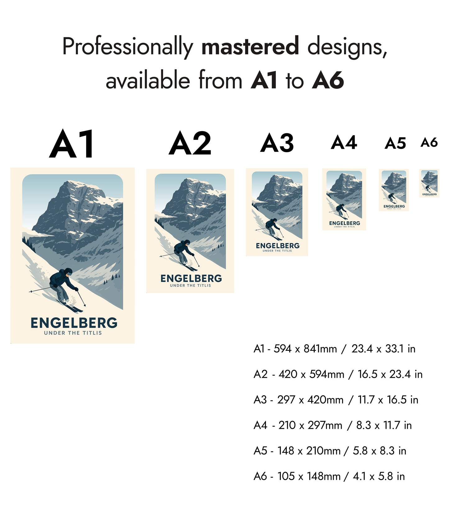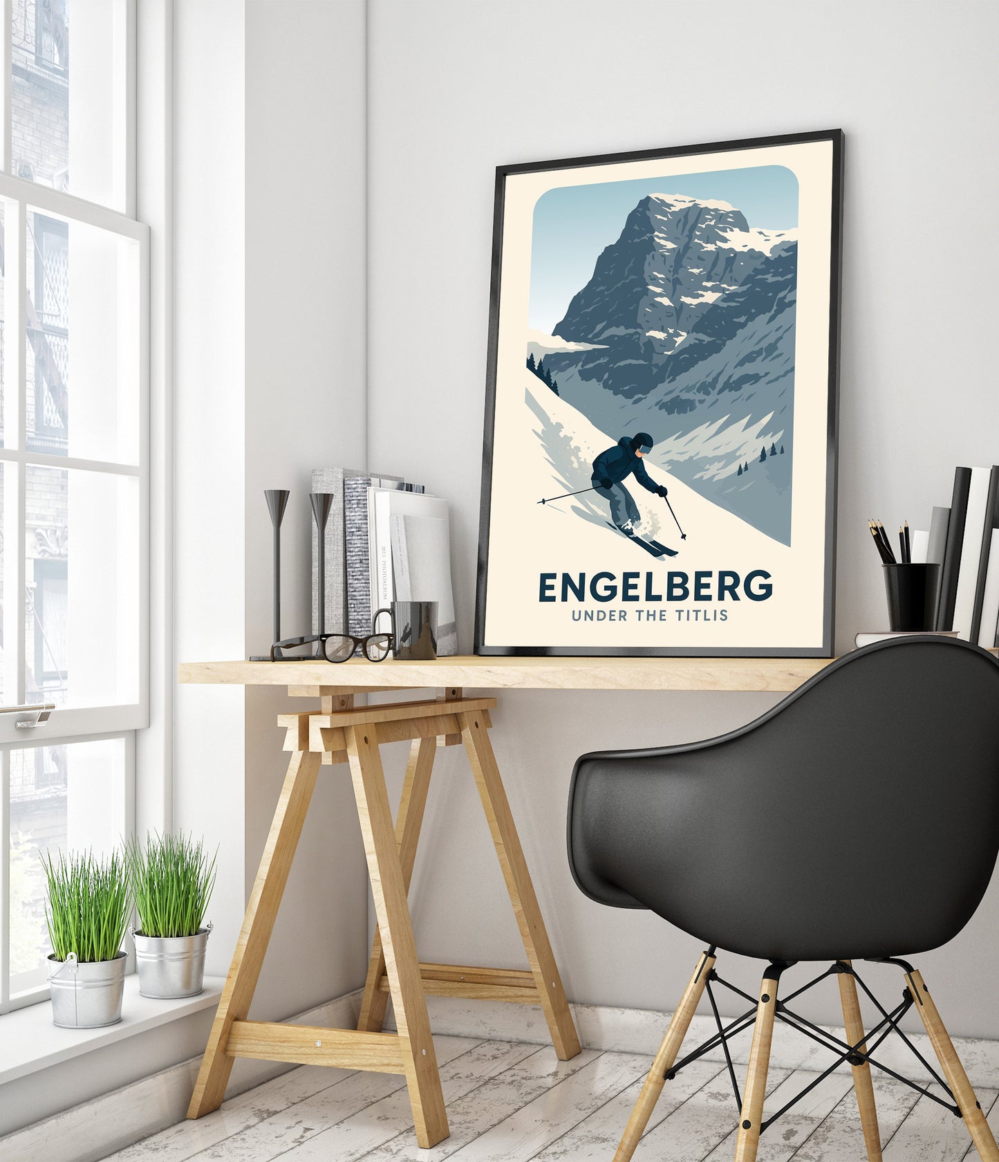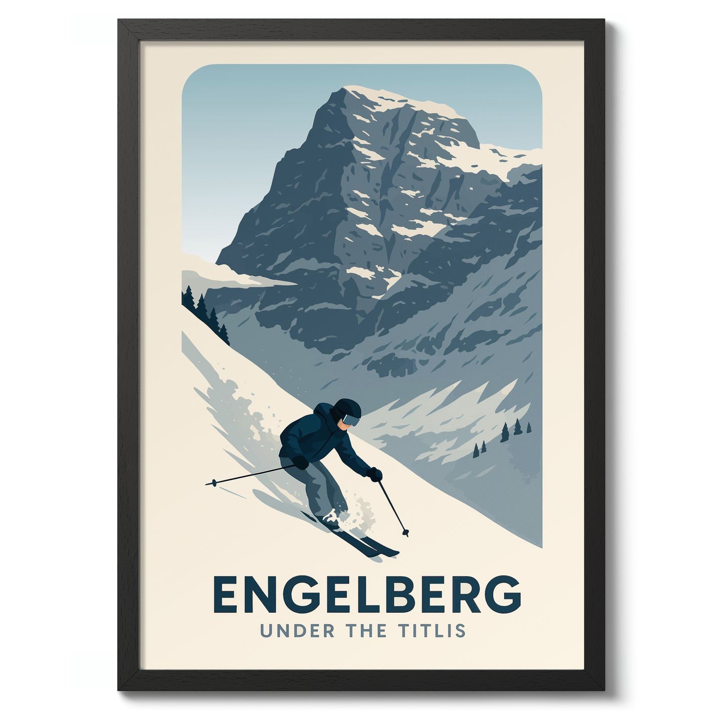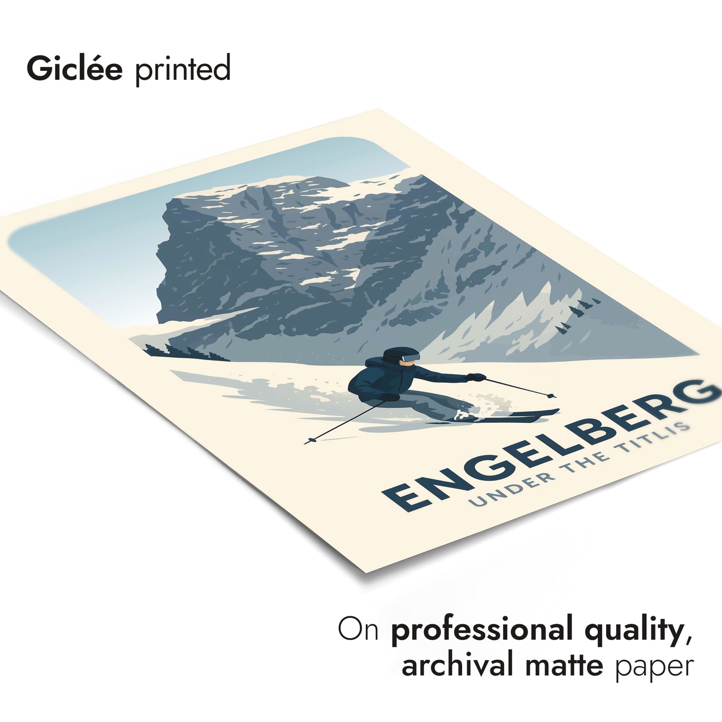 This Engelberg poster captures the thrilling descent of a skier navigating the snowy slopes under the majestic Titlis mountain. Its graphic style brings a modern touch to the classic alpine adventure, showcasing Switzerland's winter sports allure. Perfect for ski enthusiasts and mountain lovers, this art print beautifully encapsulates the dynamic spirit of Engelberg's pristine landscape.