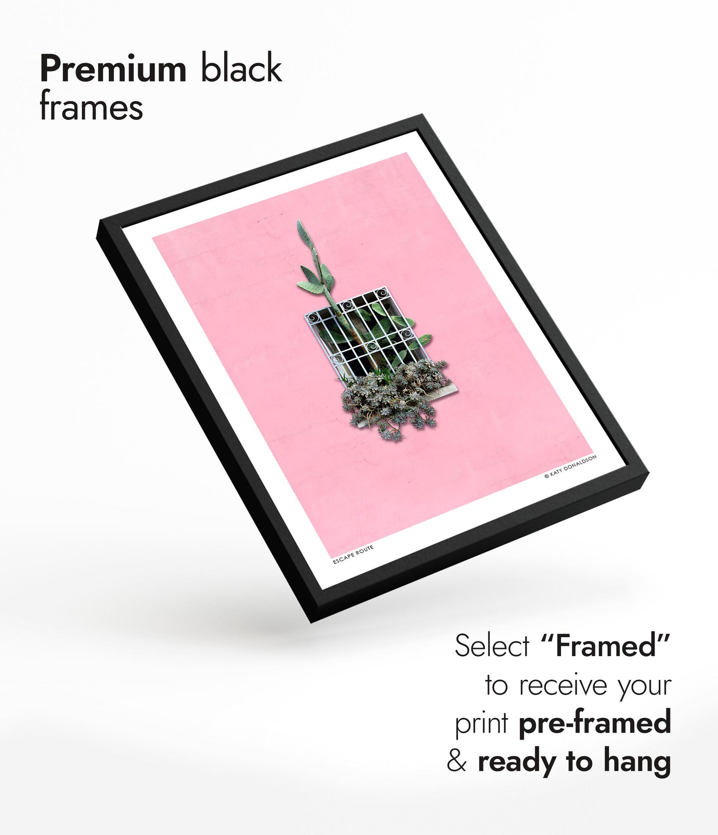 Solid wood frames available in black stained or natural finishes, with UV resistant acrylic glass. Framed orders arrive pre-installed with your choice of print, ready to hang. Available in all print sizes.