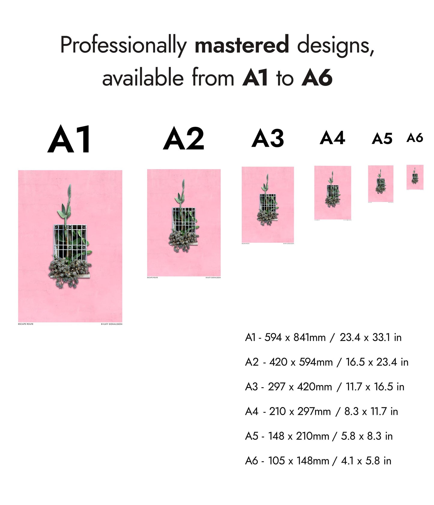 8 colour giclée print process on high-quality 230gsm archival matte paper. All our paper is FSC Certified and prints come with a lifetime fade-resistance guarantee.