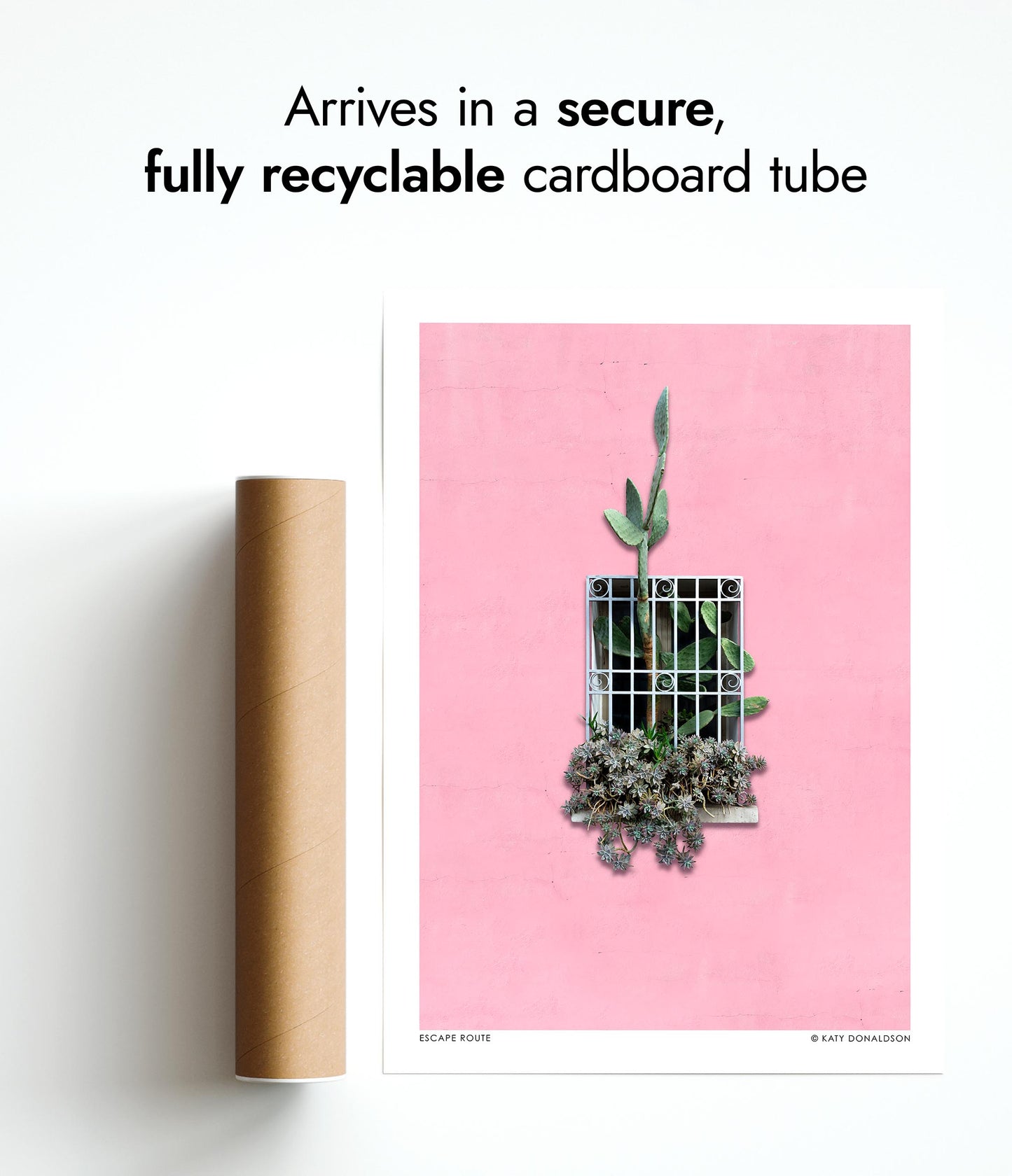 All orders are securely packed in recyclable, eco-friendly solutions. Frames are protected with sustainable bubble wrap alternatives inside thick boxes. Print only orders are shipped in heavy-duty cardboard tubes or protective hard-backed envelopes.