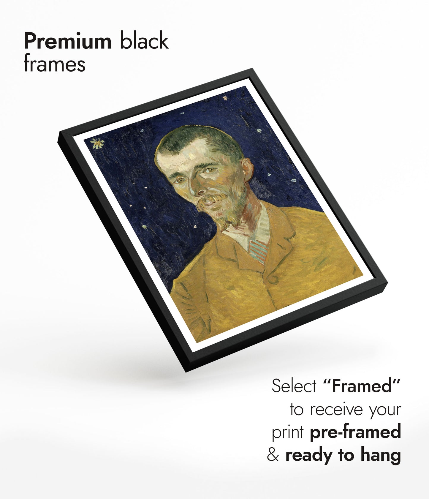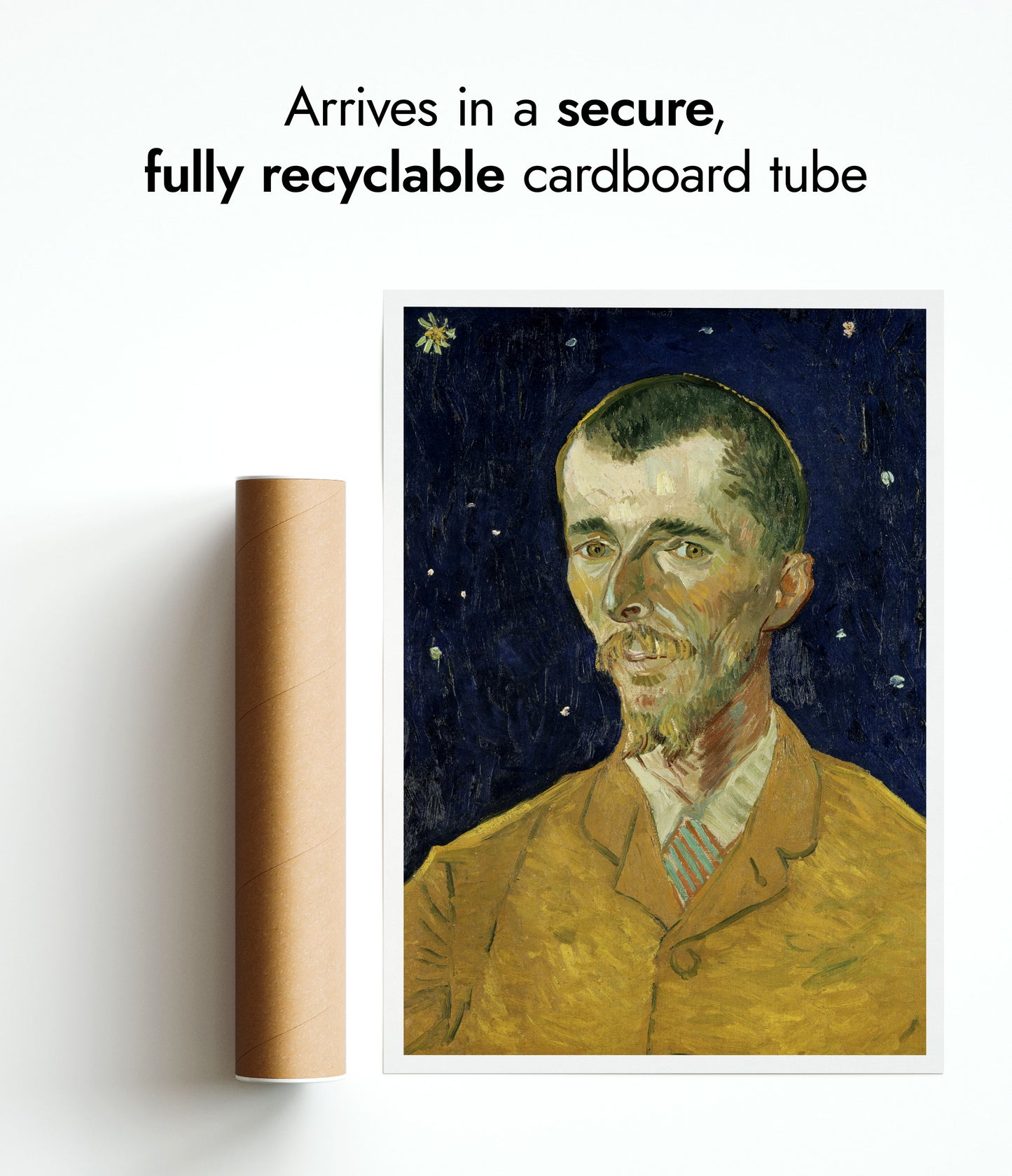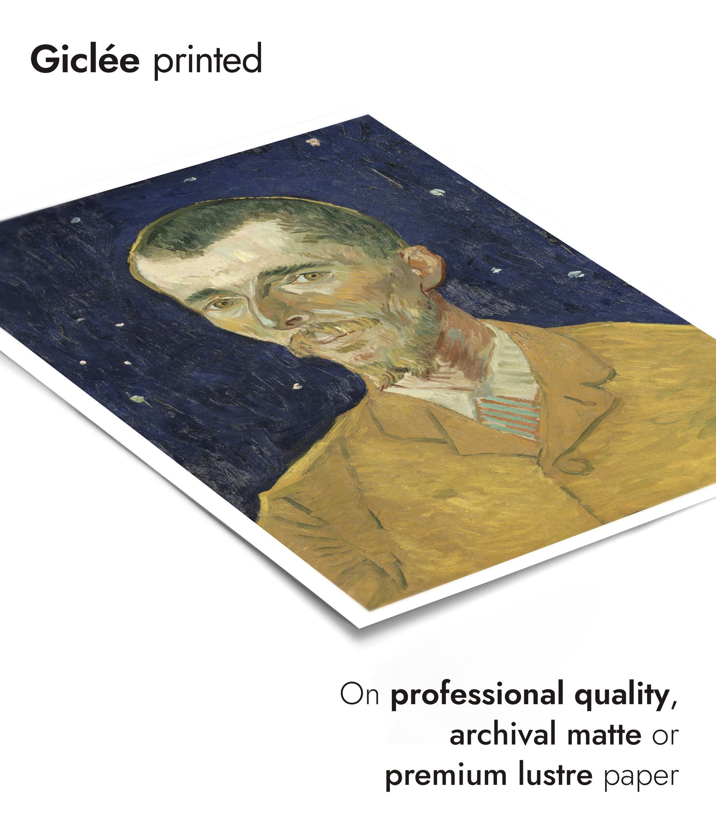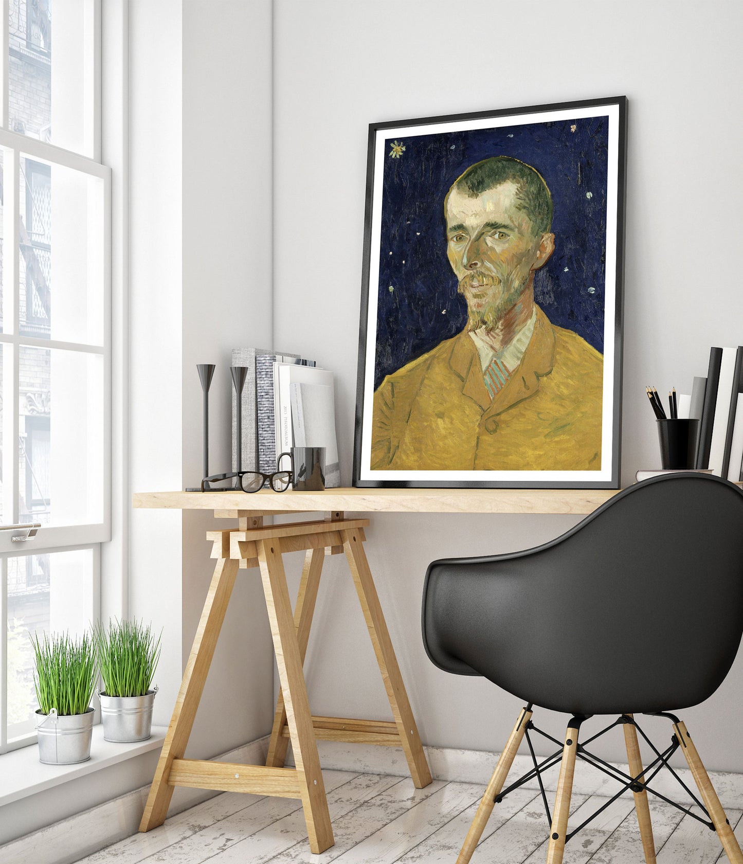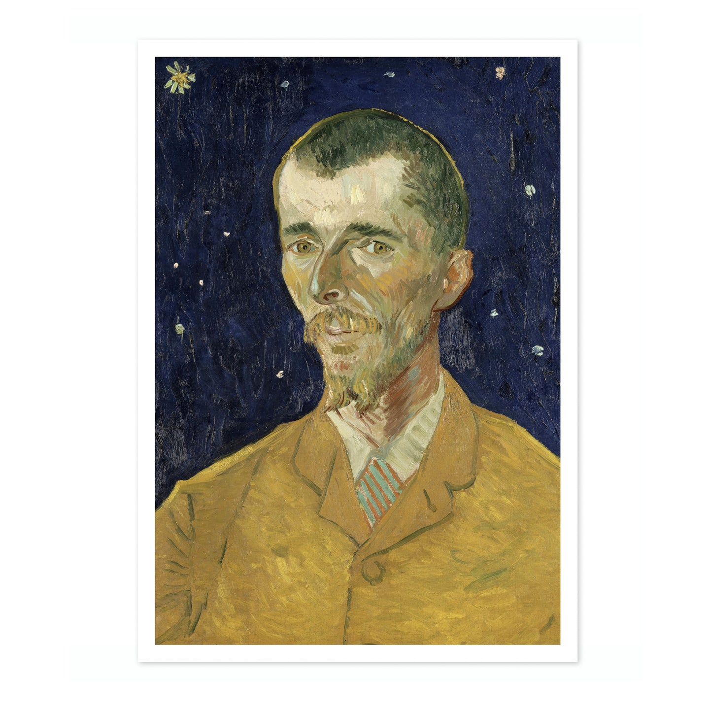 Experience the evocative Post-Impressionism of Vincent Van Gogh with the "Eugène Boch" portrait poster. The artwork, set against a deep blue night sky sprinkled with stars, showcases a contemplative man in rustic attire. Van Gogh’s distinctive style and textured brushstrokes capture the emotional depth and unique character of Eugène Boch in this striking portrait. Ideal for adding a touch of classic artistry to any space.