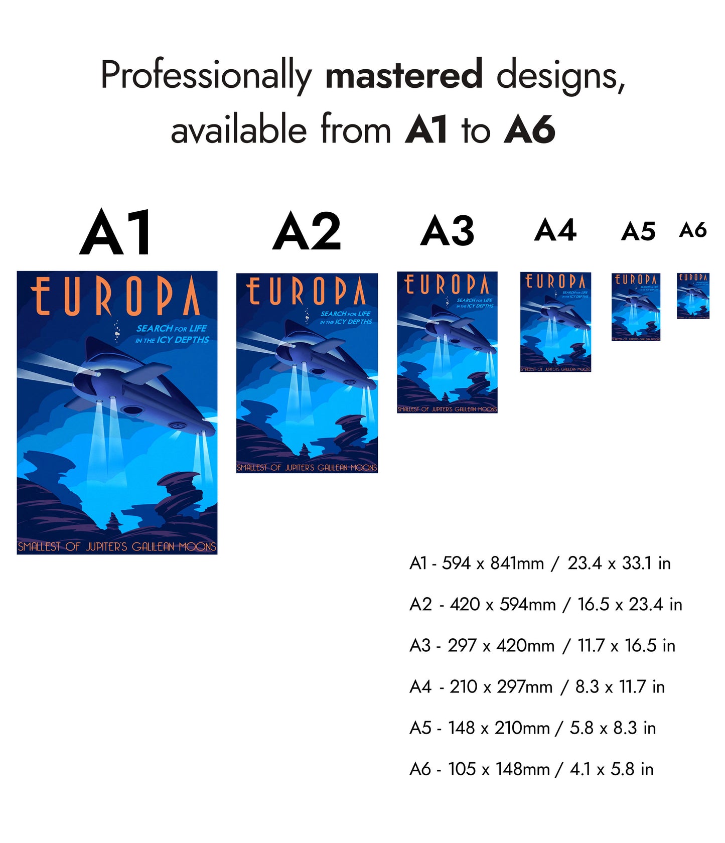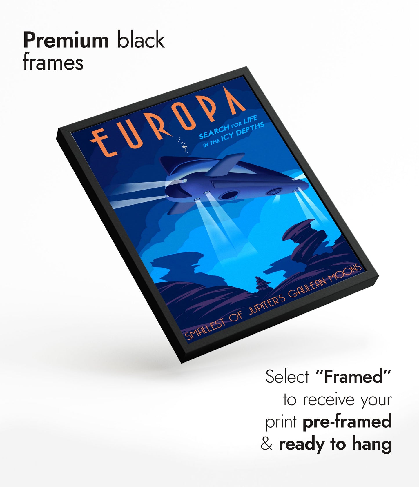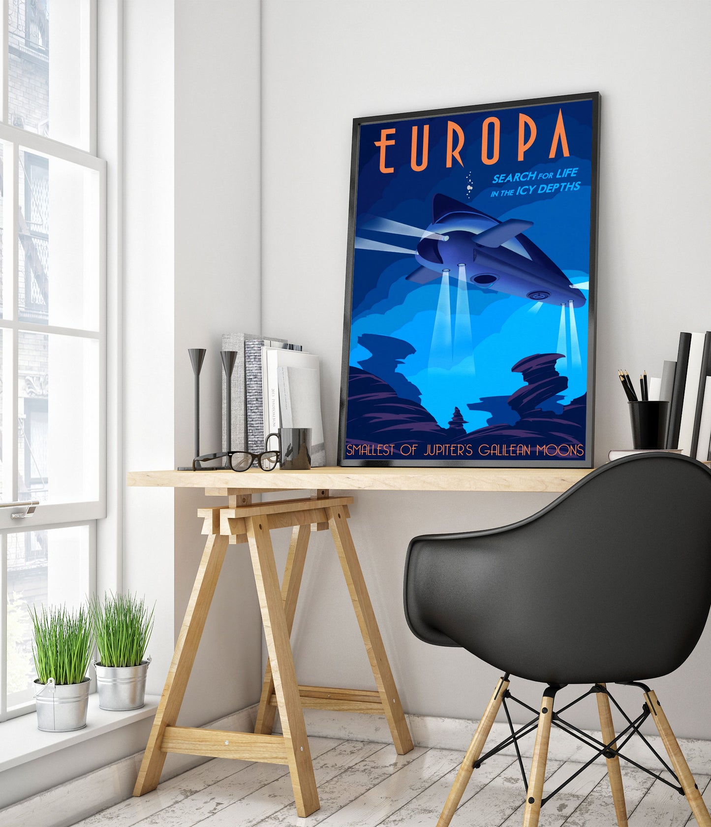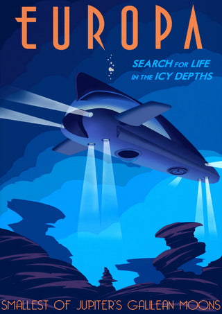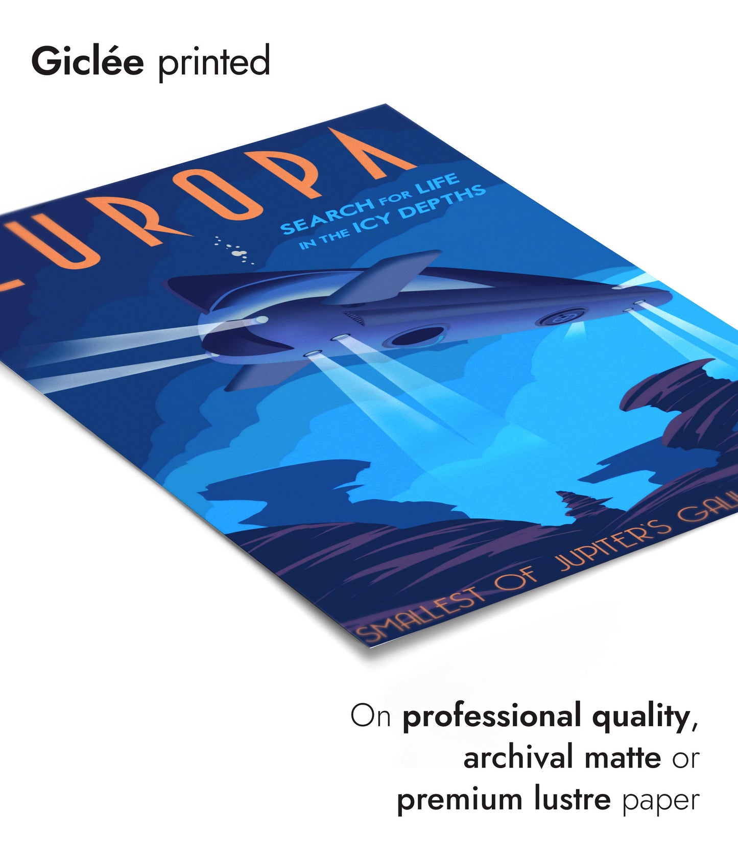 This vintage-inspired poster titled "Europa" showcases a futuristic spacecraft exploring the icy depths of Jupiter's smallest Galilean moon. The striking illustration highlights bold blues and towering rock formations, evoking a sense of adventure and discovery. Ideal for sci-fi and space art enthusiasts, this graphic poster beautifully captures the blend of fantasy and scientific curiosity.