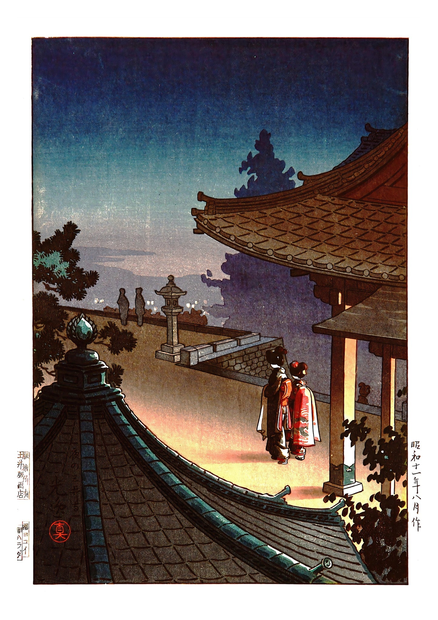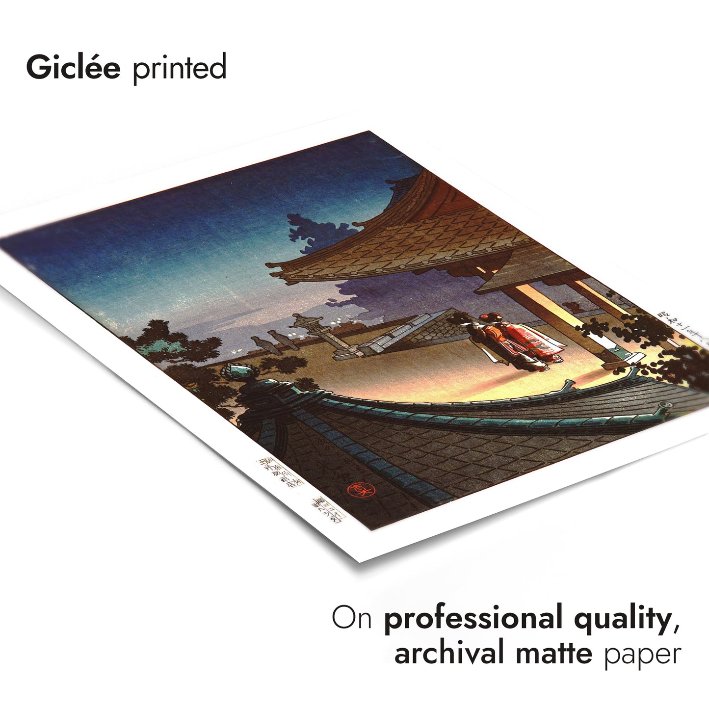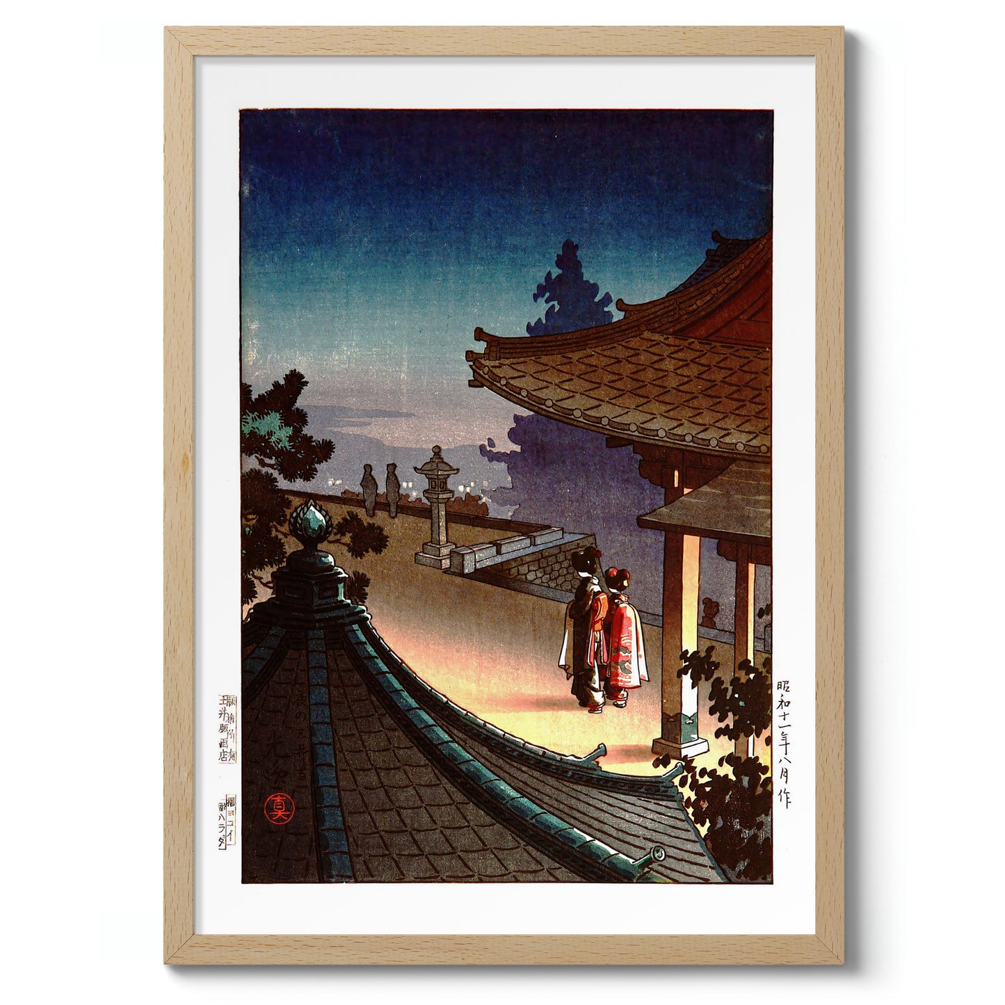 "Evening at Miidera Temple, Otsu" by Tsuchiya Koitsu is a stunning 1936 woodblock print poster capturing the serene ambiance of a Japanese temple as dusk falls. Featuring traditional architecture, the scene showcases figures in kimono under a twilight sky. The harmonious brown, blue, and beige tones emphasize the tranquil beauty of this classic Shin-Hanga artwork.