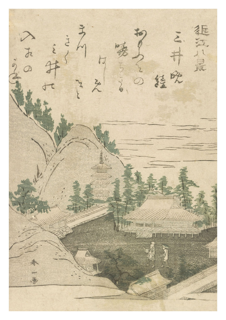 "Evening Bell at Mii Temple" by Katsukawa Shunzan is a traditional Japanese woodblock print capturing a serene temple scene. The detailed illustration features a pagoda, tranquil lake, and surrounding mountains and trees, framed against a clear, open sky. This classical ukiyo-e poster epitomizes the timeless beauty of Japanese art while offering a peaceful, historical ambiance. Perfect for enthusiasts of traditional Japanese imagery.