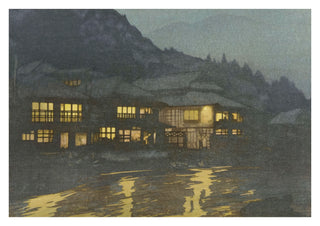 "Evening in a Hot Spring" poster by Hiroshi Yoshida captures a serene Japanese village illuminated by soft, glowing lights reflecting on the river. This traditional woodblock landscape masterfully portrays the tranquil ambiance of a night-time hot spring, nestled at the foot of dark, misty mountains. Ideal for those appreciating Ukiyo-e style illustrations and Japanese cultural themes.