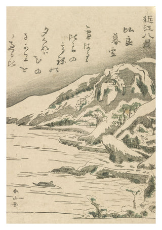 The "Evening Snow at Hira" art print by Katsukawa Shunzan beautifully captures a tranquil winter scene with snow-covered mountains and a serene lake. This traditional woodblock print features delicate brushwork and subtle hues, creating a harmonious landscape. Ideal for lovers of Ukiyo-e and Japanese art, this poster adds a touch of elegance and cultural heritage to any space.